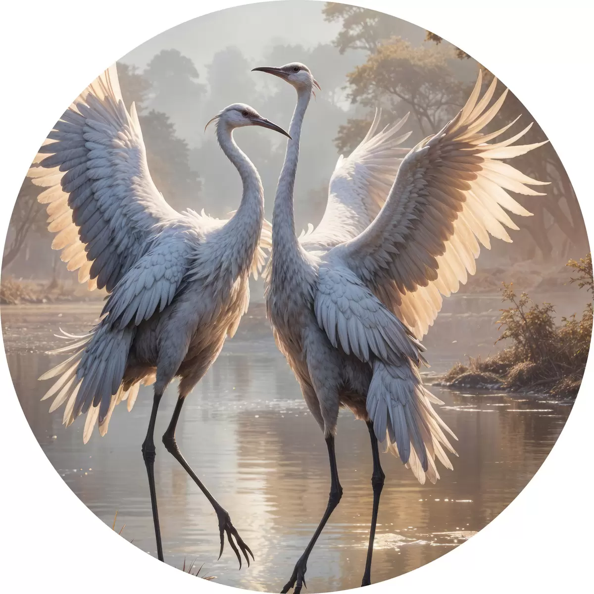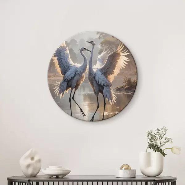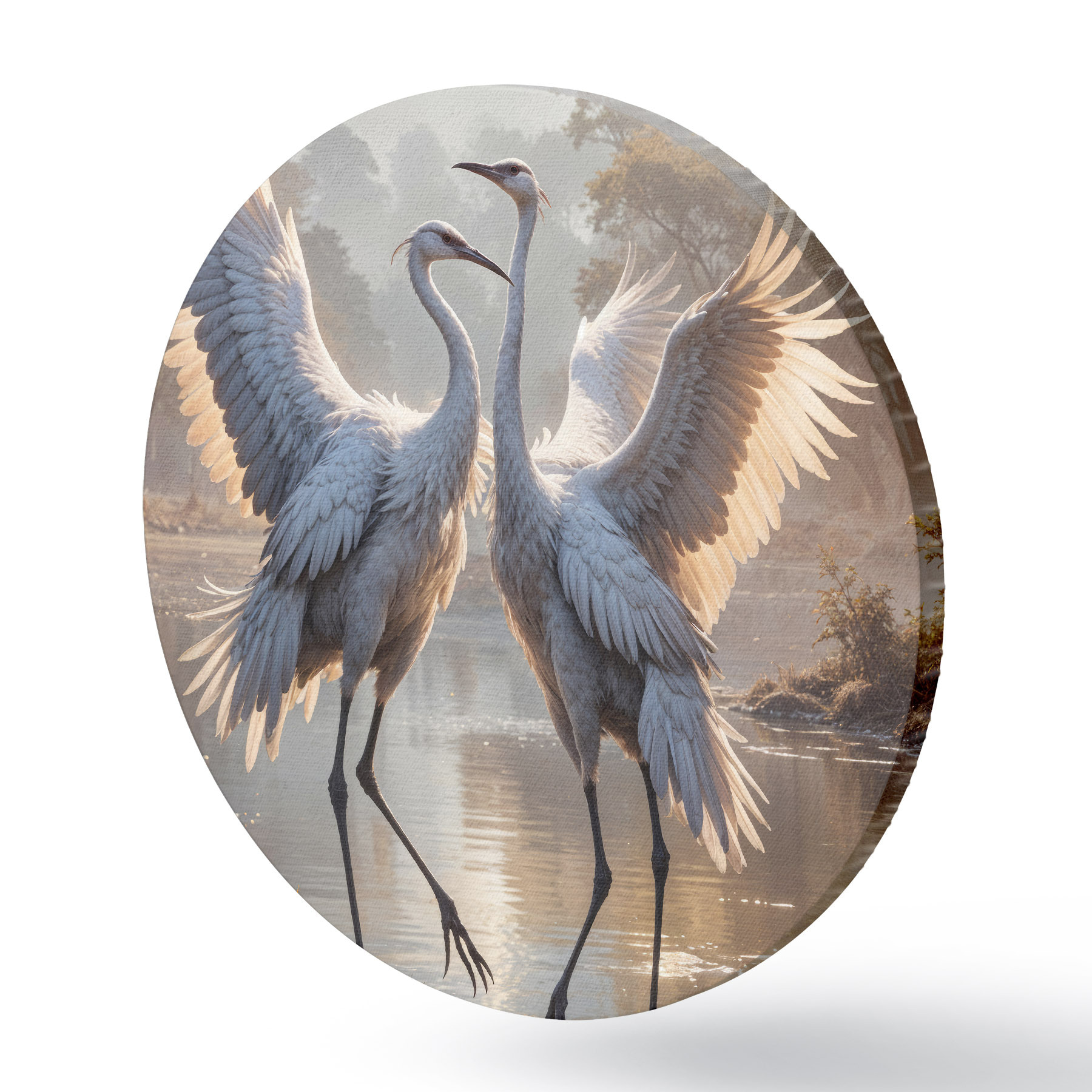 Apvalūs paveikslai Dvi didelės pilkos gervės ilgais kaklais ir išskleistais sparnais stovi ūkanotame ežere, apsuptame medžių r40404