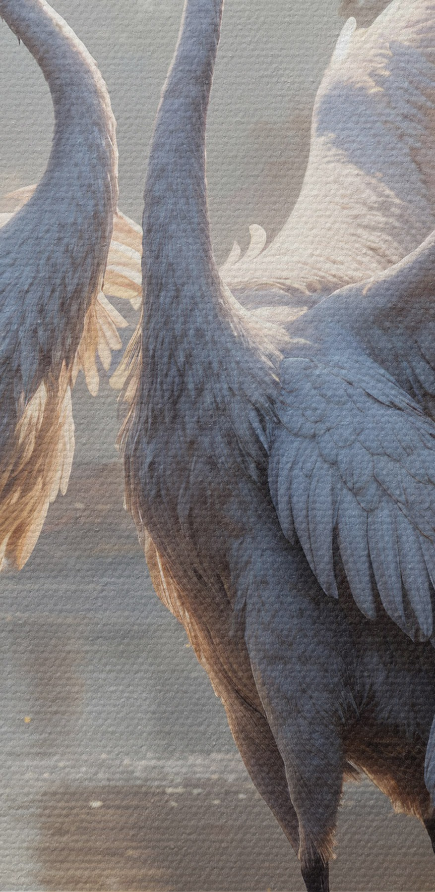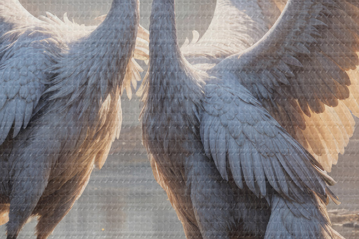 Nuotrauka Dvi didelės pilkos gervės ilgais kaklais ir išskleistais sparnais stovi ūkanotame ežere, apsuptame medžių Nr r40404