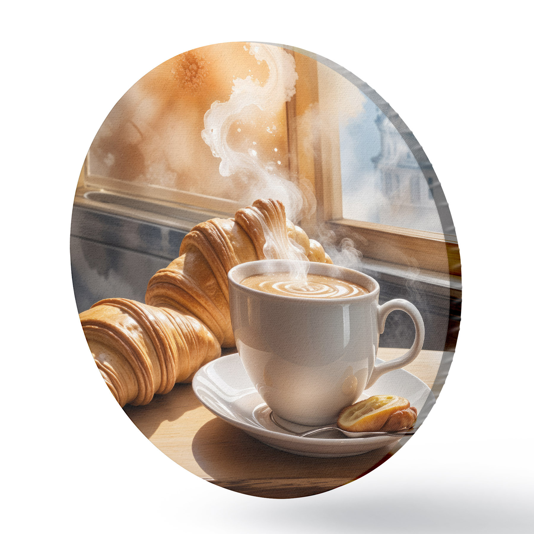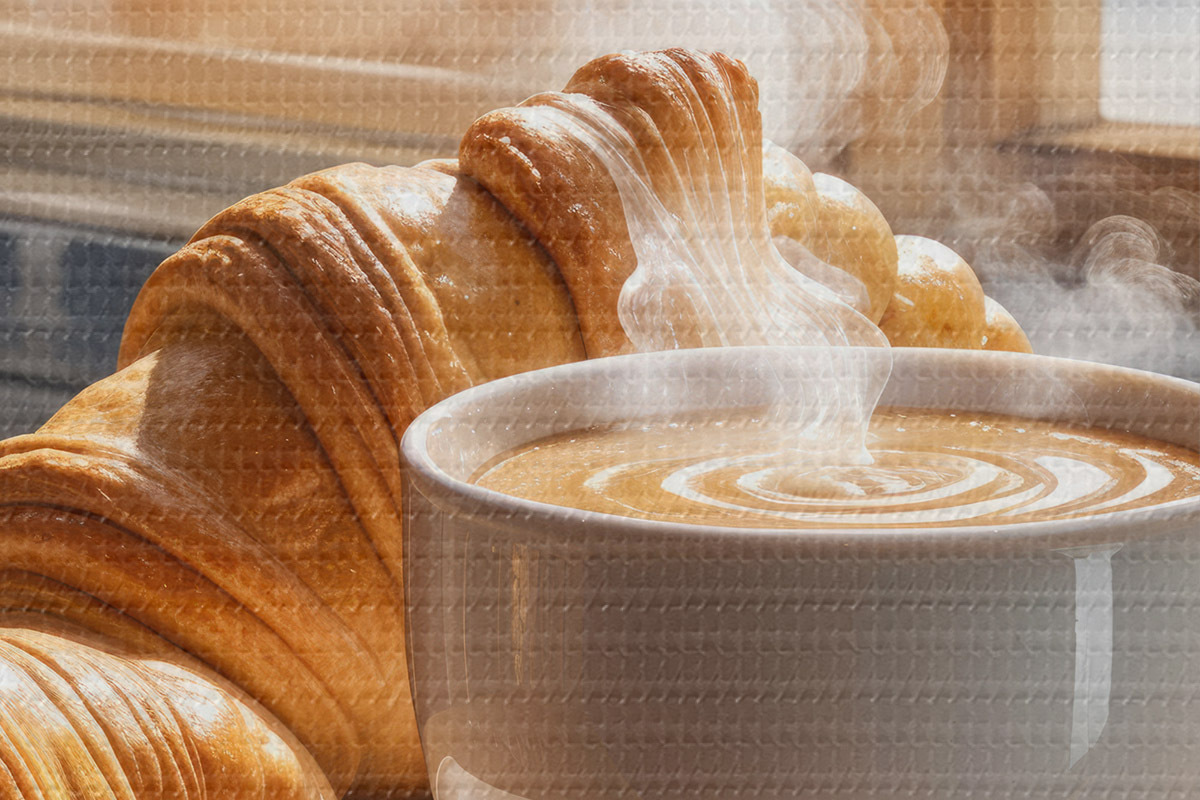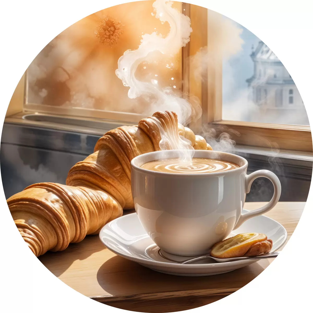 Nuotrauka Šiltas kavos puodelis su kylančiais garais, padėtas ant stalo šalia kruasano, su vaizdu į istorinį pastatą Nr r40405