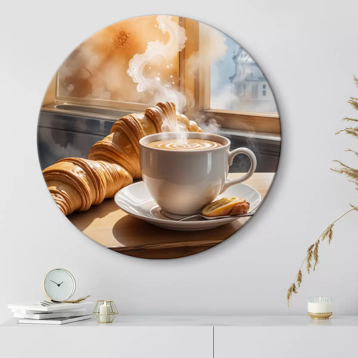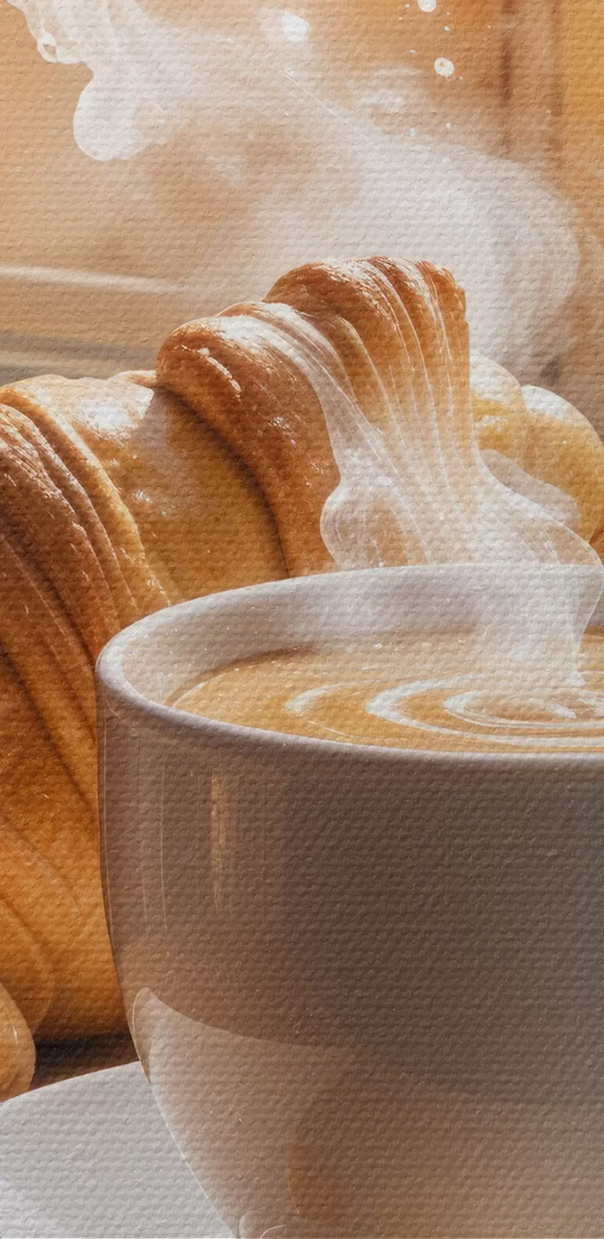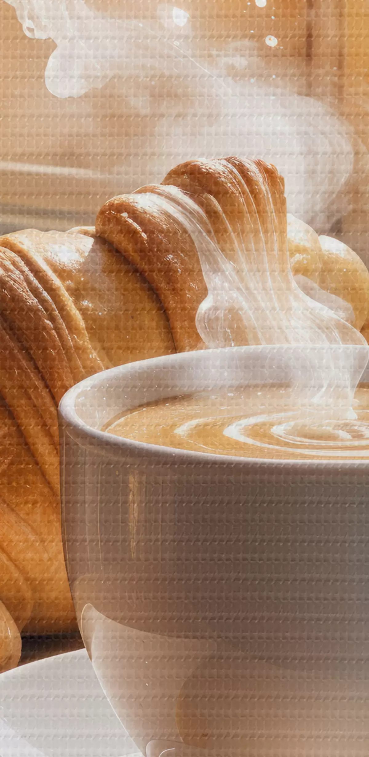 Nuotrauka Šiltas kavos puodelis su kylančiais garais, padėtas ant stalo šalia kruasano, su vaizdu į istorinį pastatą Nr r40405