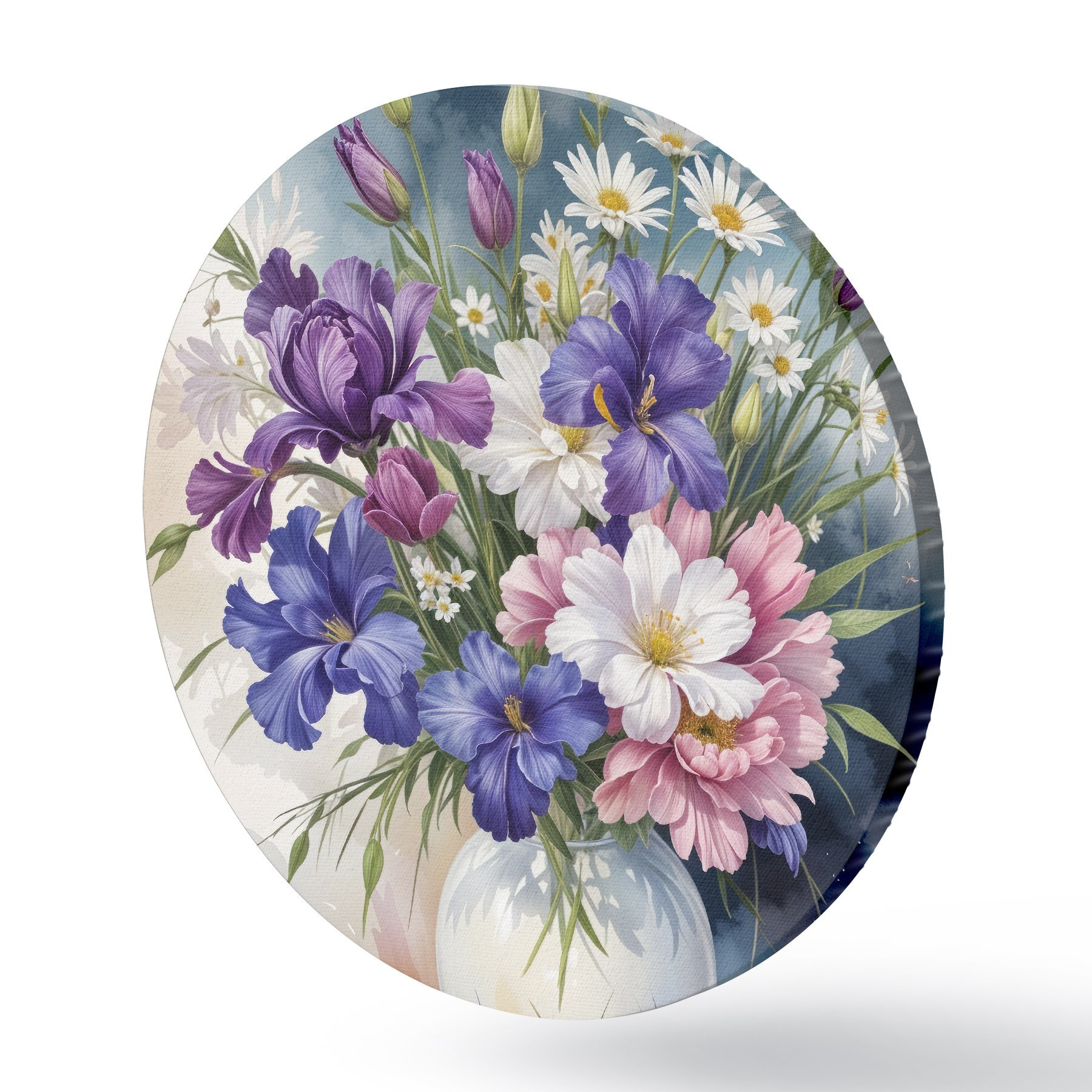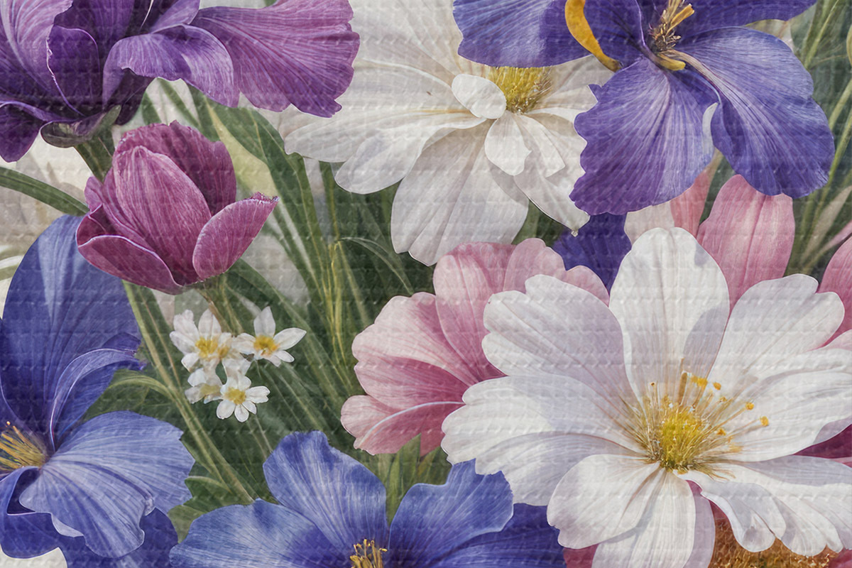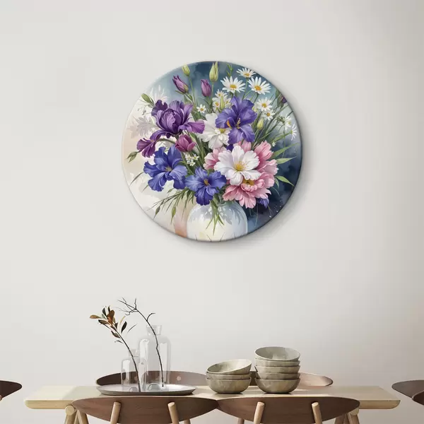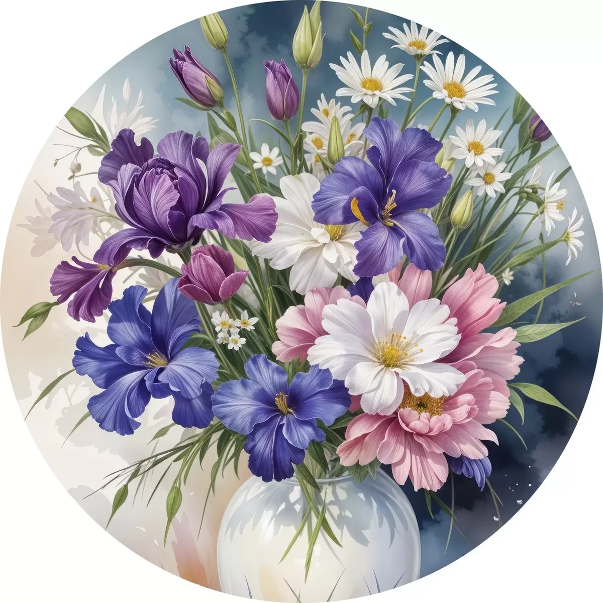 Nuotrauka Ryški spalvingų violetinių vilkdalgių, rožinių ramunėlių ir kitų žiedų puokštė, išdėstyta baltoje vazoje Nr r40407