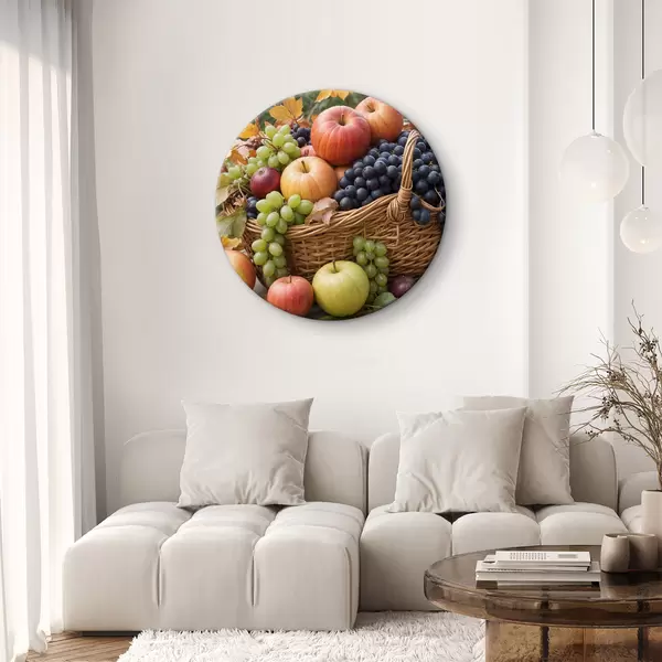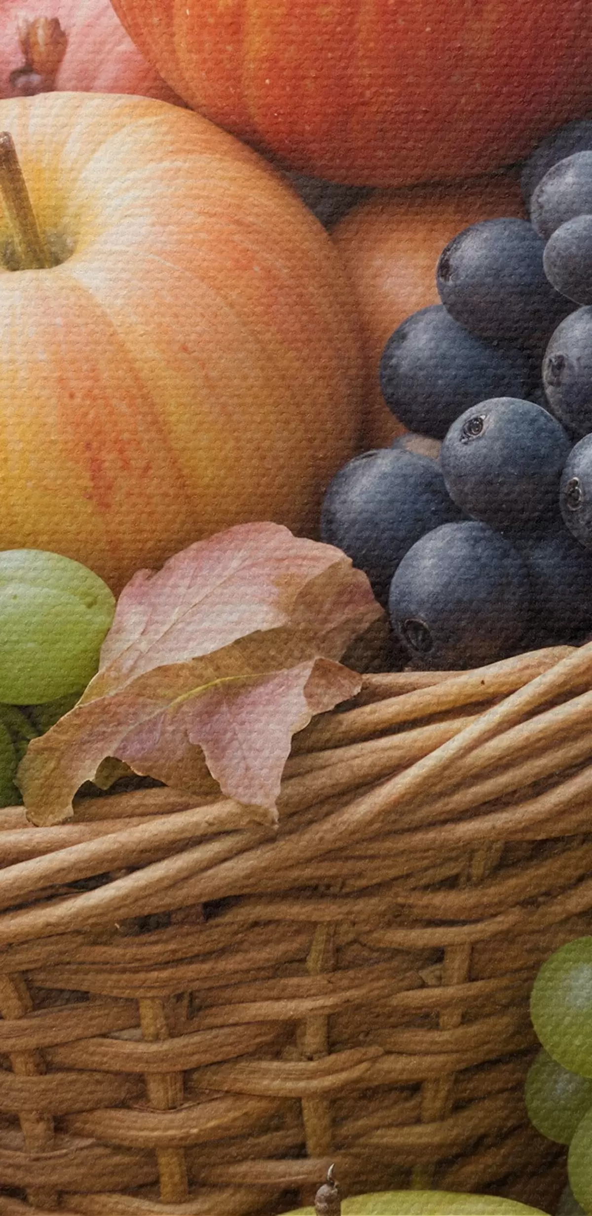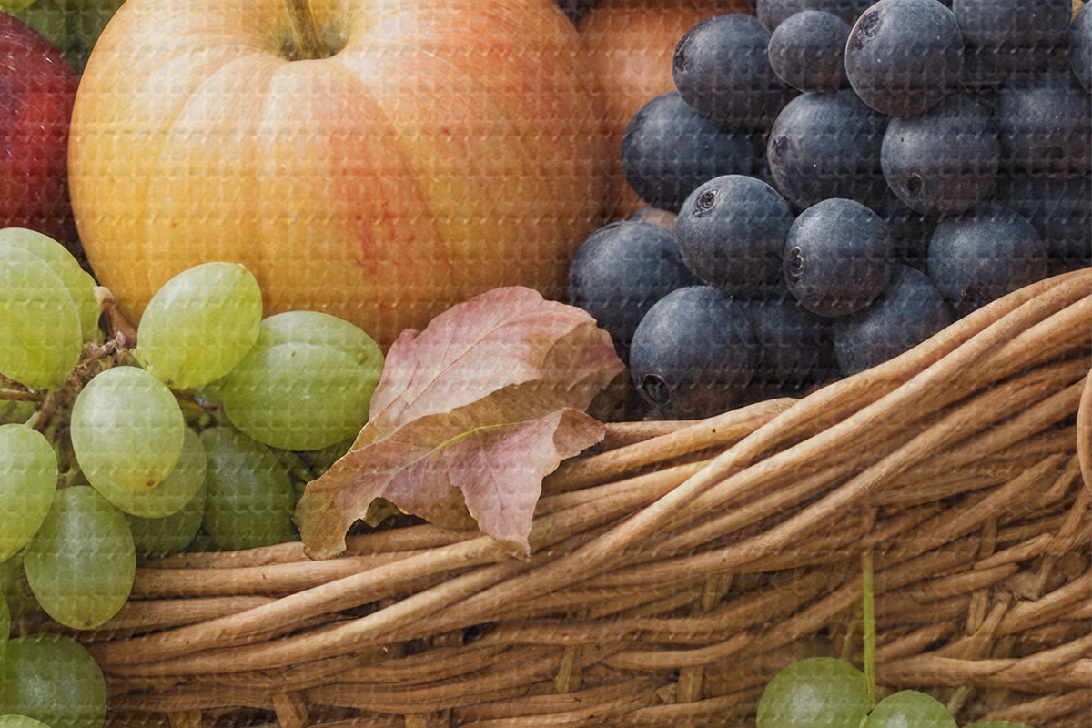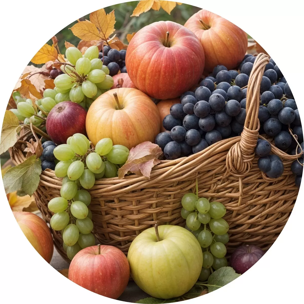 Nuotrauka Krepšelis, pripildytas įvairių rudens vaisių, įskaitant obuolius, vynuoges ir kriaušes, apsuptas nukritusių lapų Nr r40409
