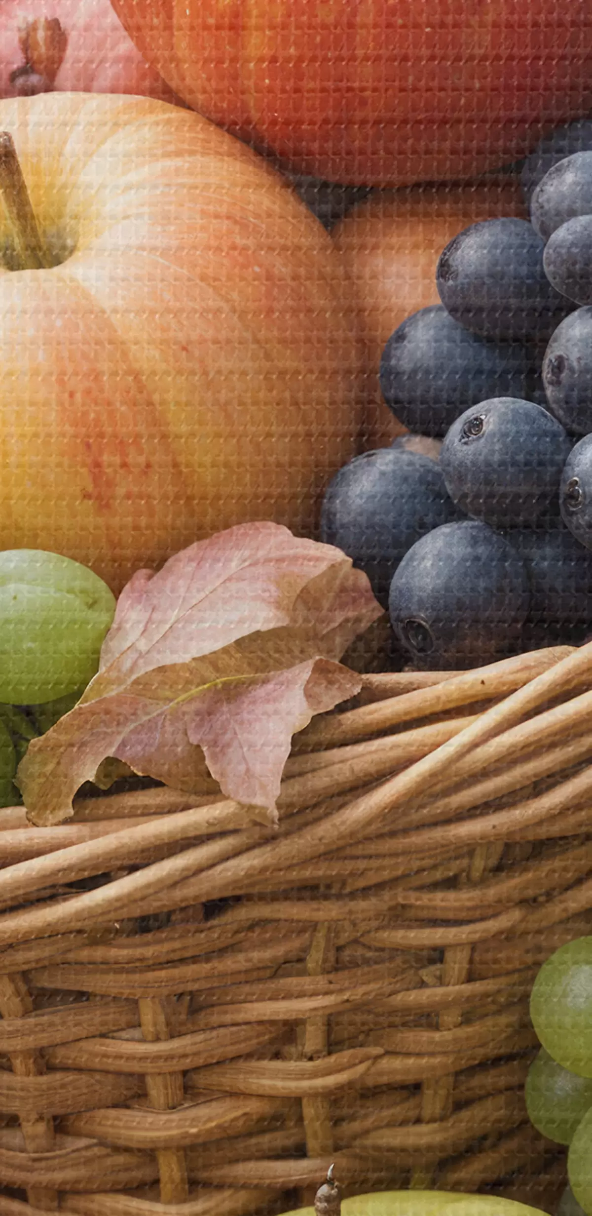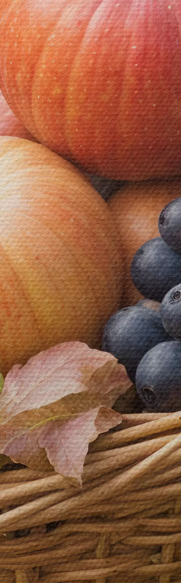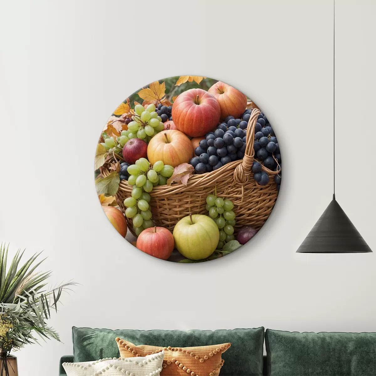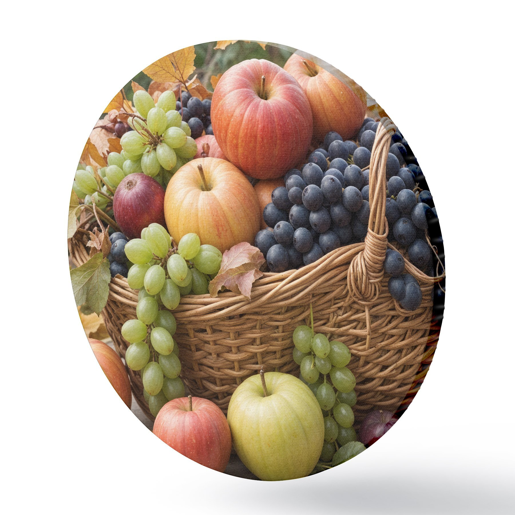 Nuotrauka Krepšelis, pripildytas įvairių rudens vaisių, įskaitant obuolius, vynuoges ir kriaušes, apsuptas nukritusių lapų Nr r40409