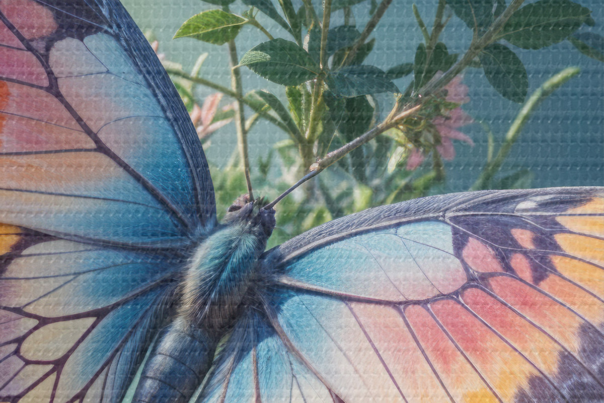 Nuotrauka Didelis, spalvingas drugelis, tupintis ant rožinių ir geltonų gėlių puokštės tamsiai žaliame fone Nr r40411