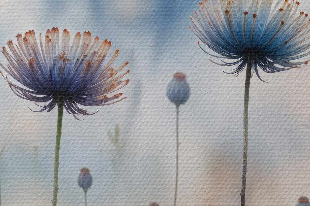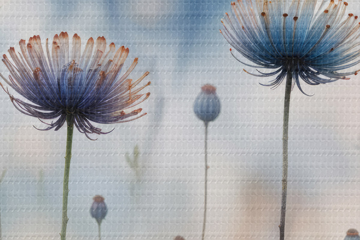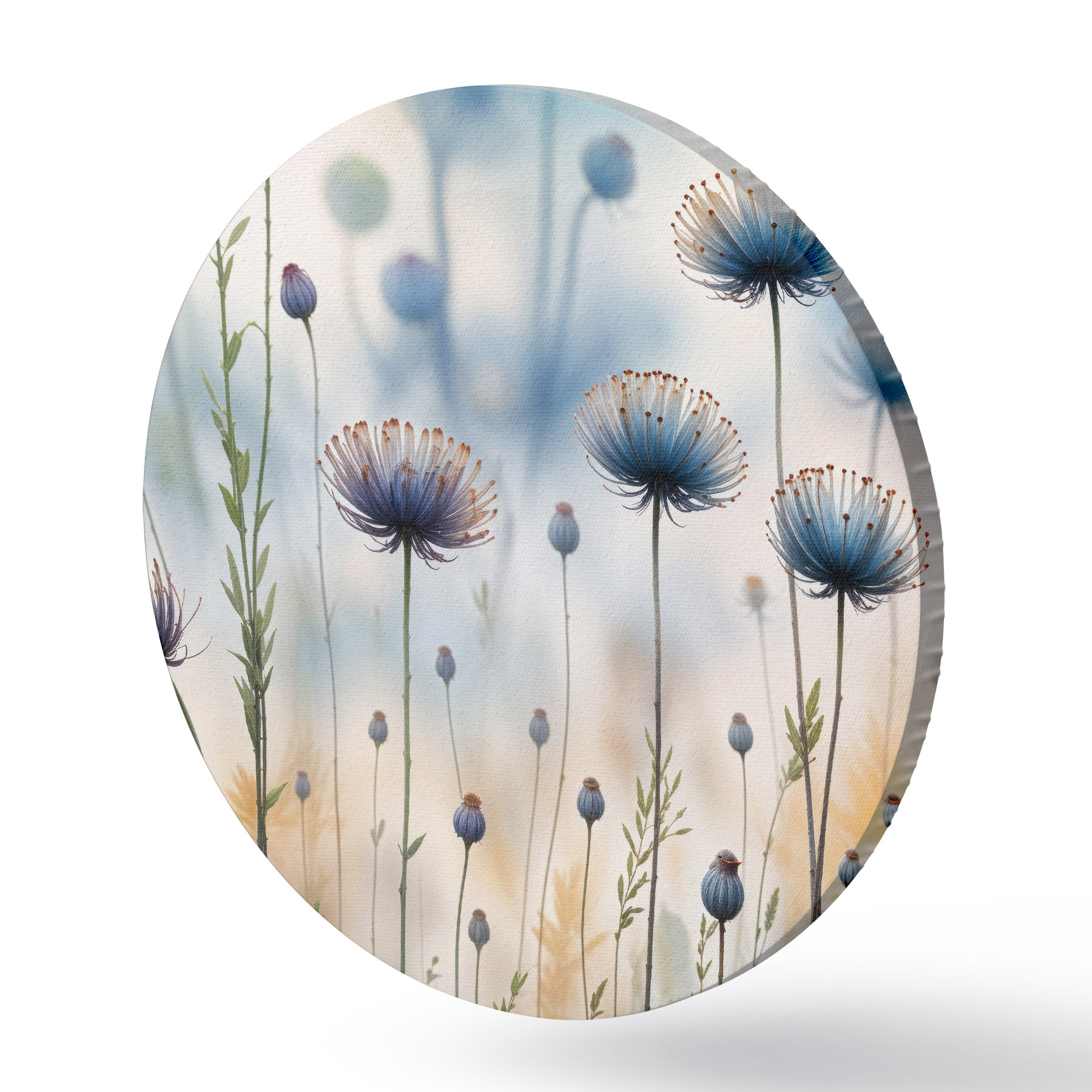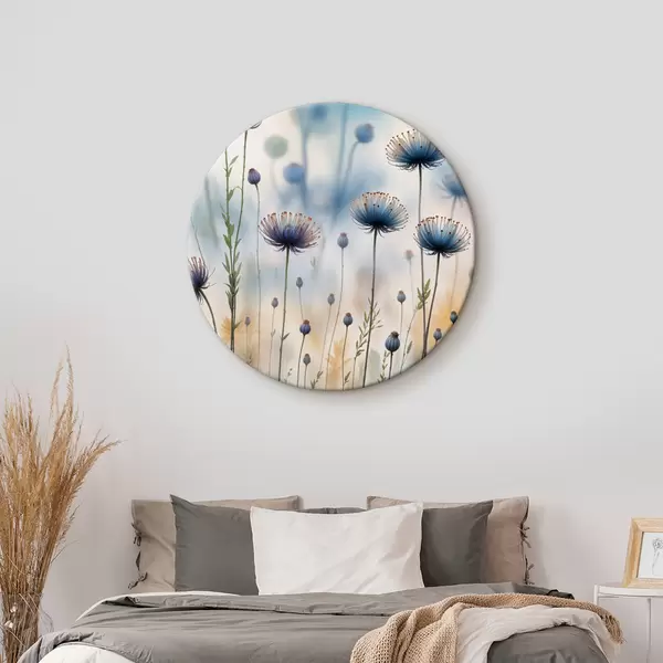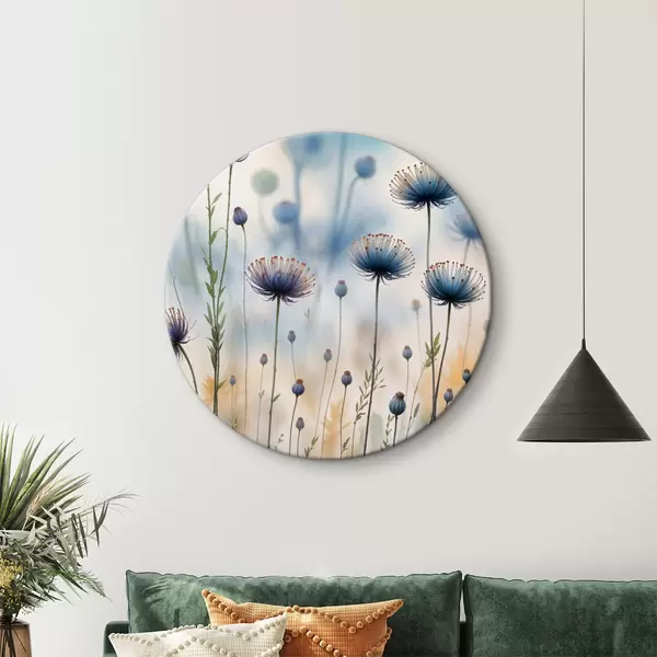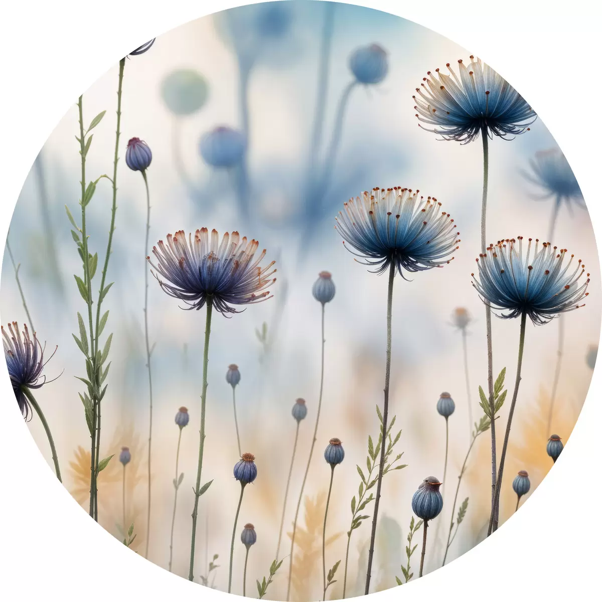 Nuotrauka Aukštos violetinės, į kiaulpienę panašios gėlės su neryškiu fonu, sukuriančios ramią ir svajingą atmosferą Nr r40414