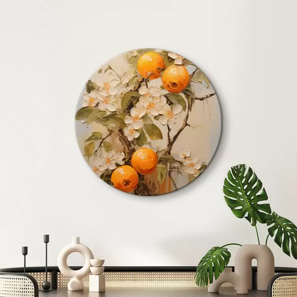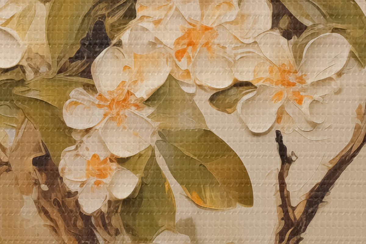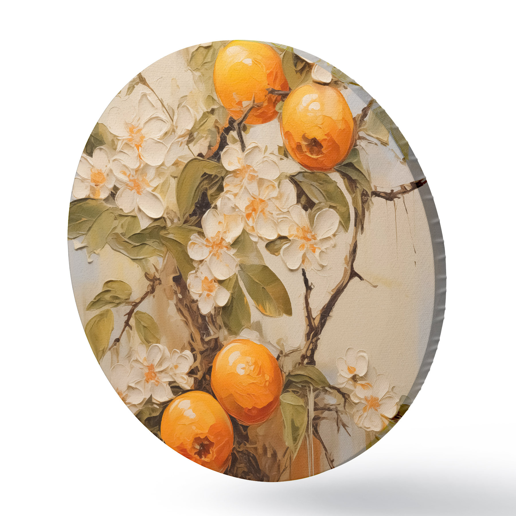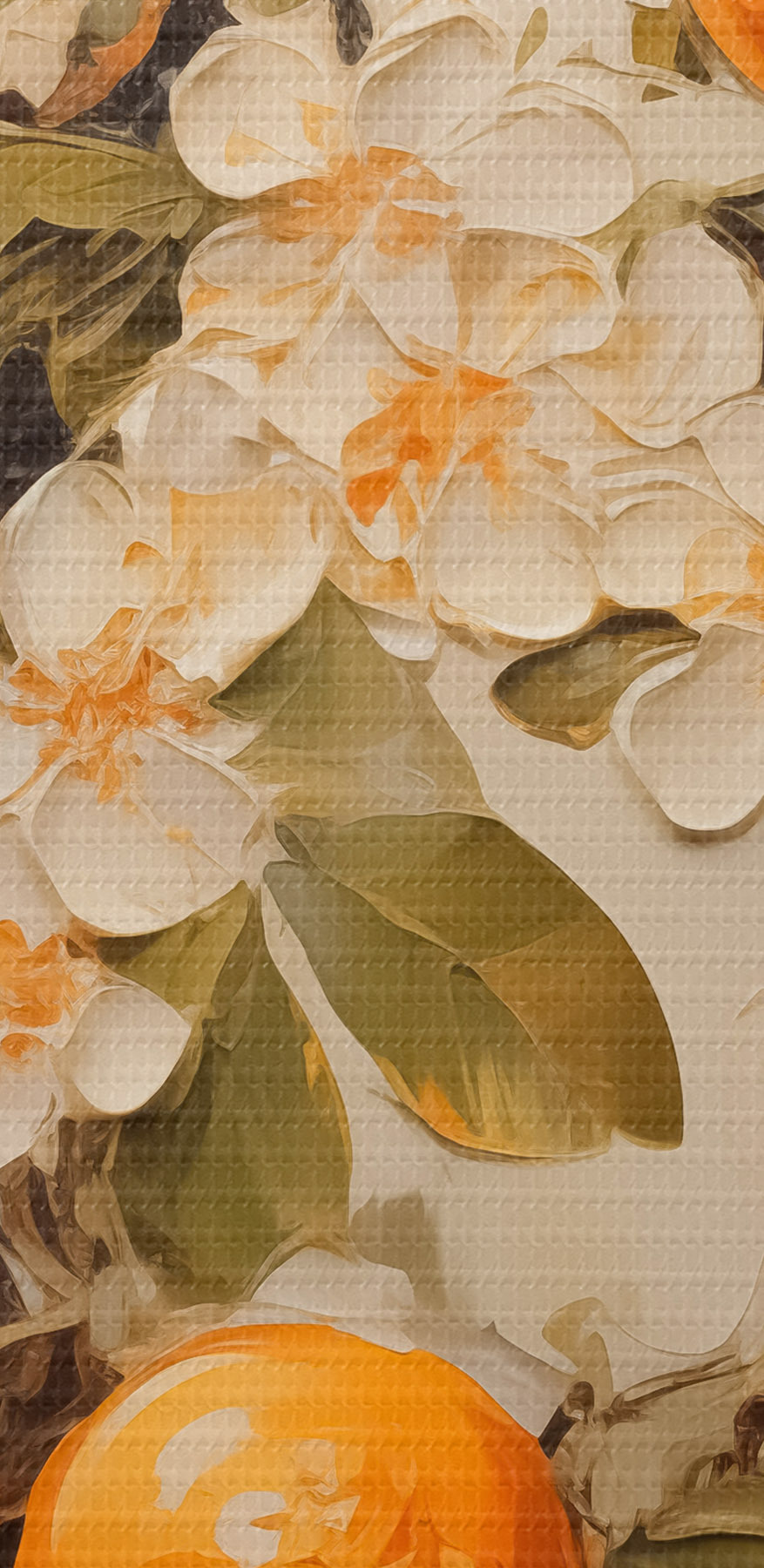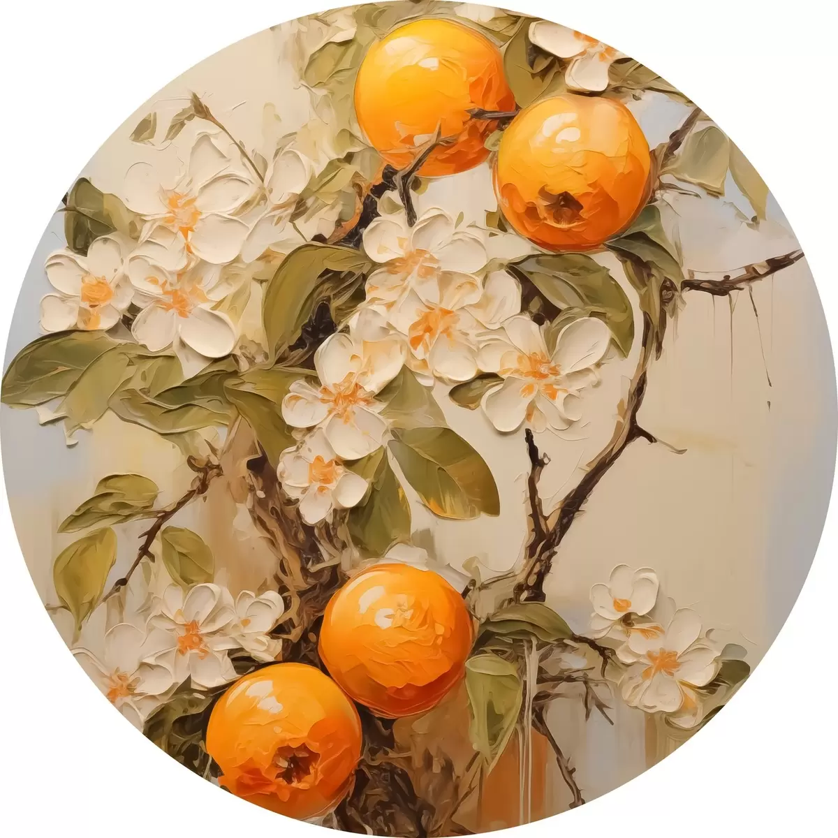 Nuotrauka Šaka su baltomis gėlėmis ir apelsinais pilkai smėlio spalvos fone Nr r40486