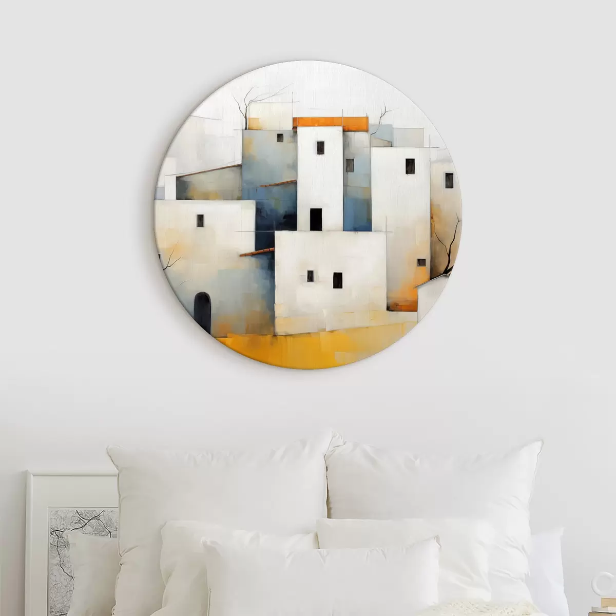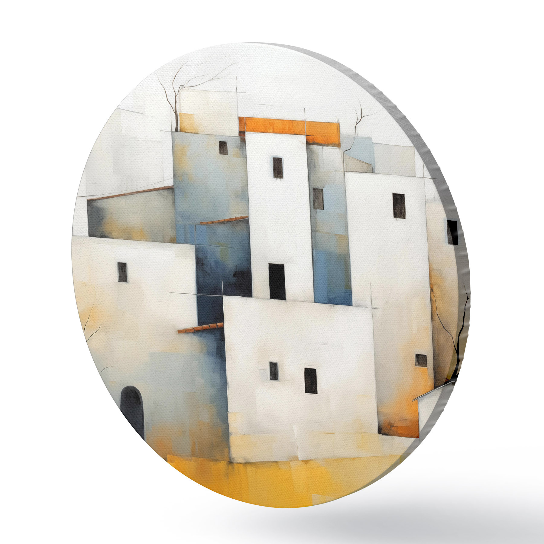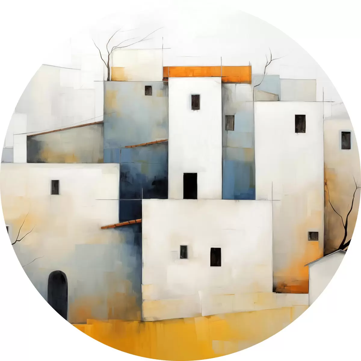 Nuotrauka Balti stilizuoti abstraktūs namai, raudona, oranžinė, geltona, mėlyna spalvos Nr r40531