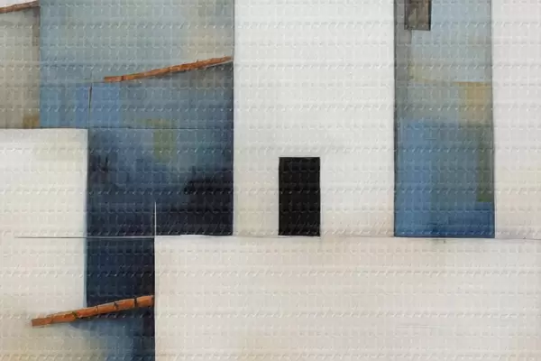 Nuotrauka Balti stilizuoti abstraktūs namai, raudona, oranžinė, geltona, mėlyna spalvos Nr r40531