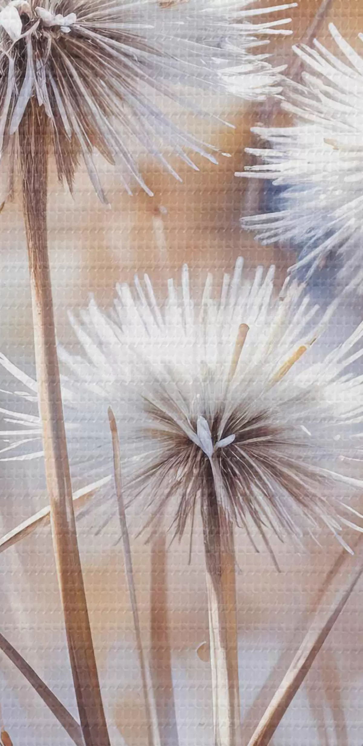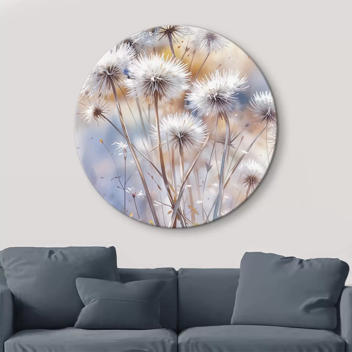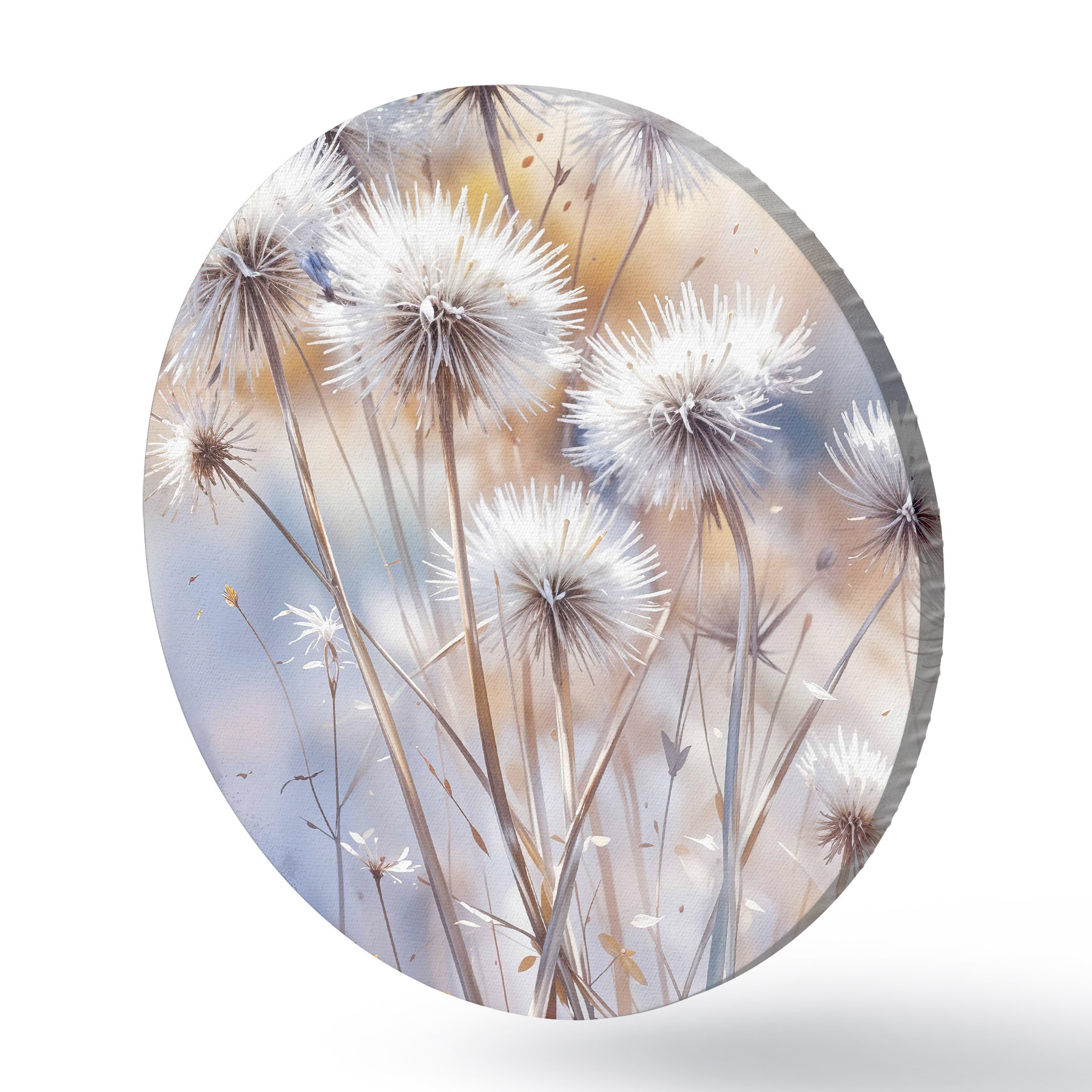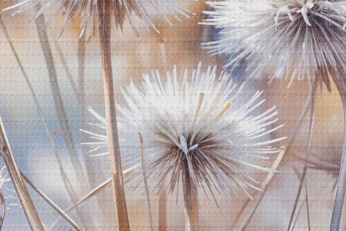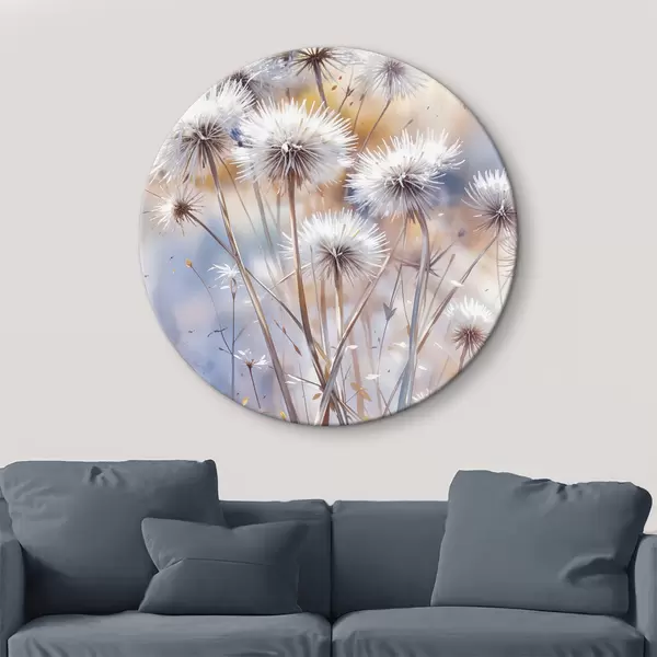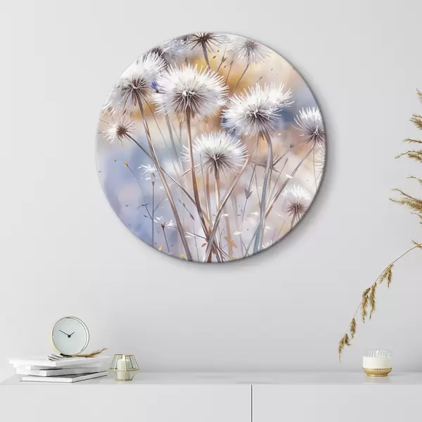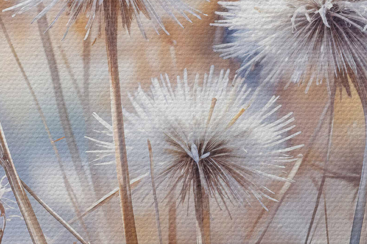 Nuotrauka Purios baltos kiaulpienių gėlės neryškiame akvarelės fone su šiltu apšvietimu Nr r40541
