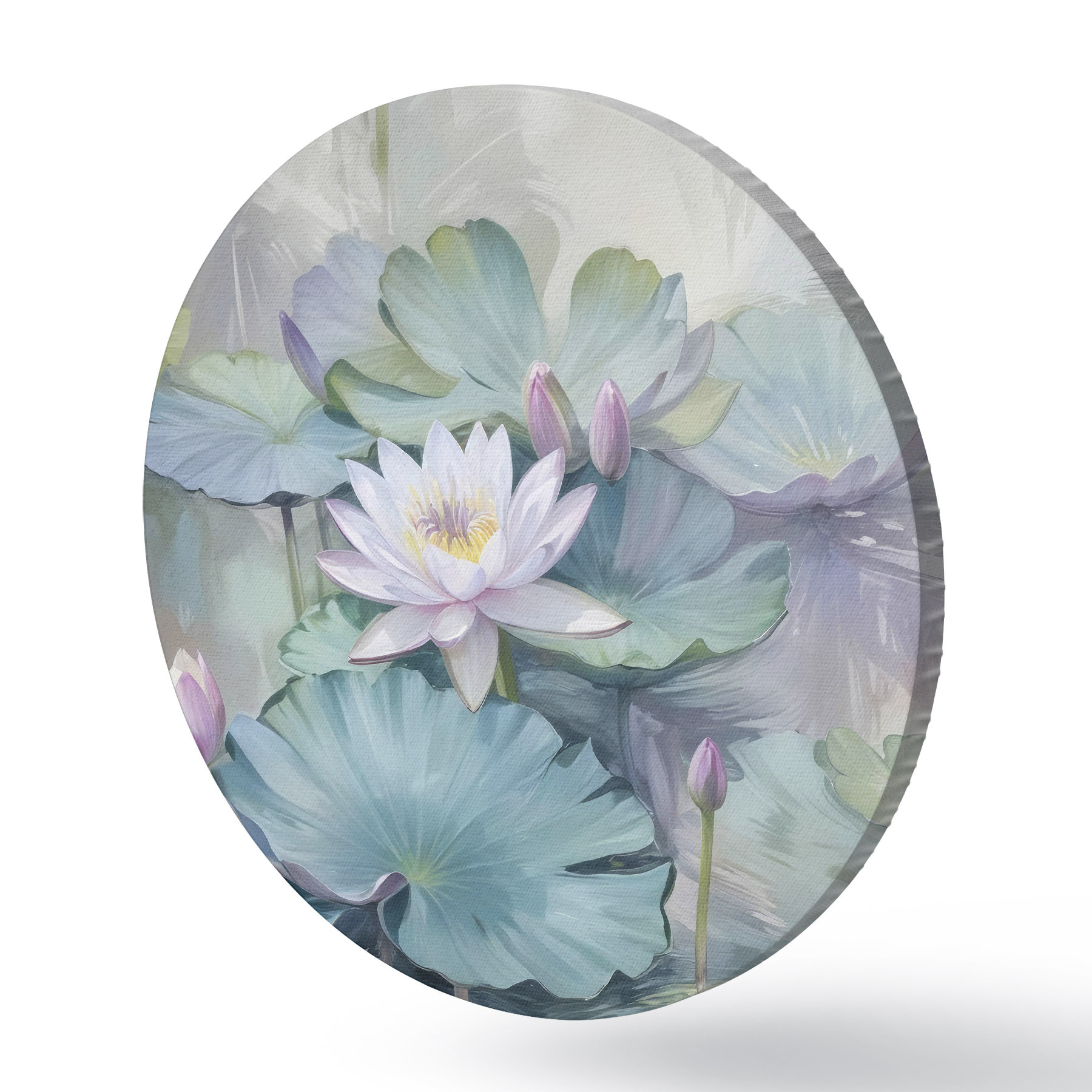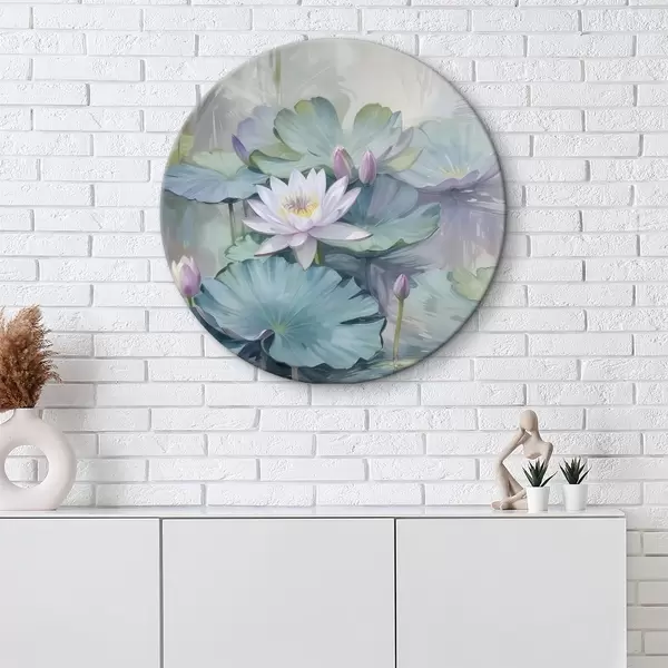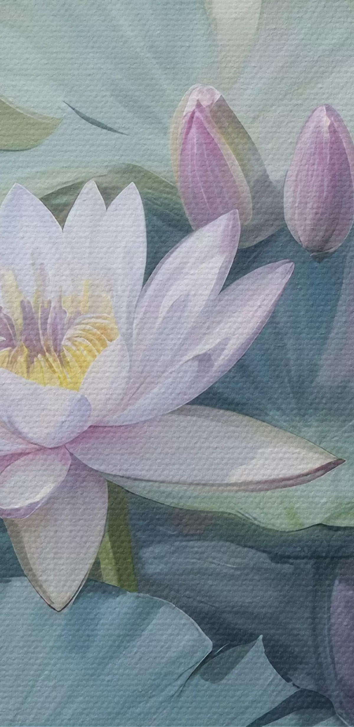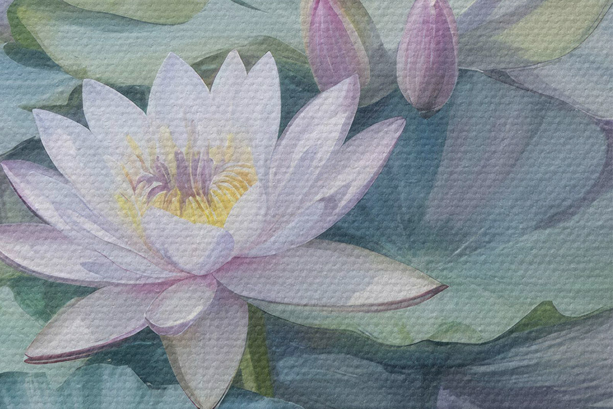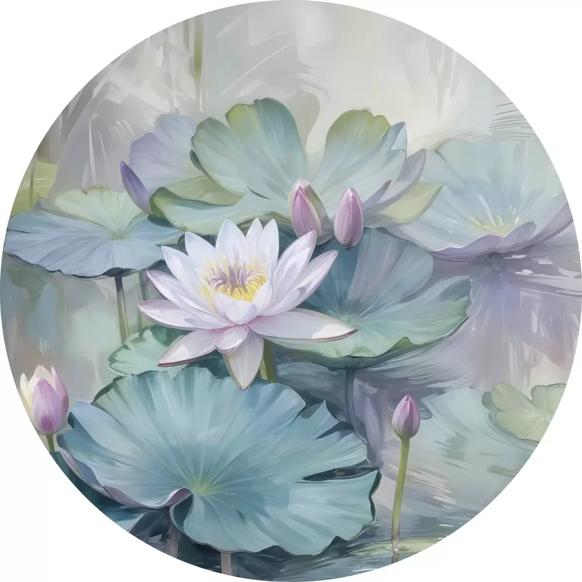 Nuotrauka Ramus tvenkinio su vandens lelijomis ir pastelinių spalvų gėlėmis vaizdas, apsuptas sodrių žalių vandens lelijų lapų Nr r40542