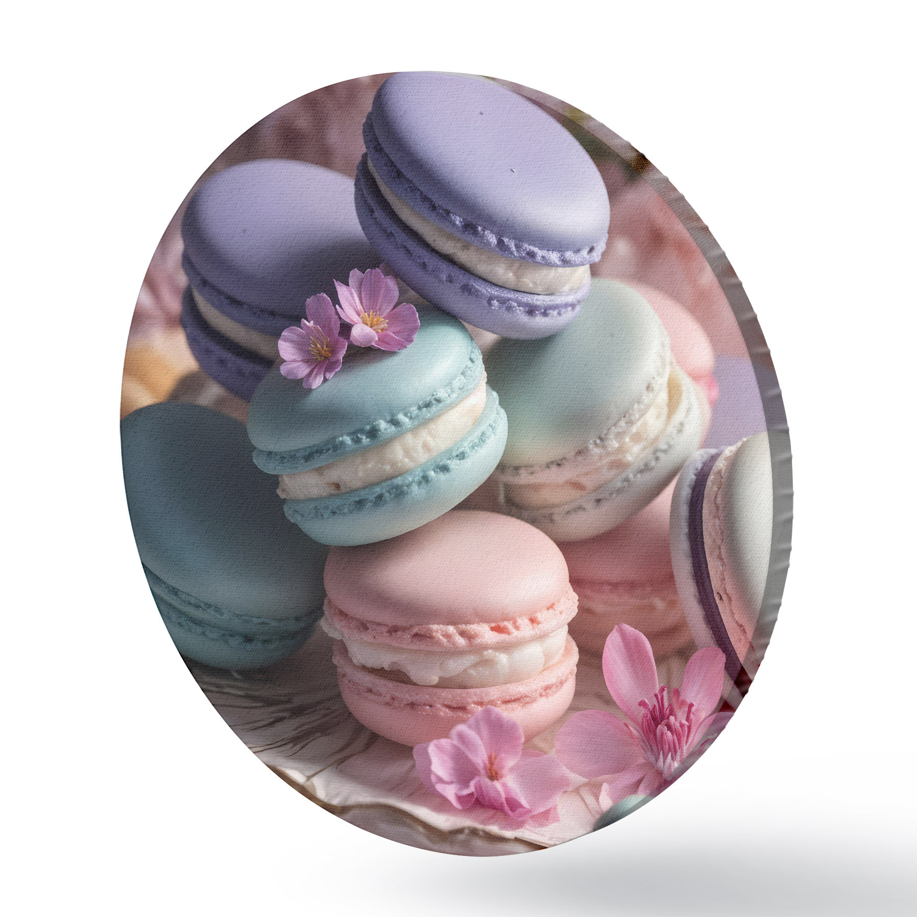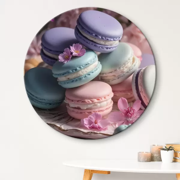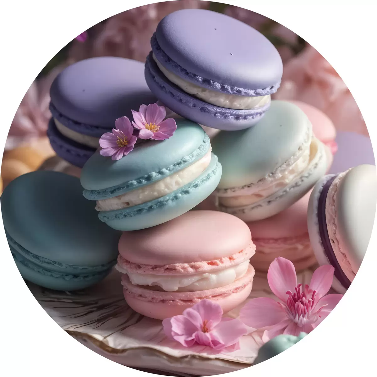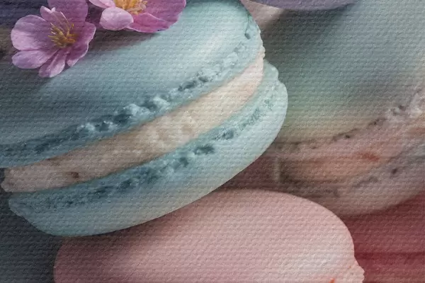 Nuotrauka Spalvingi makaronai su rožinėmis ir violetinėmis gėlėmis lėkštėje, stambiu planu Nr r40546