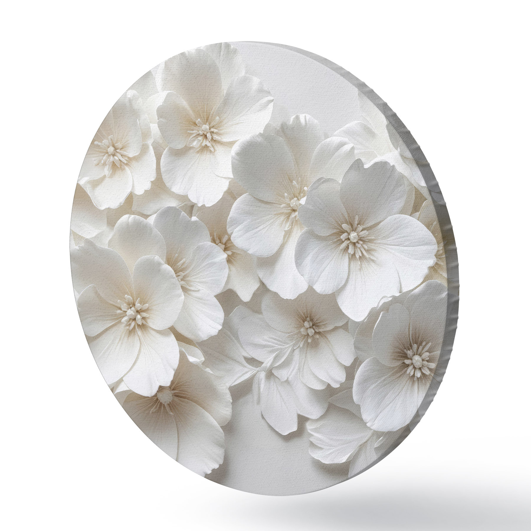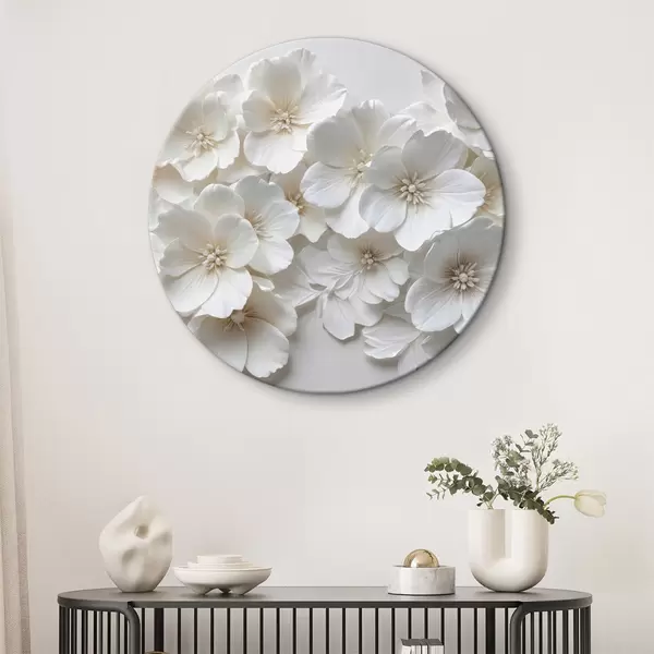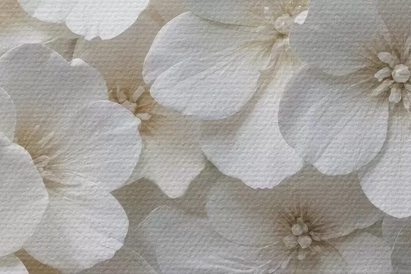 Nuotrauka Baltos gėlės su subtiliais žiedlapiais, išdėstytos gražiu gėlių raštu šviesiame fone Nr r40548