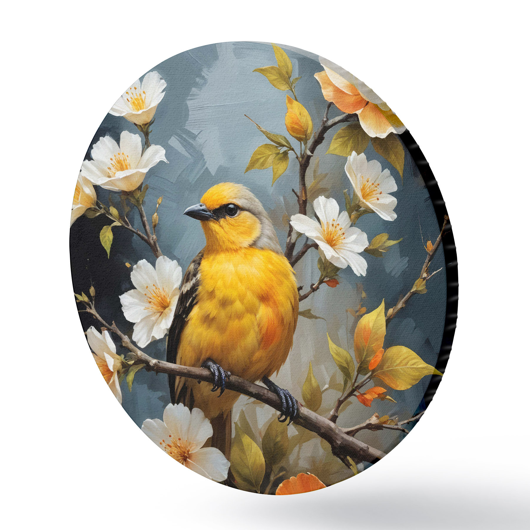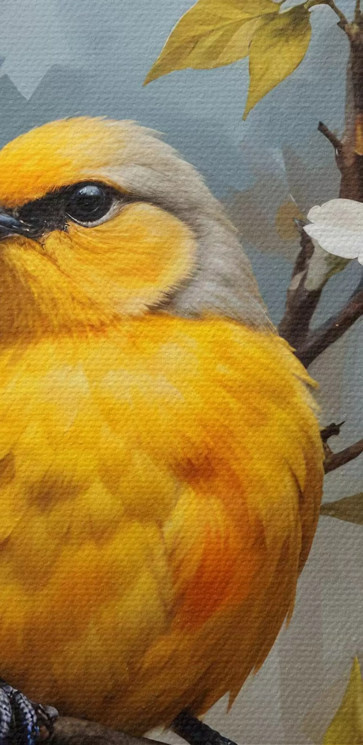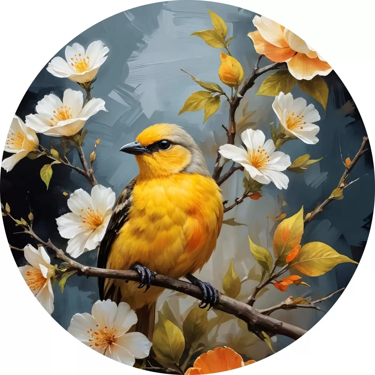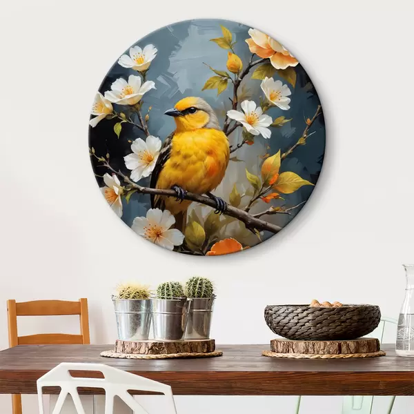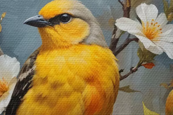 Nuotrauka Geltonas paukštis, sėdintis ant šakos, o fone - baltos ir oranžinės gėlės Nr r40550