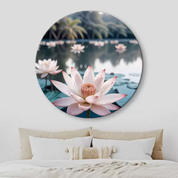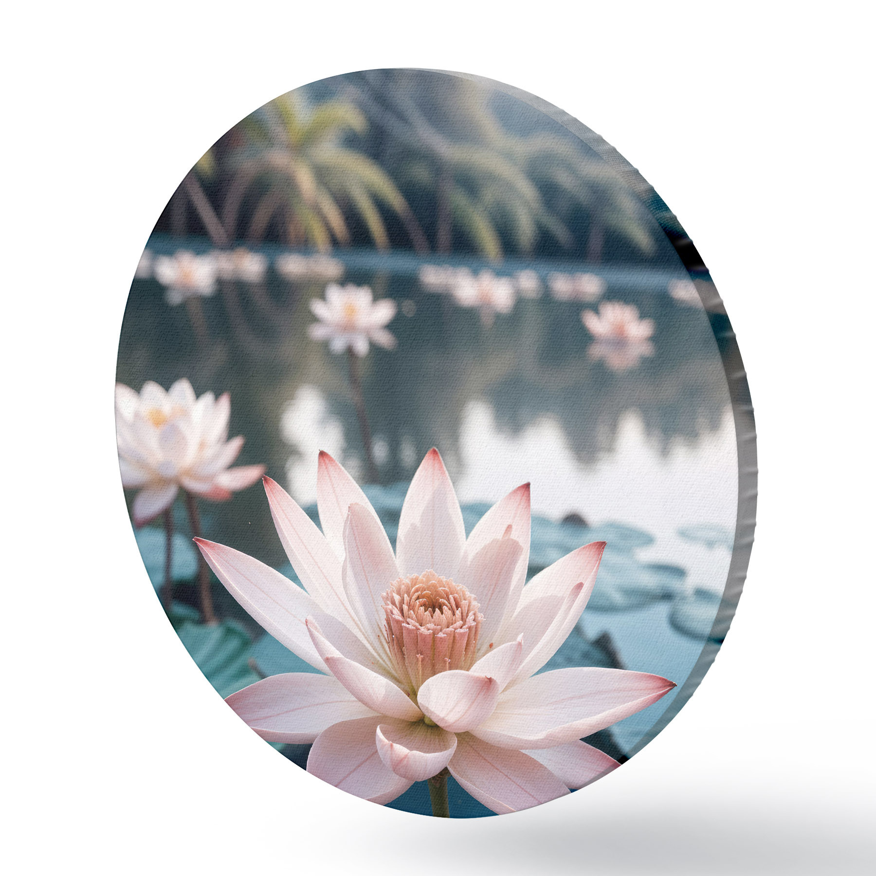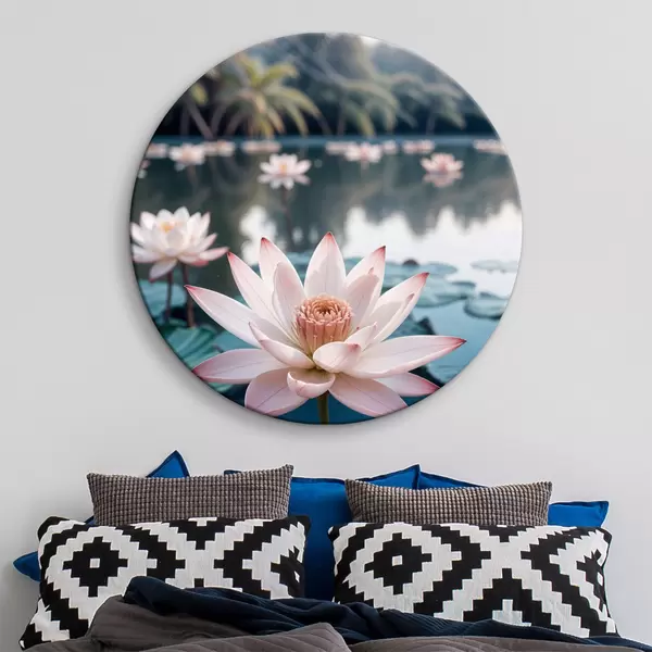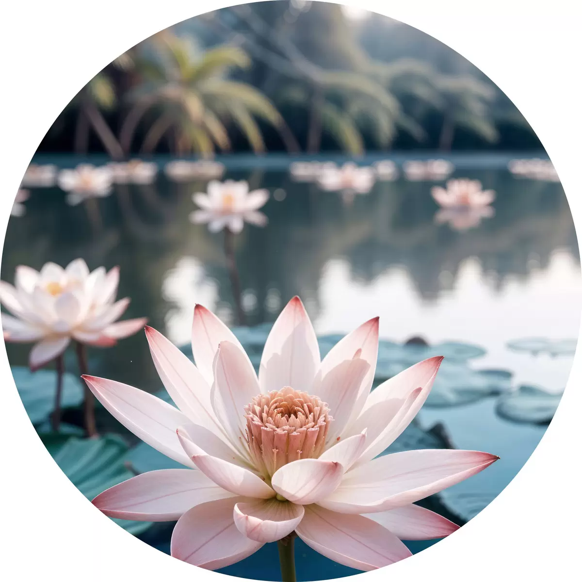 Nuotrauka Tvenkinys, kurio paviršiuje plūduriuoja rožinės spalvos lotoso žiedai, apsuptas vešlios žalumos ir palmių Nr r40555