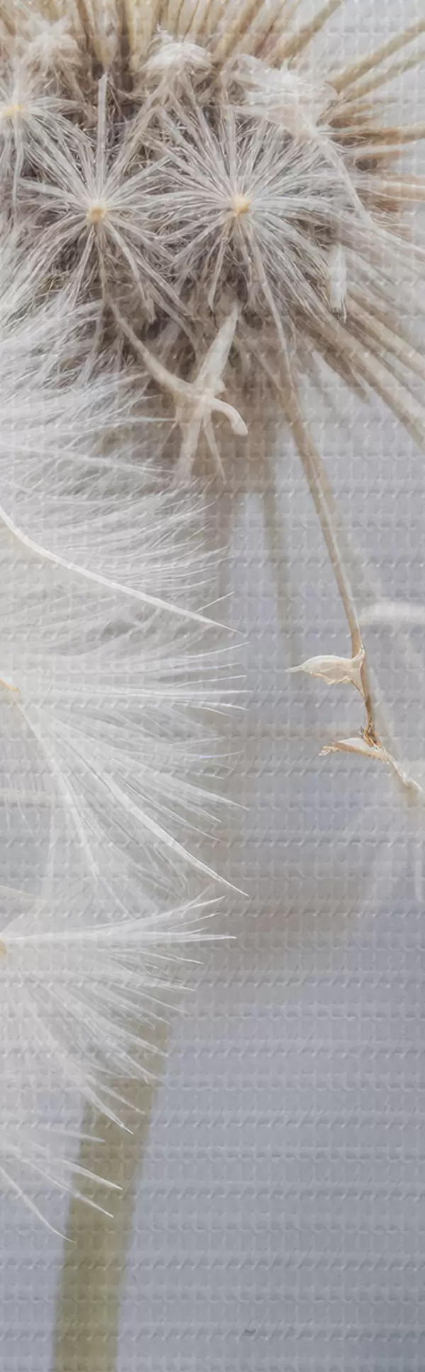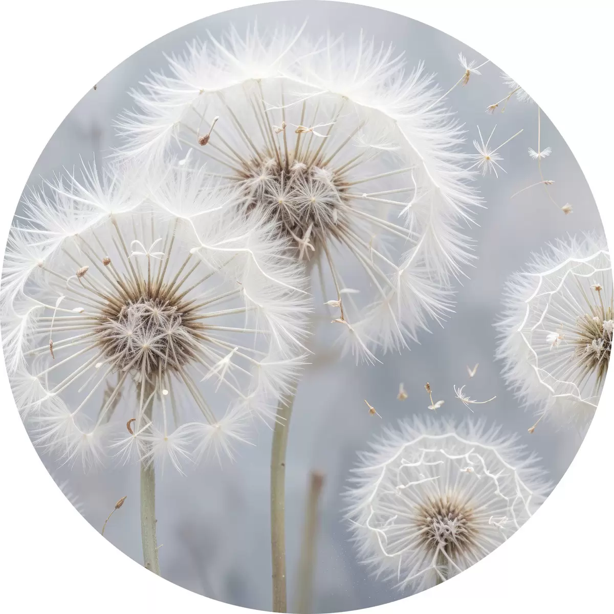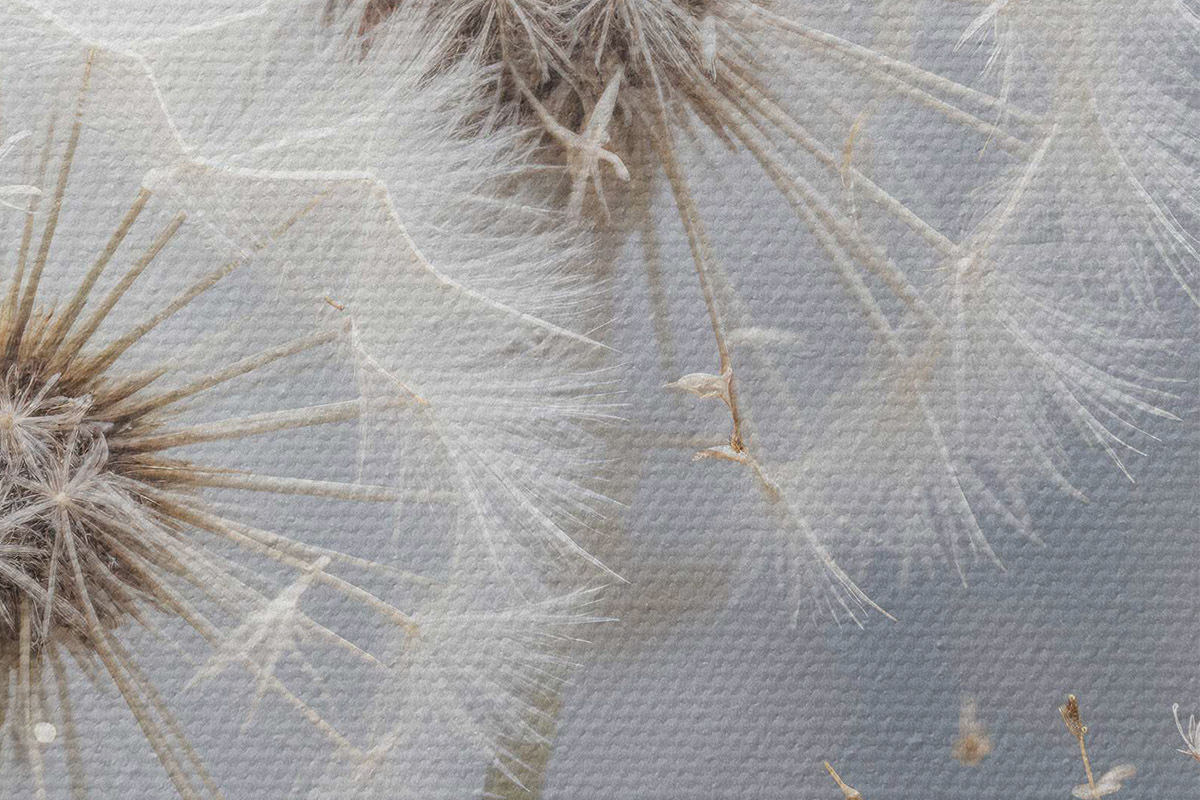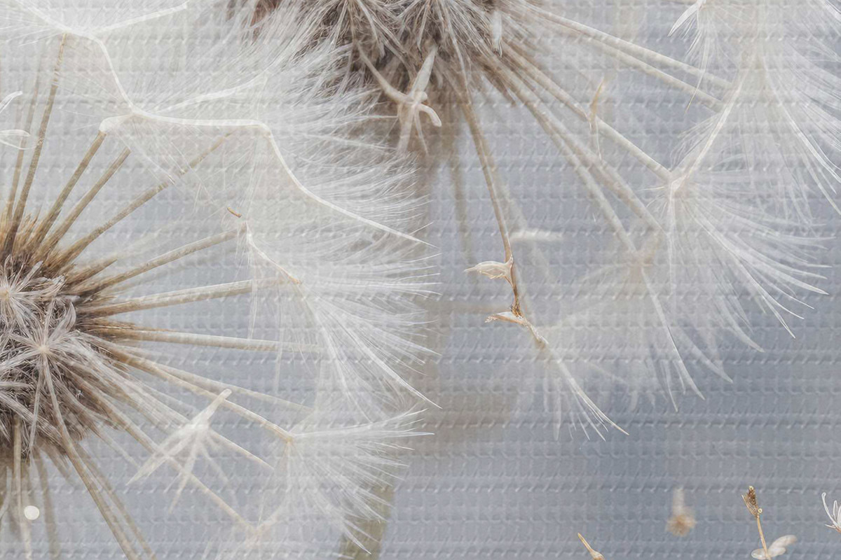 Nuotrauka Baltos kiaulpienių gėlės su puriomis sėklomis neryškiame pilkame fone Nr r40556