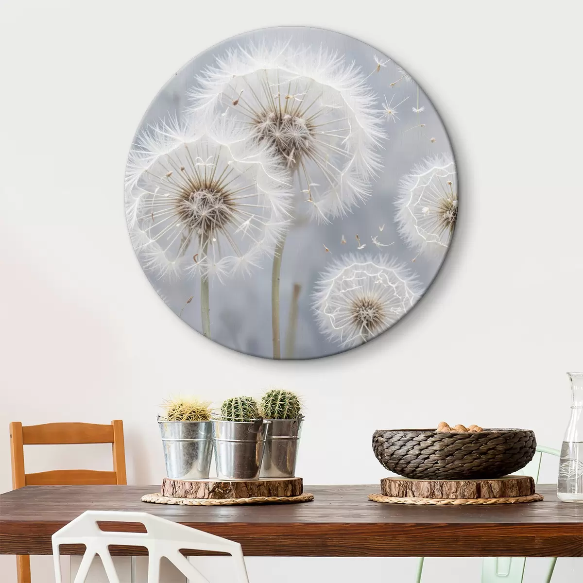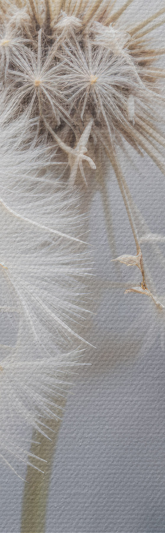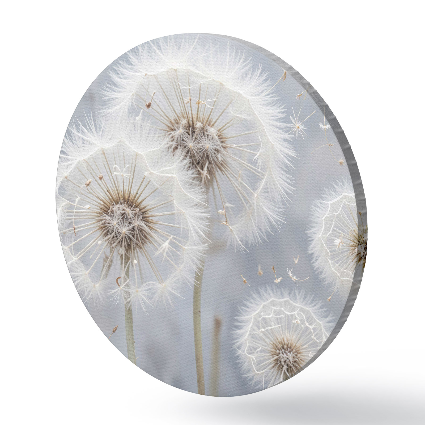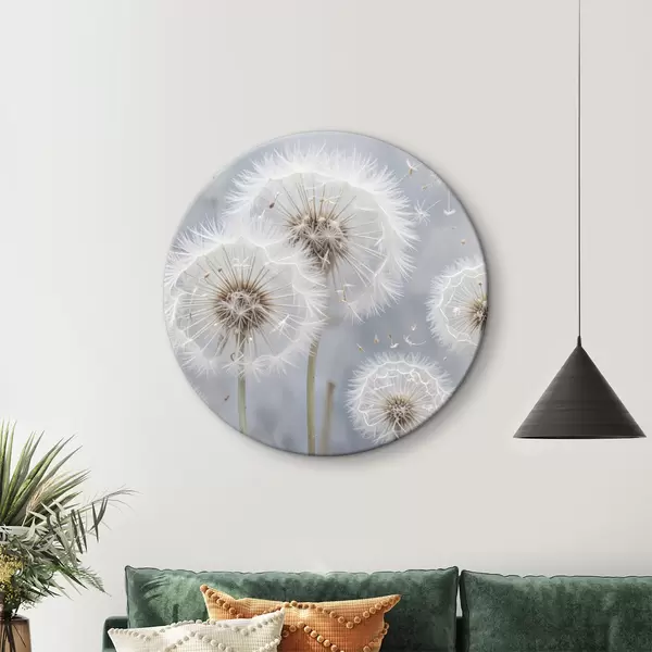 Nuotrauka Baltos kiaulpienių gėlės su puriomis sėklomis neryškiame pilkame fone Nr r40556