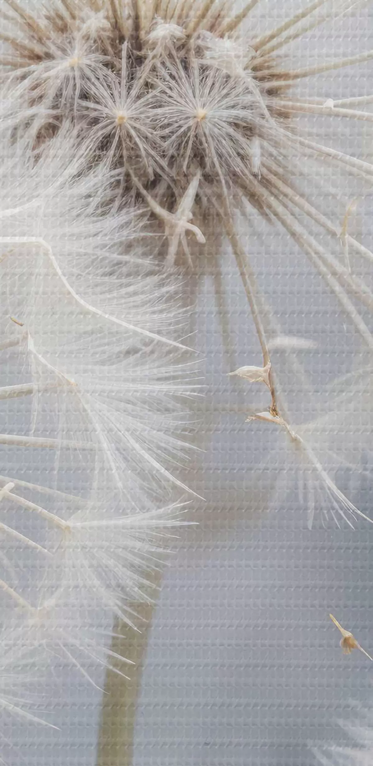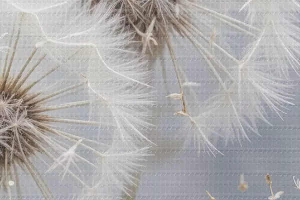 Nuotrauka Baltos kiaulpienių gėlės su puriomis sėklomis neryškiame pilkame fone Nr r40556