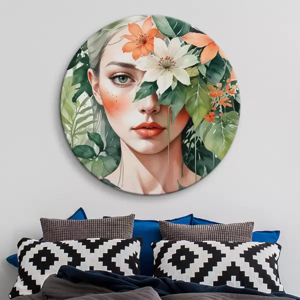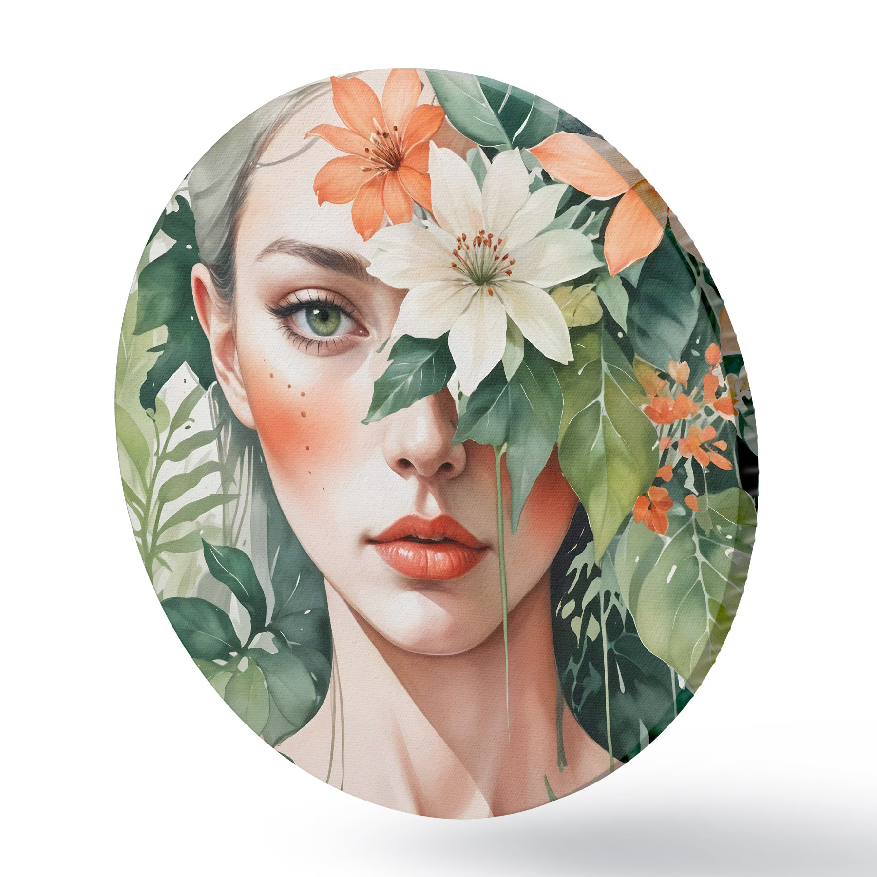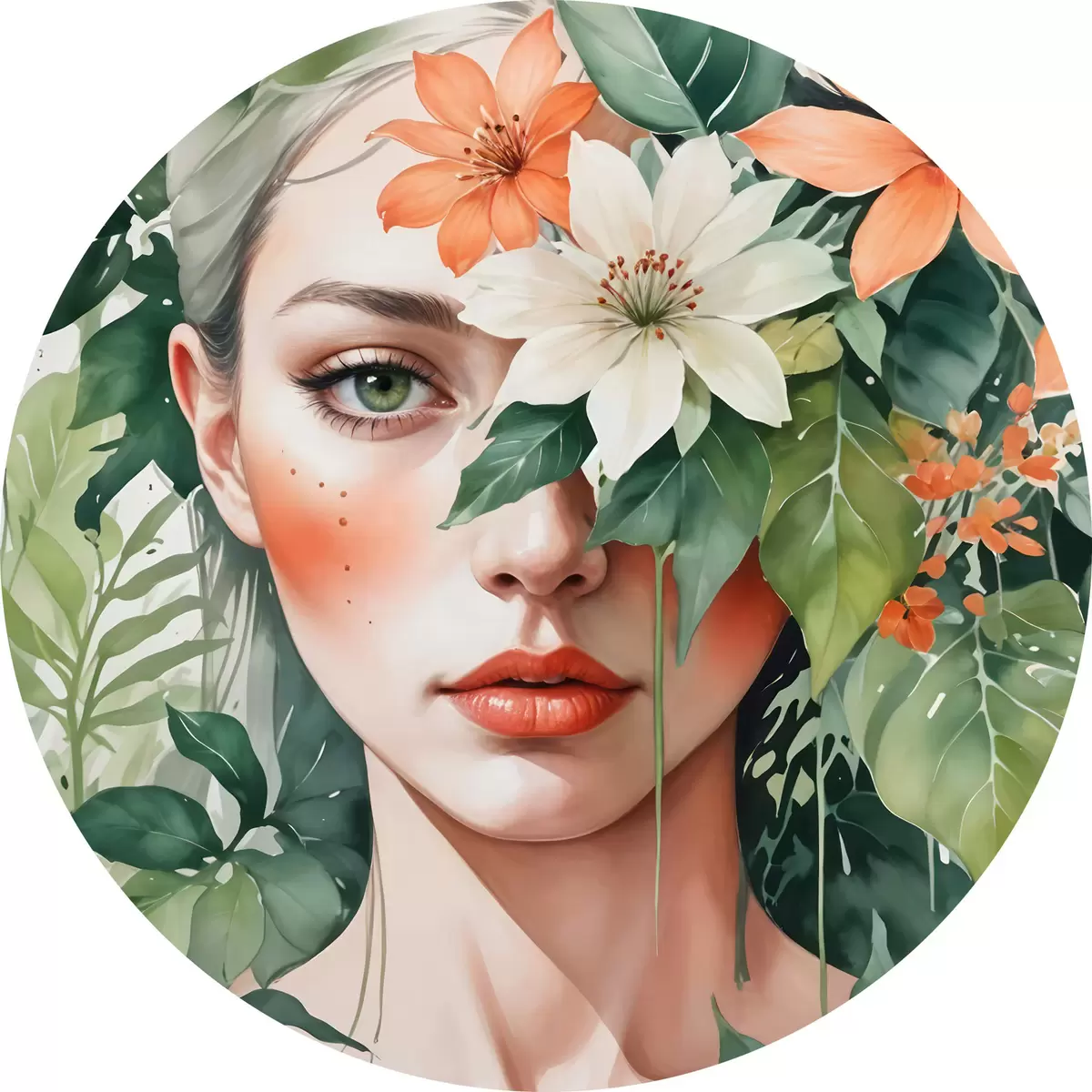 Nuotrauka Šviesiaplaukė moteris, apsupta ryškiai oranžinių ir baltų atogrąžų gėlių, žalių lapų ir augmenijos Nr r40557