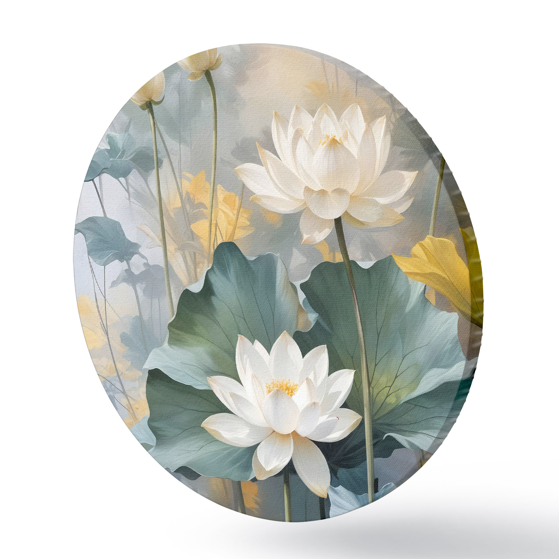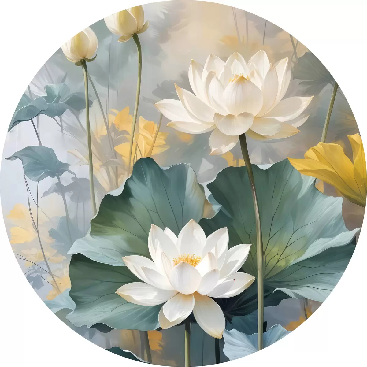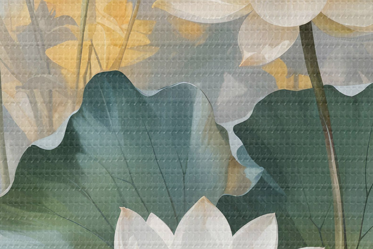 Nuotrauka Balti lotoso žiedai tvenkinyje su žaliais vandens lelijų žiedlapiais, apsupti geltonų gėlių ir neryškiame fone Nr r40559