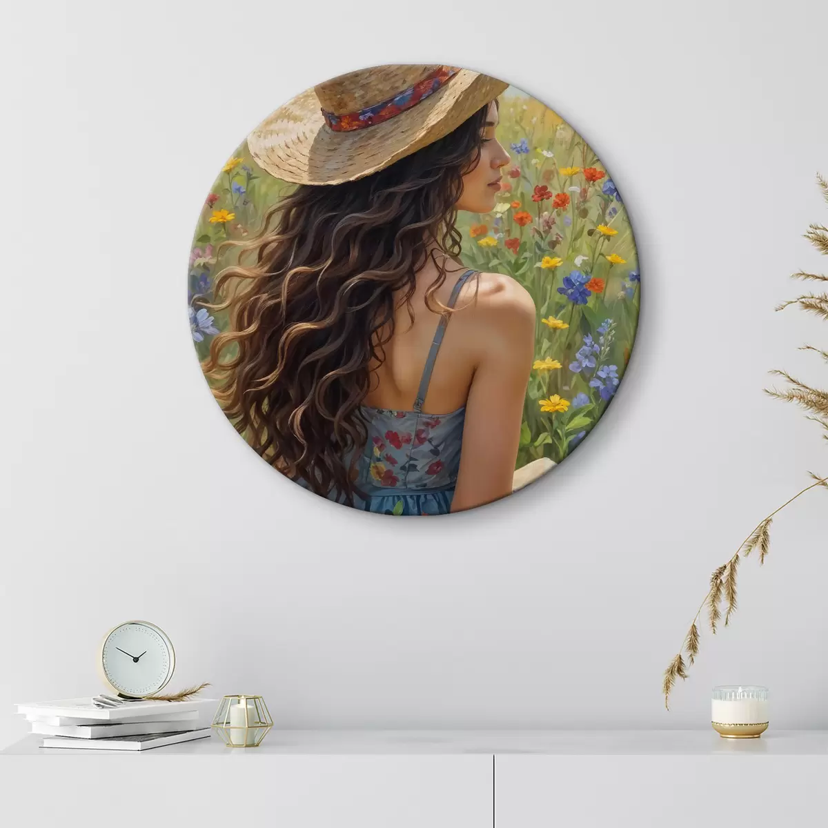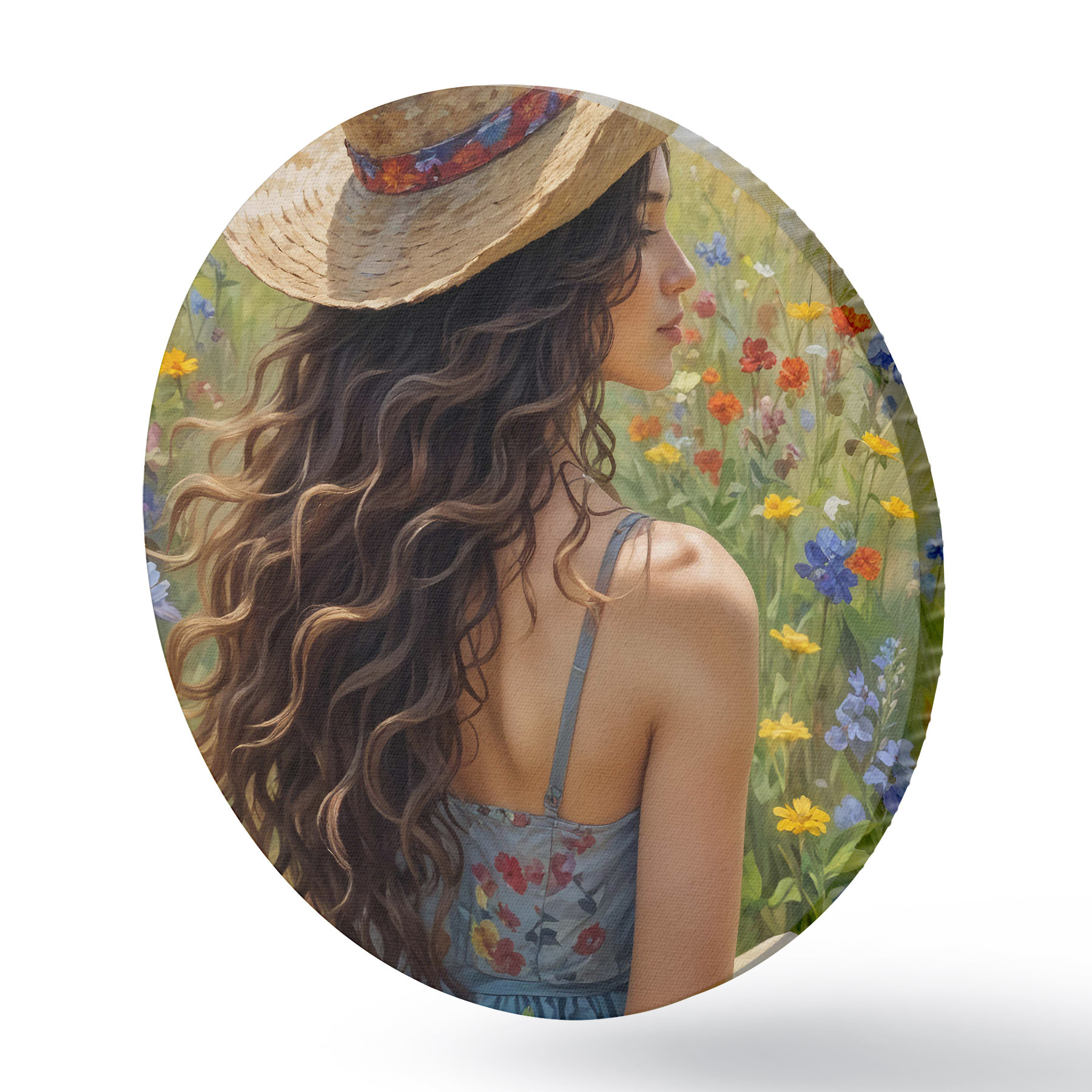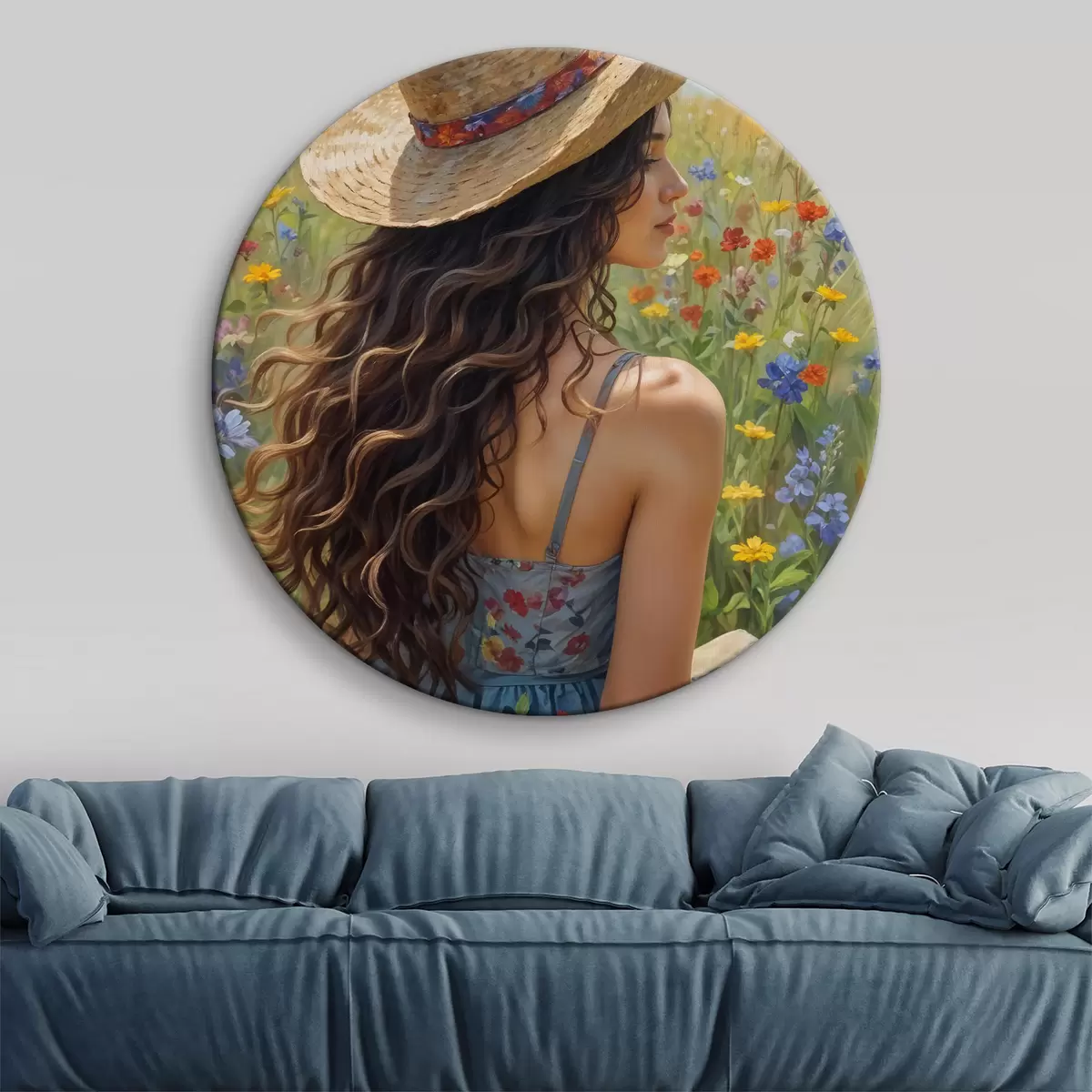 Nuotrauka Jauna moteris garbanotais plaukais, dėvinti šiaudinę skrybėlę ir gėlėtą suknelę, stovi laukinių gėlių lauke Nr r40560