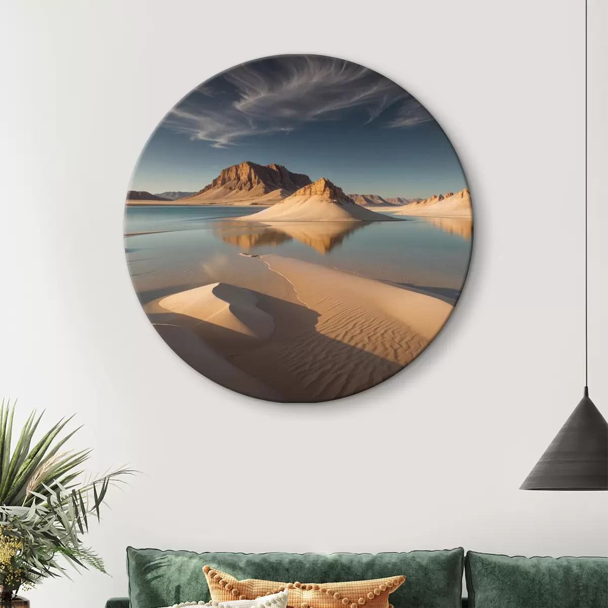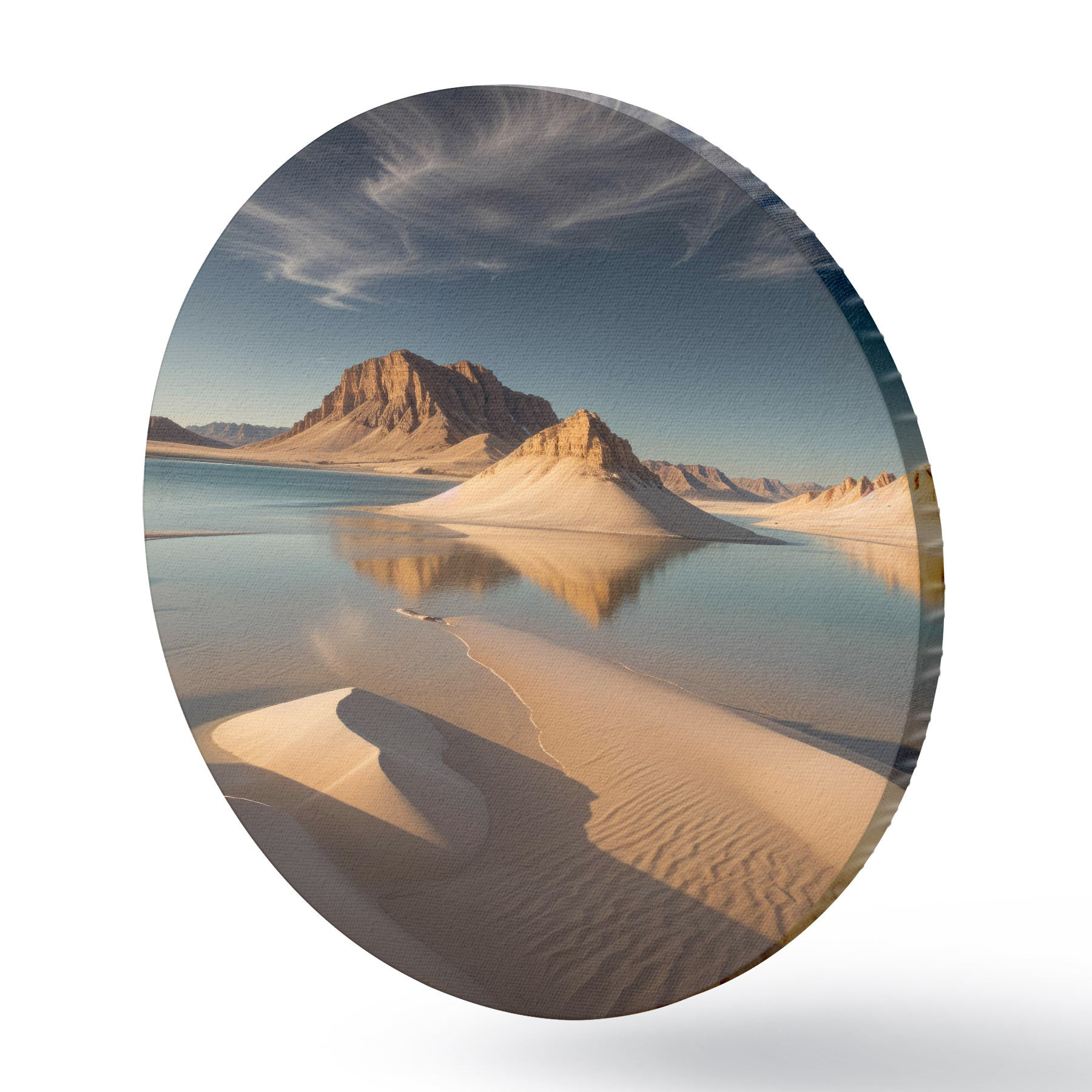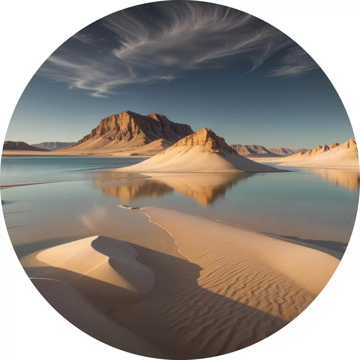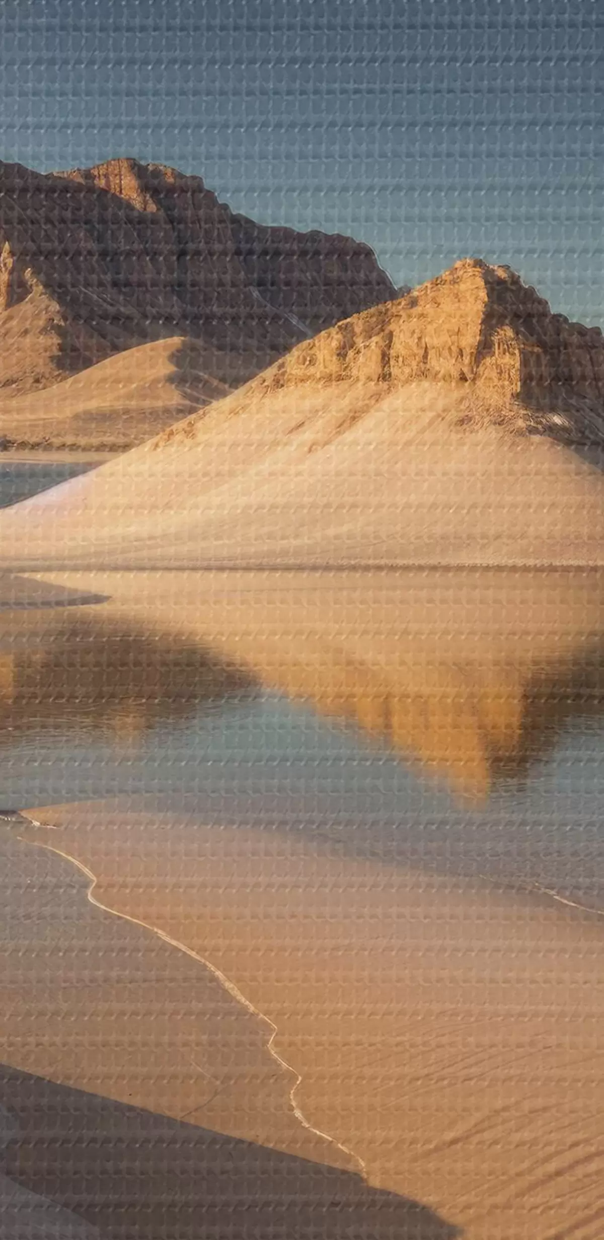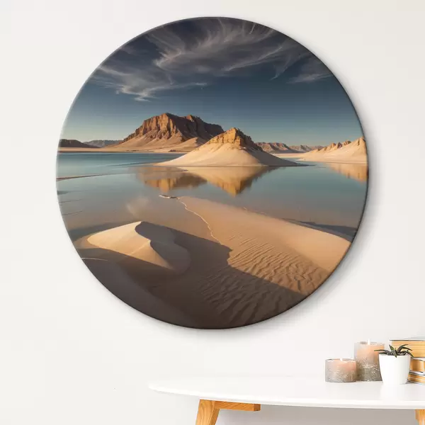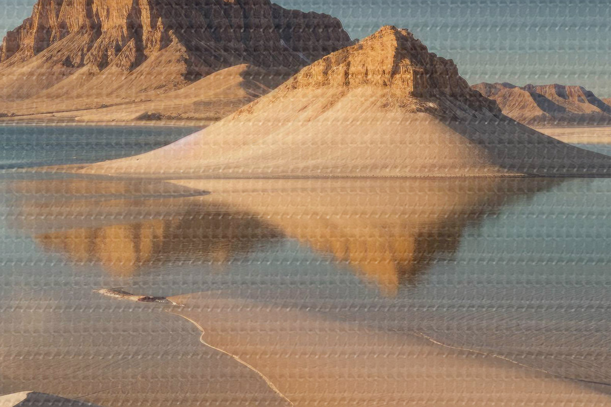 Nuotrauka Didžiulis dykumos kraštovaizdis su aukštais uolų dariniais, atsispindinčiais sekliame vandenyje Nr r40568