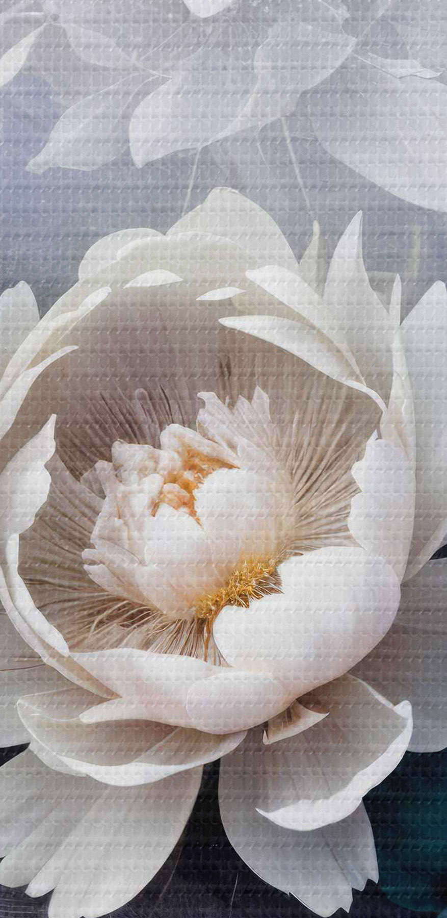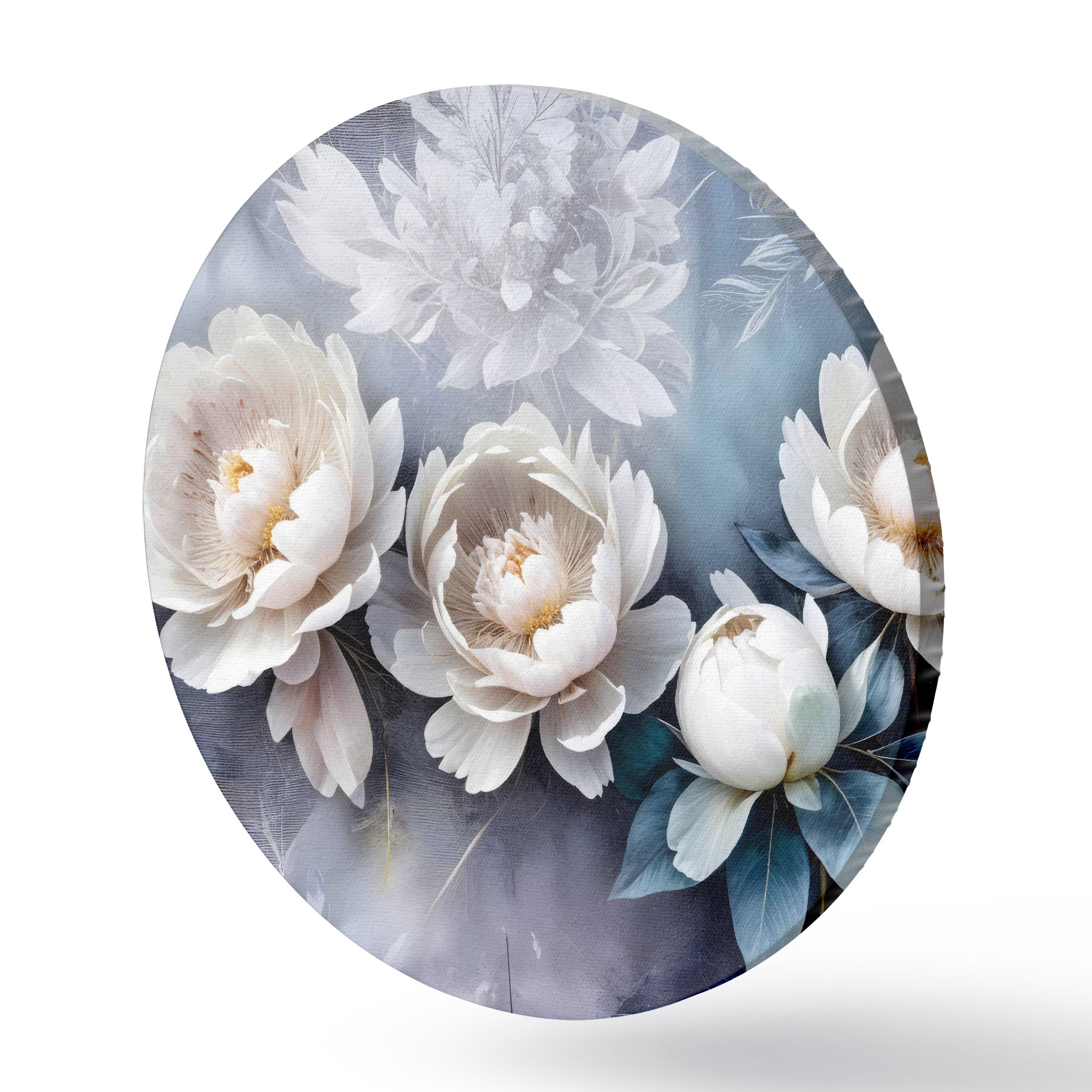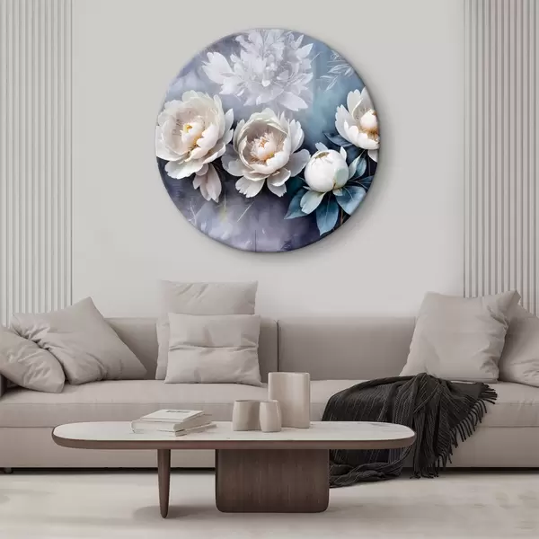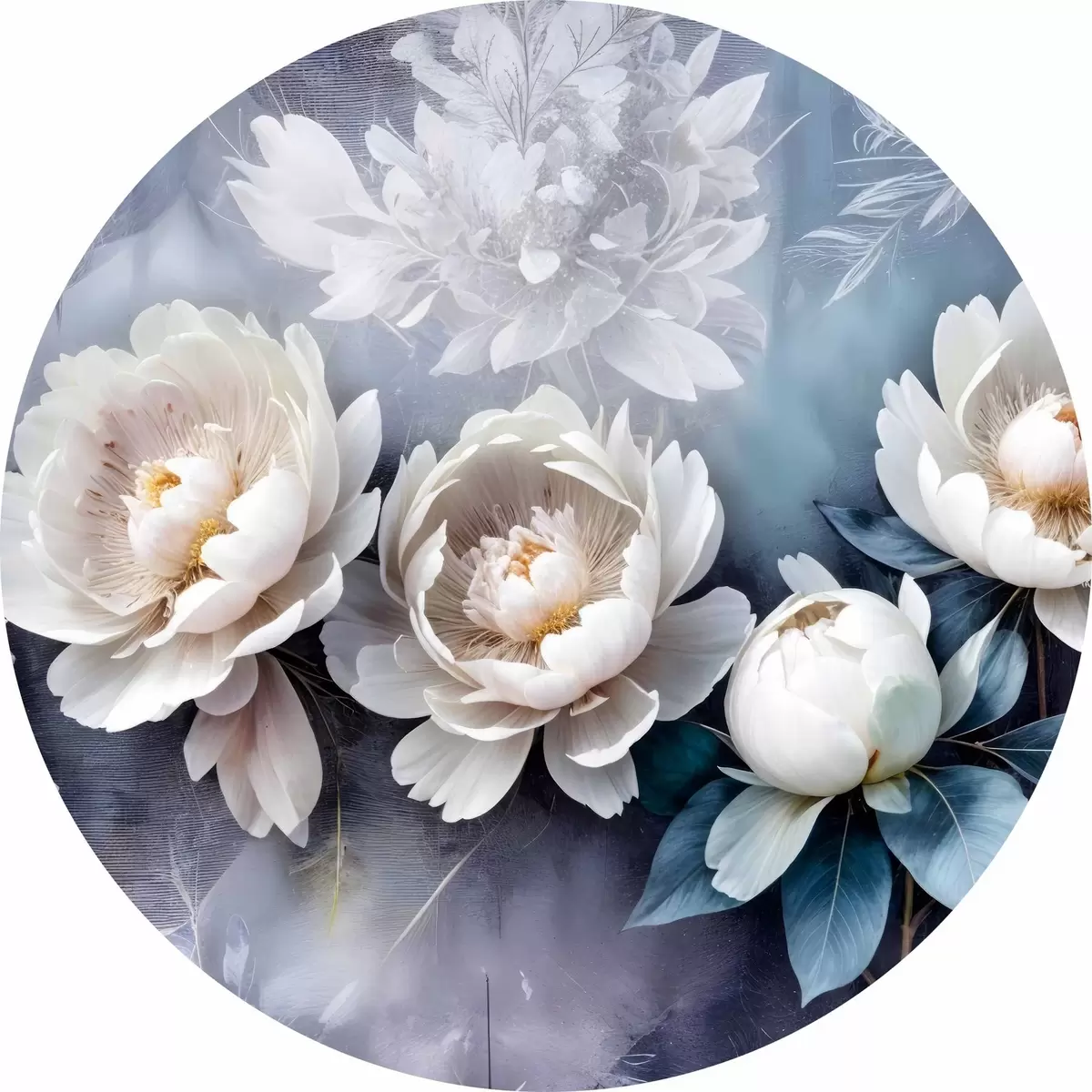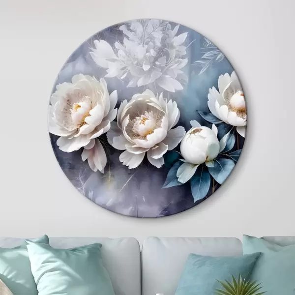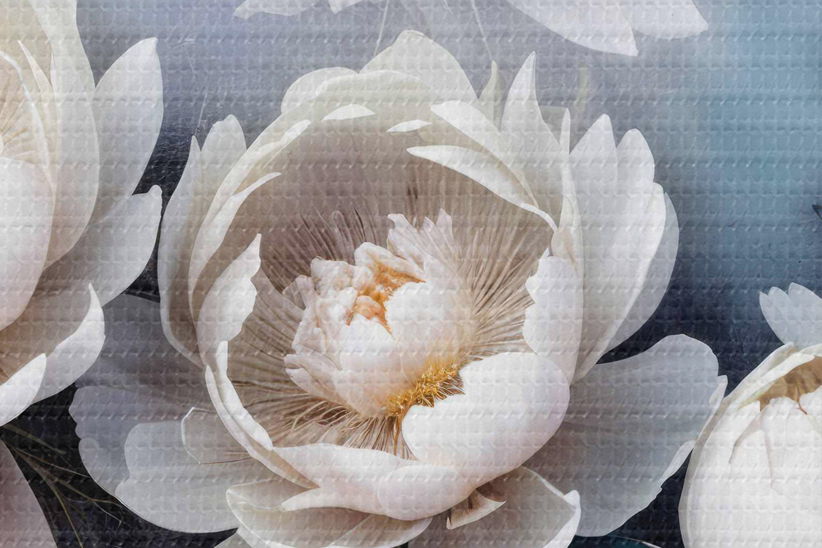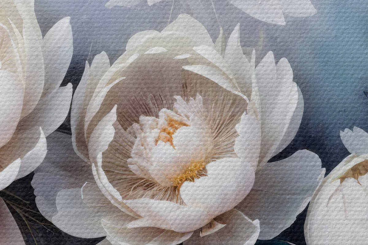 Nuotrauka Baltos bijūnų gėlės su žaliais lapais mėlynos tekstūros fone Nr r40569