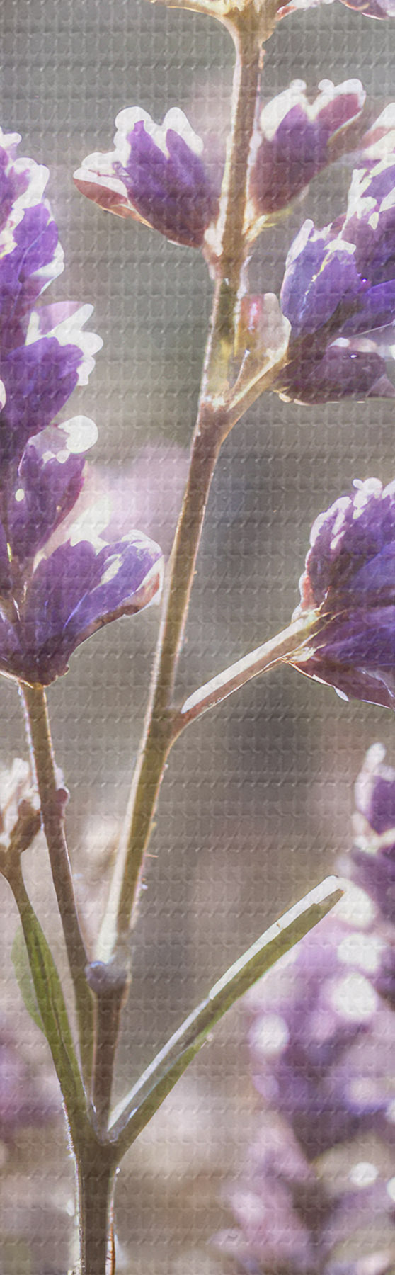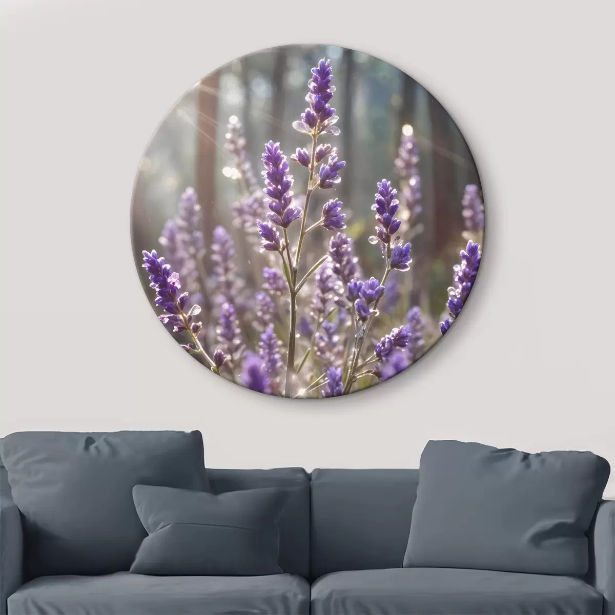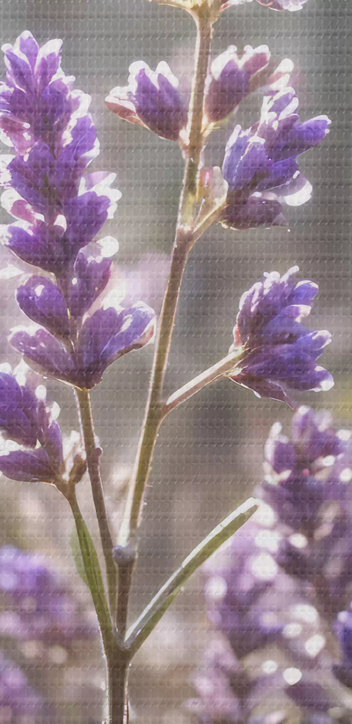 Nuotrauka Violetinės levandų gėlės lauke, neryškus miško fonas ir pro jas šviečiantys saulės spinduliai Nr r40570