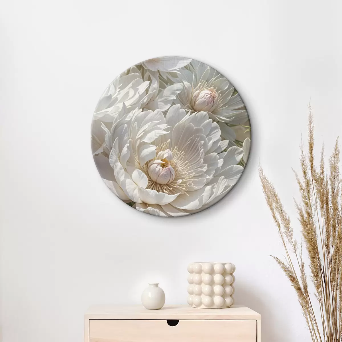 Nuotrauka Kelių didelių baltų bijūnų žiedų su minkštais, švelniais žiedlapiais ir ryškiai geltonais centrais stambiu planu Nr r40575