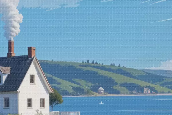 Nuotrauka Baltas namas ant žole apaugusios kalvos, kalnai fone ir mėlynas dangus su pūkuotais debesimis Nr r40587