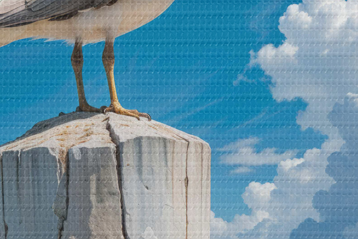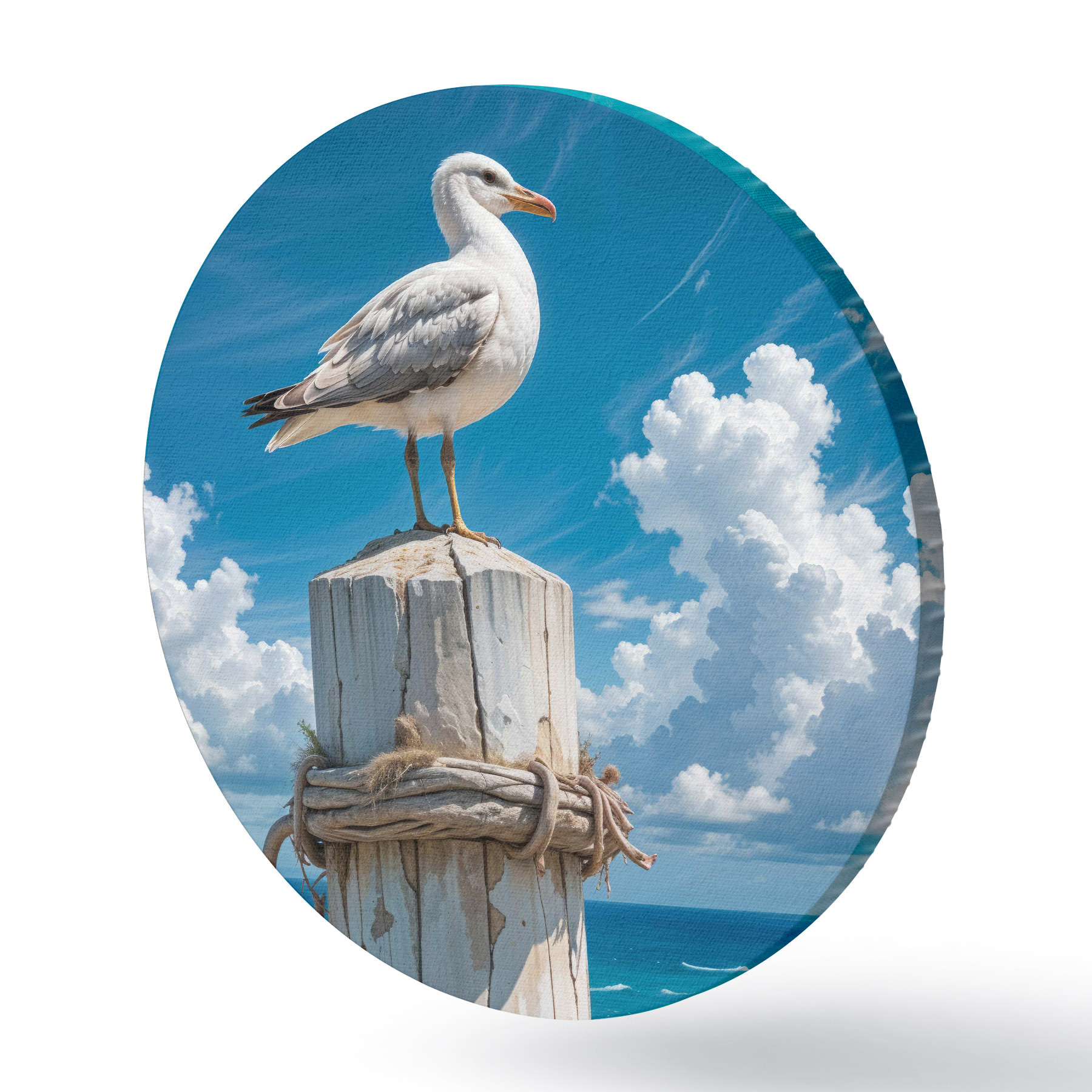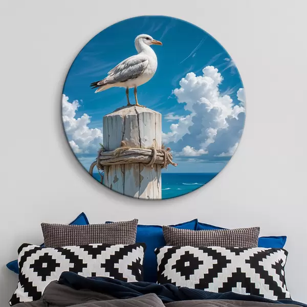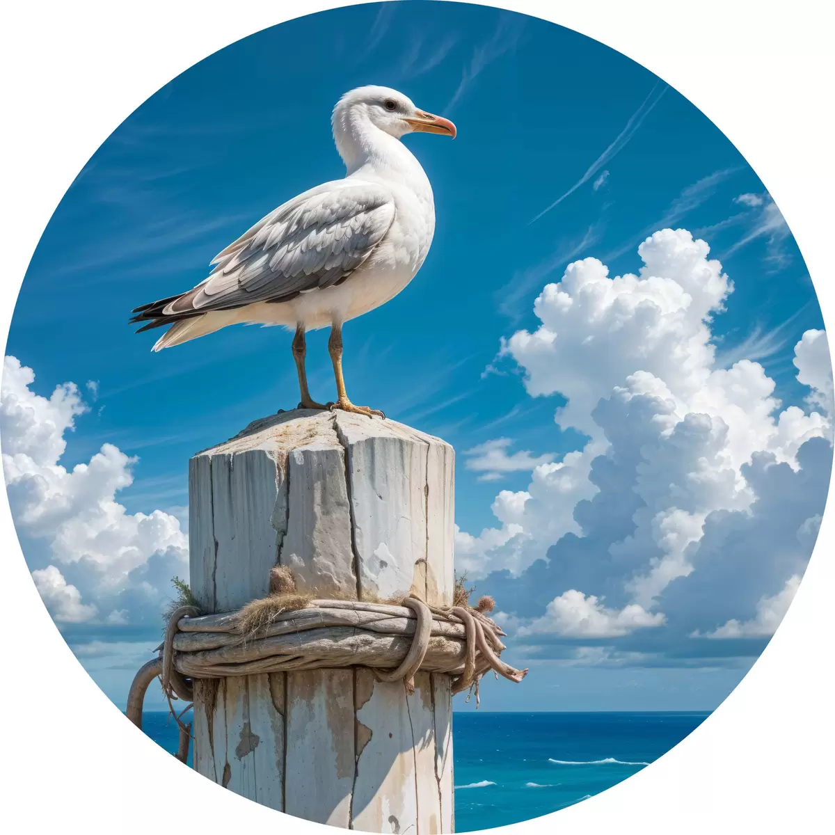 Nuotrauka Balta ant medinio stulpo sėdinti jūrinė antis šviesiai mėlyno dangaus ir vandenyno su bangomis fone Nr r40590
