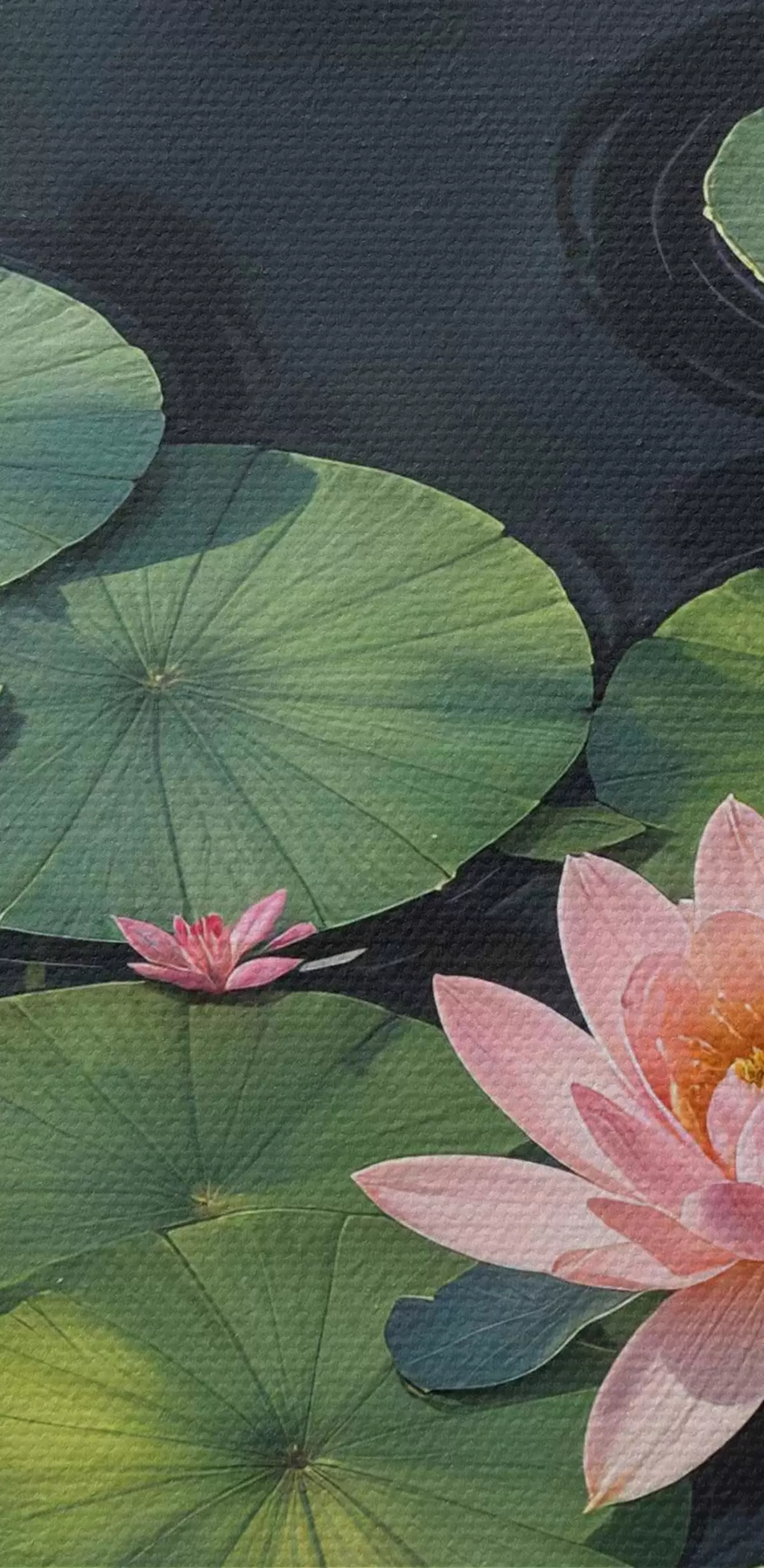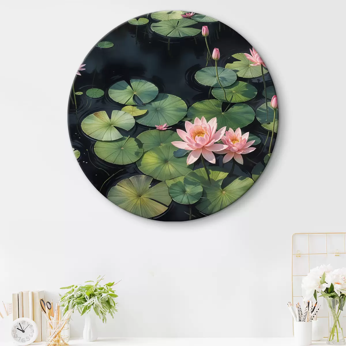 Apvalūs paveikslai Tvenkinys su rausvomis vandens lelijomis ir žaliais lelijų žiedlapiais, plūduriuojančiais paviršiuje, tamsiame fone r40598