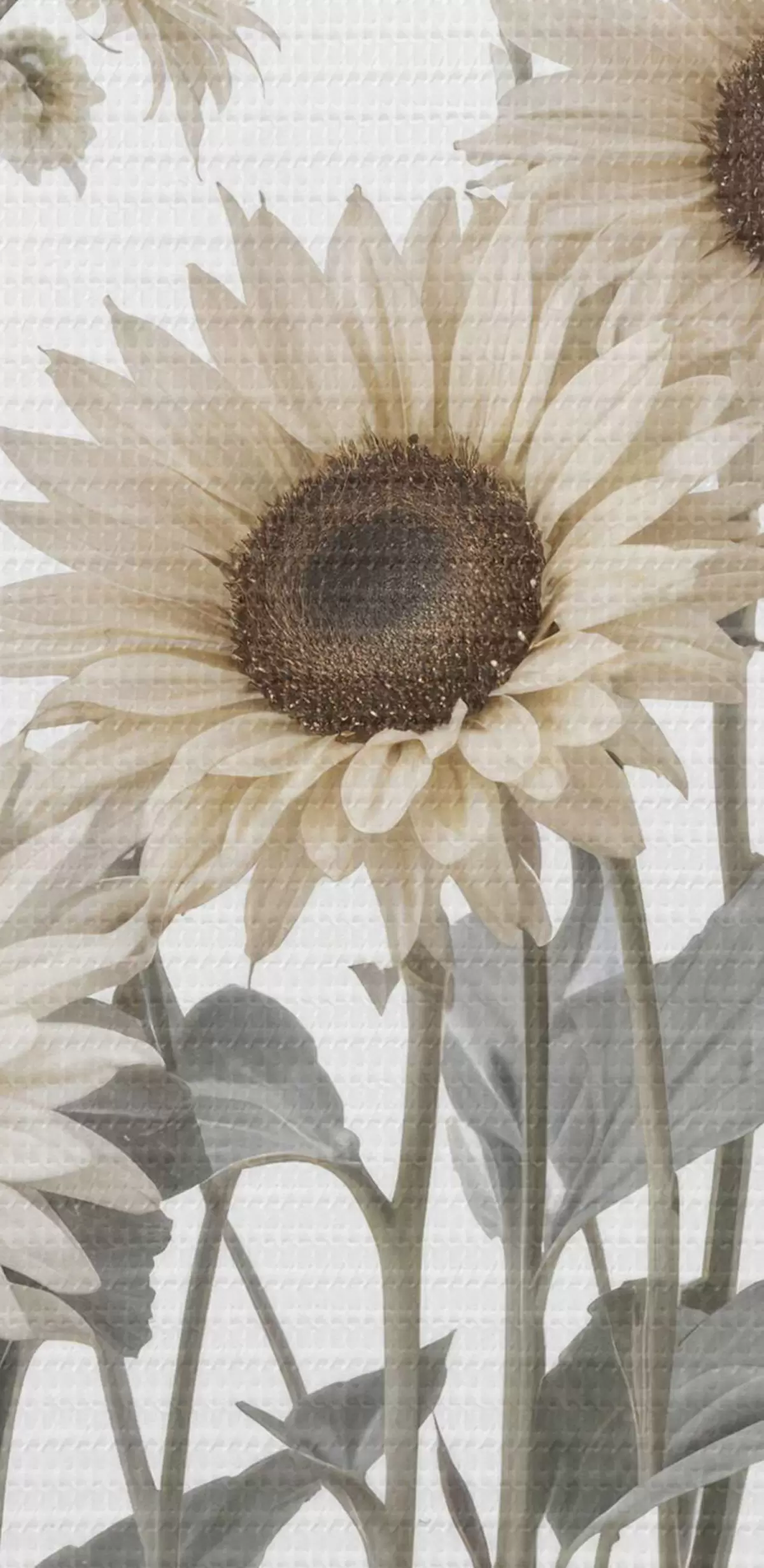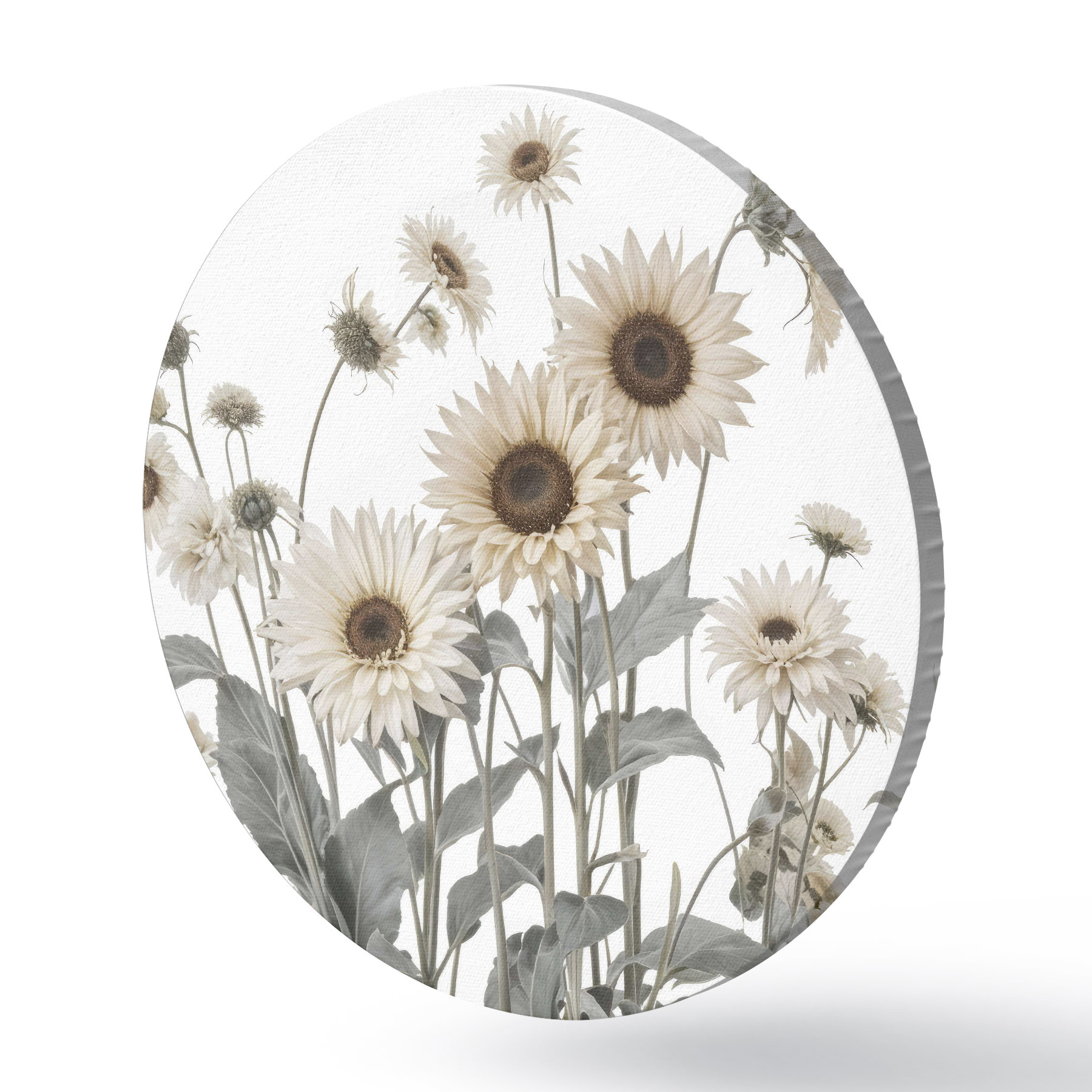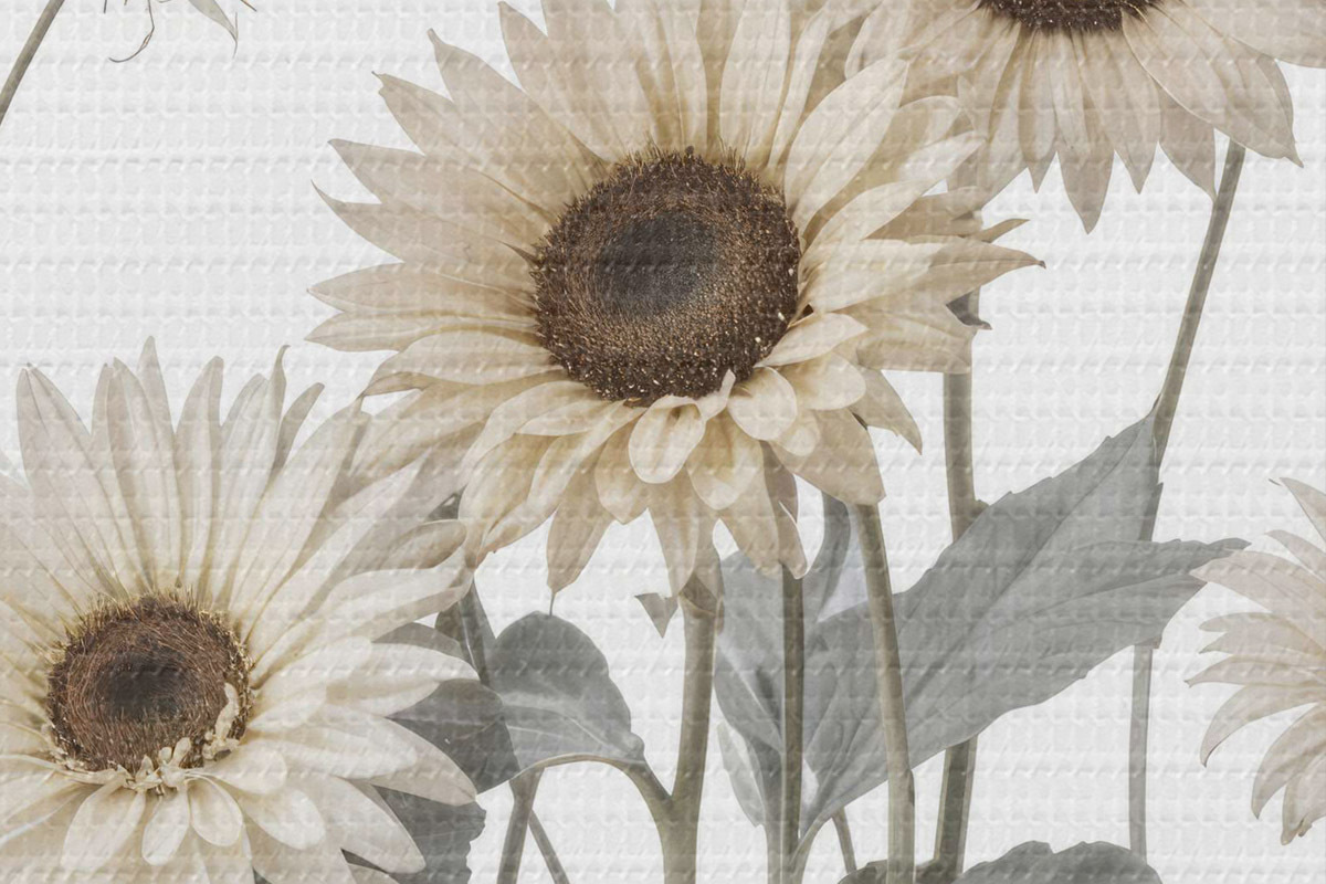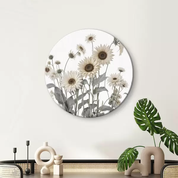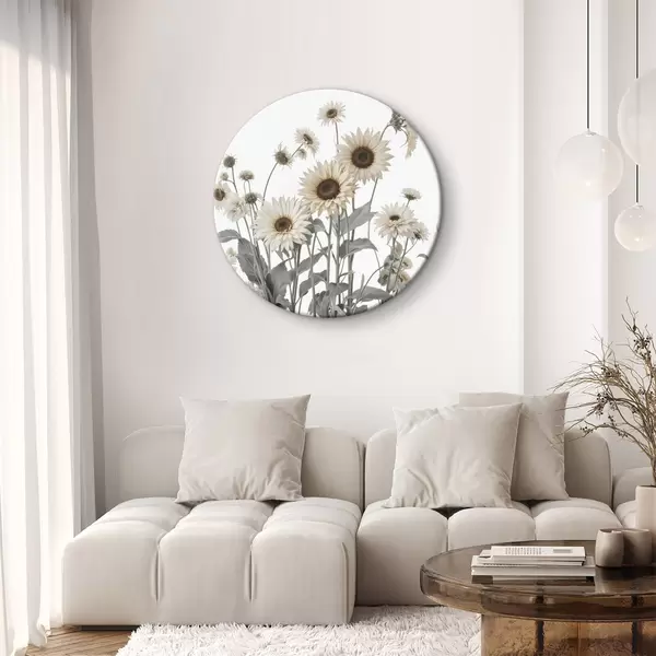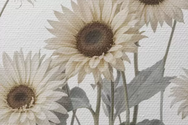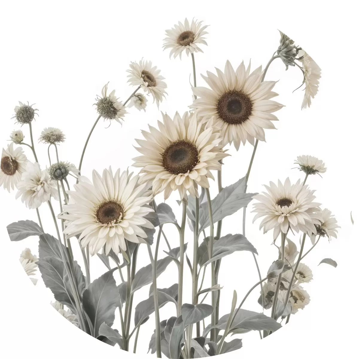 Nuotrauka Baltų margučių žiedų laukas baltame fone, fone matomos saulėgrąžos Nr r40602