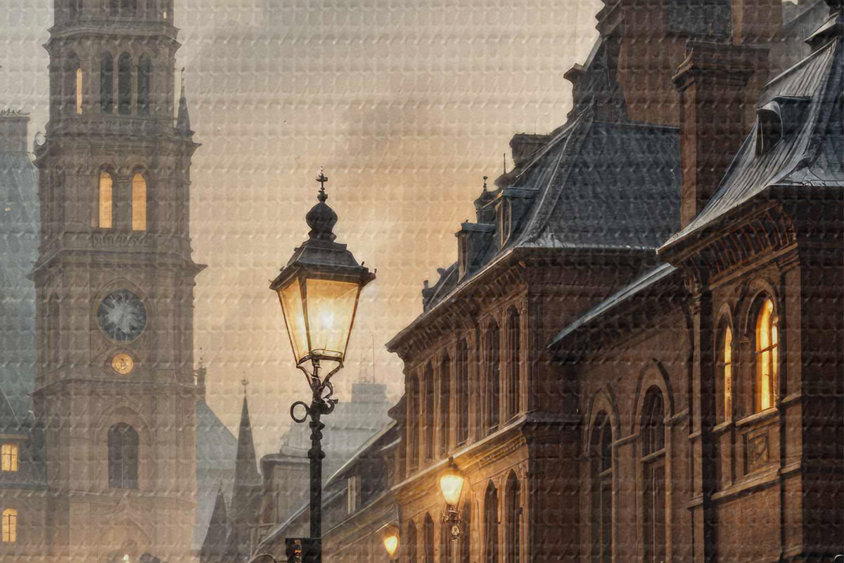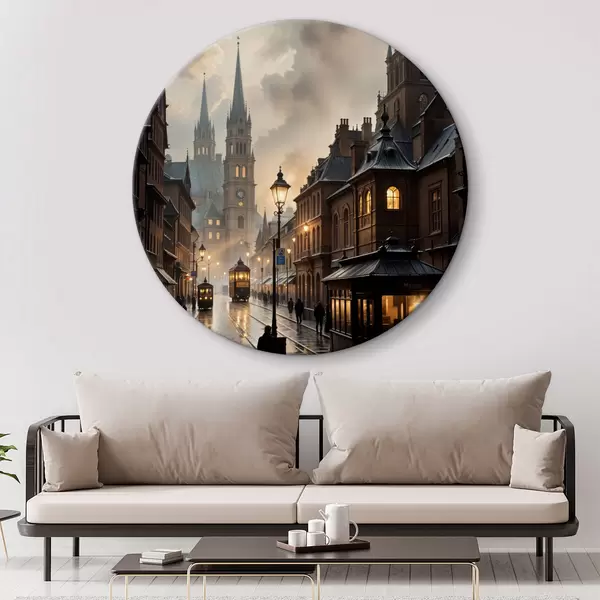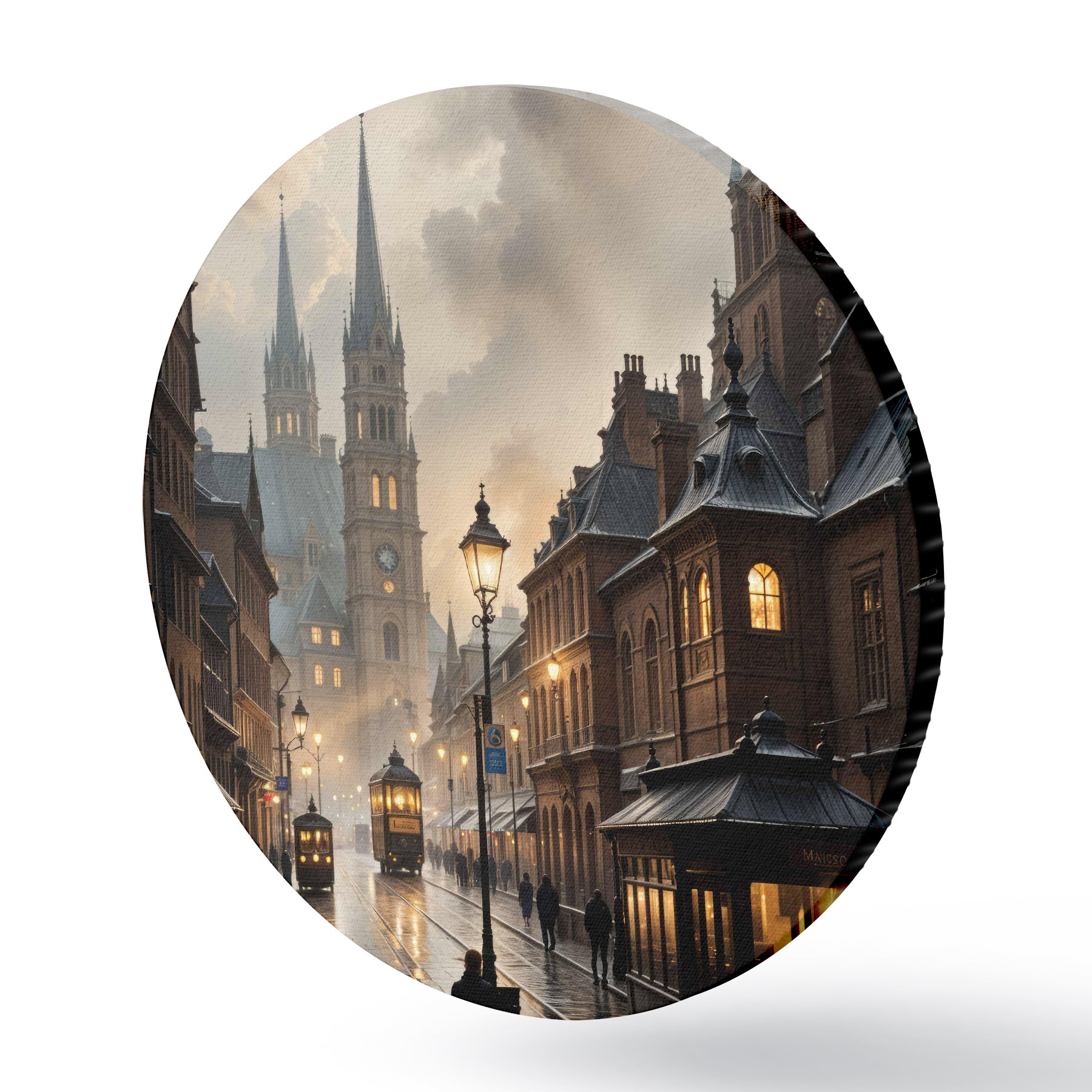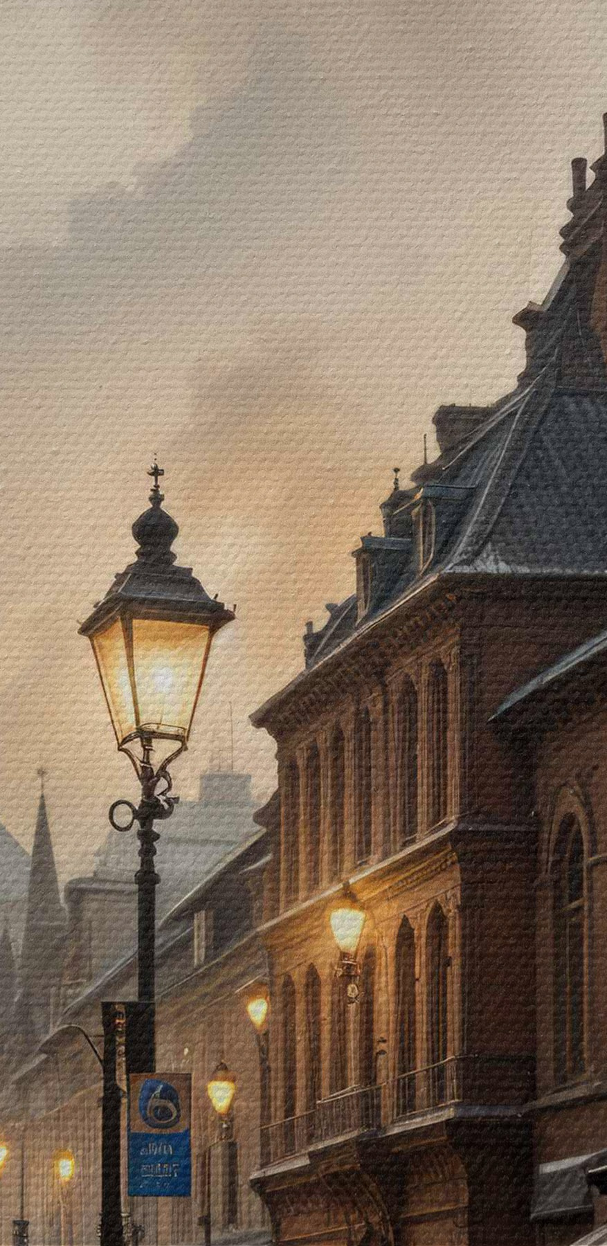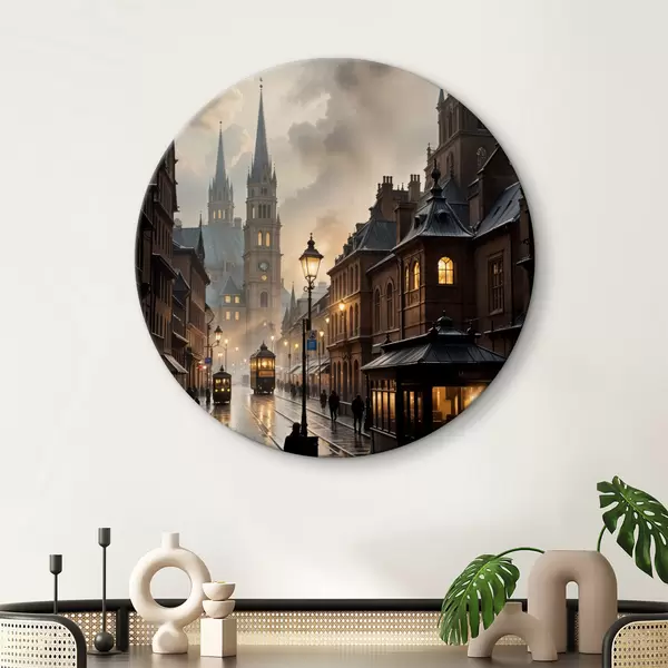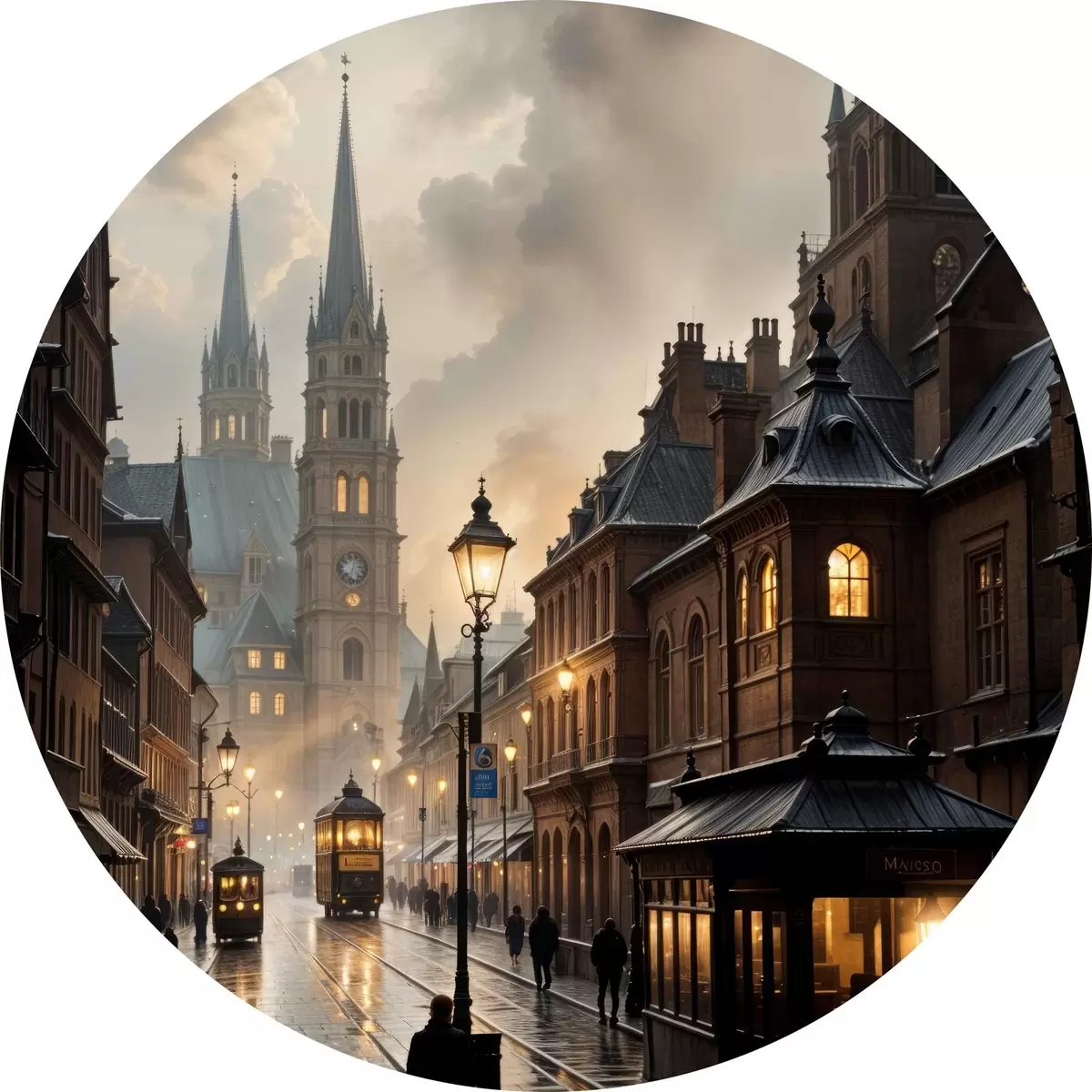 Nuotrauka Lietingas vakaras sename Europos mieste su grindinio gatvėmis, istoriniais pastatais ir pravažiuojančiu tramvajumi Nr r40604