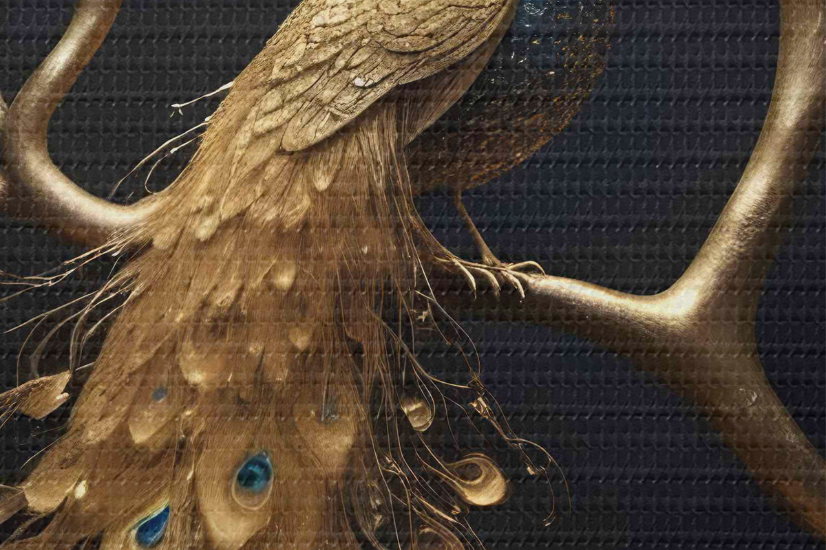 Nuotrauka Ant šakos sėdintis povas ryškiomis plunksnomis tamsiame fone su šviečiančiais medžiais Nr r40612