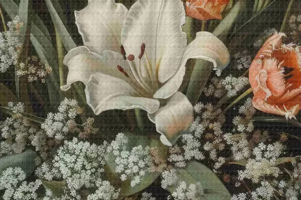 Nuotrauka Ekstravagantiškas barokinis natiurmortas, vaizduojantis vazą su tulpėmis, gvazdikais ir hiacintais, aliejinės tapybos imitacija Nr r40658