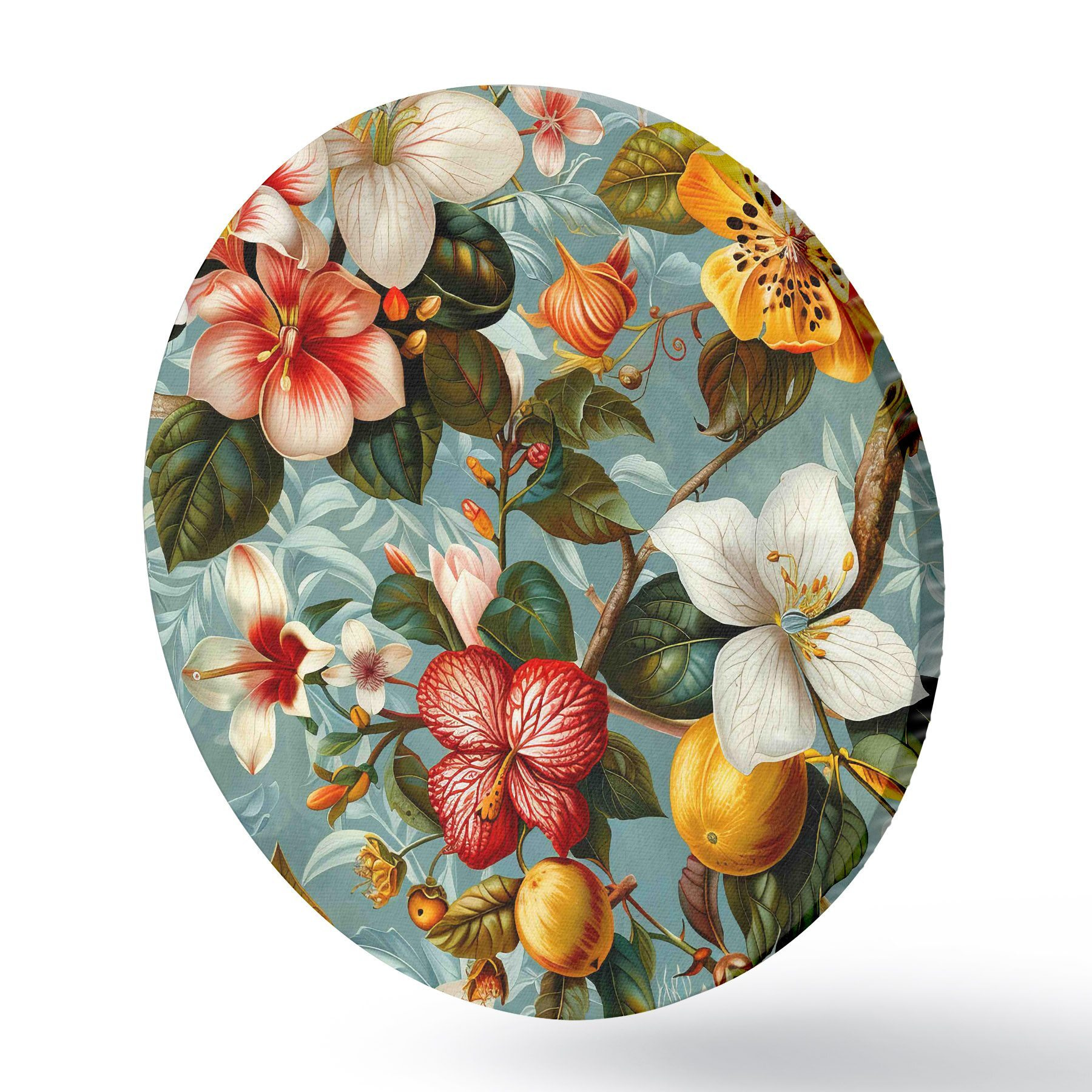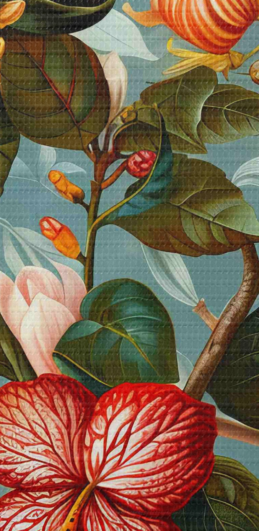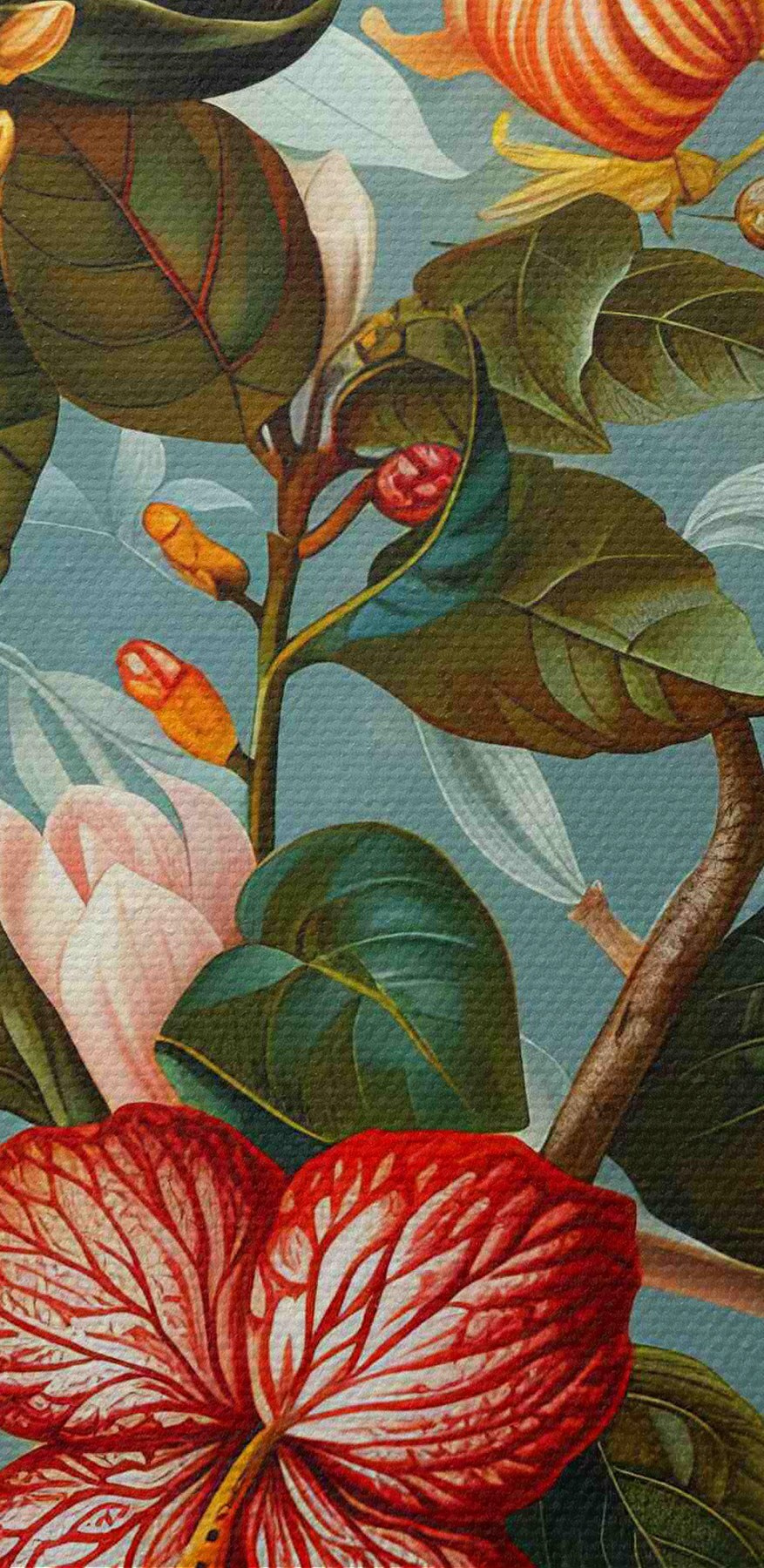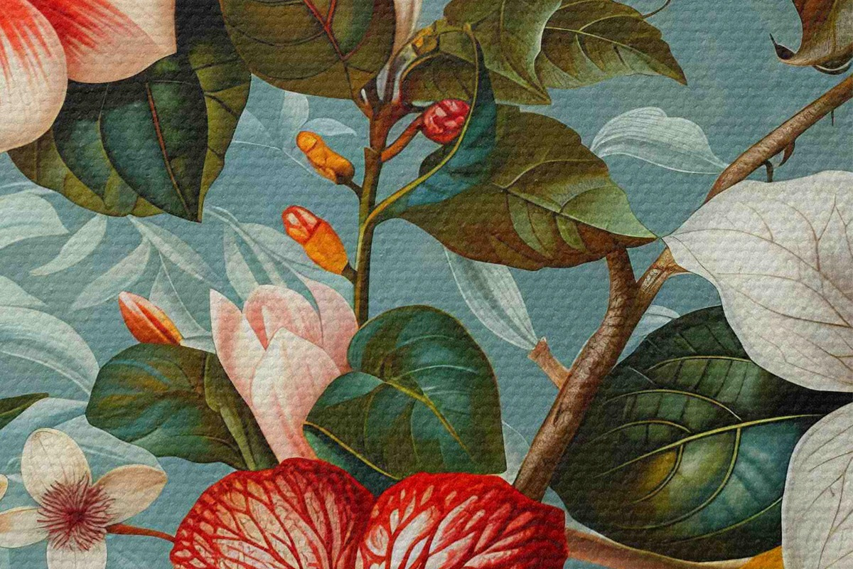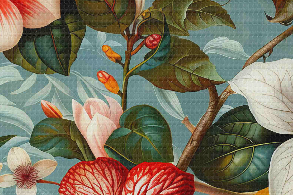 Nuotrauka Kompozicija su įvairia žaluma ir atogrąžų gėlėmis mėlyname fone Nr r40668