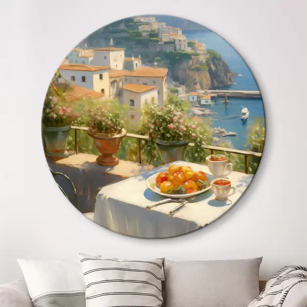 Nuotrauka Apelsinai lėkštėje ant stalo su vaizdu į jūrą ir miestą Nr r40719