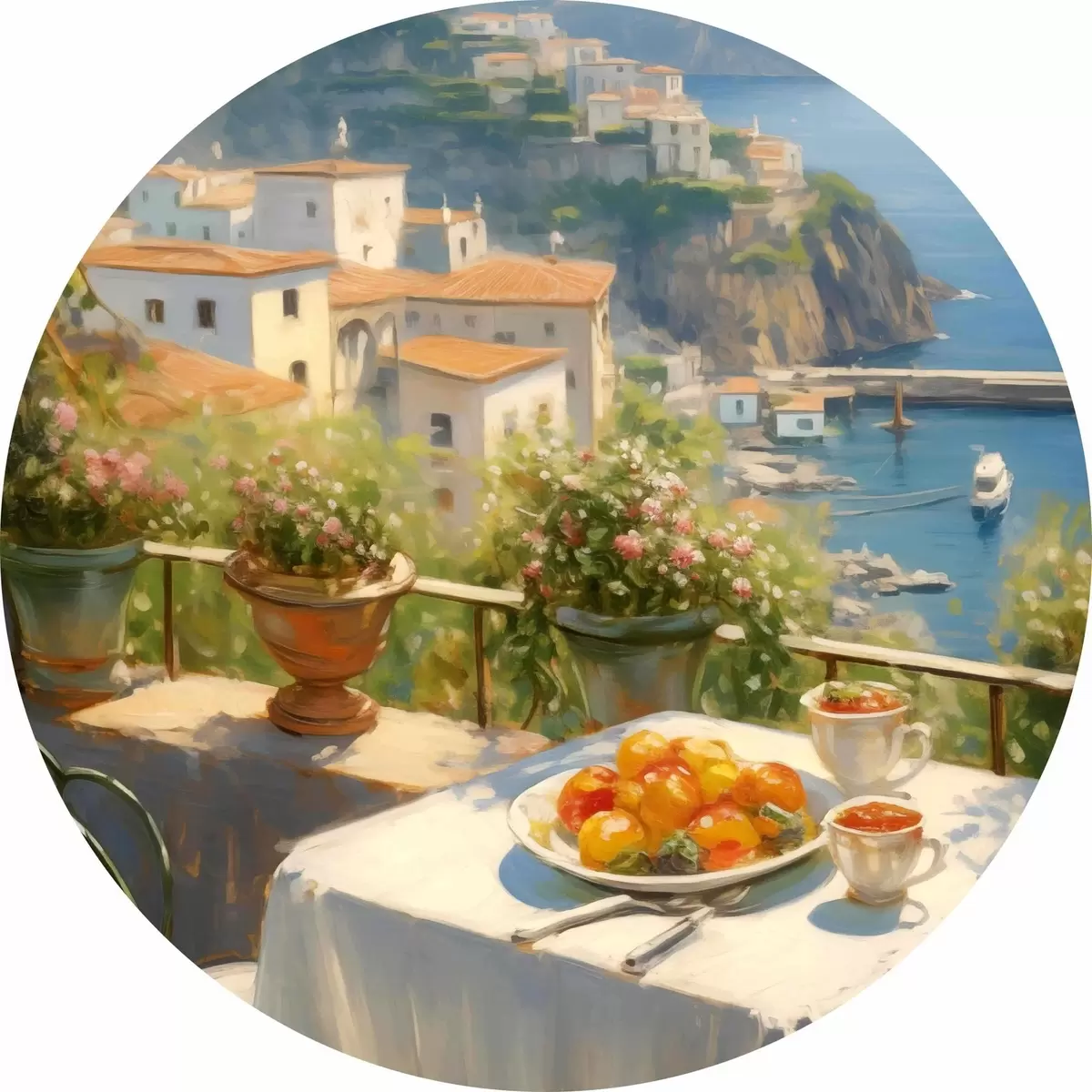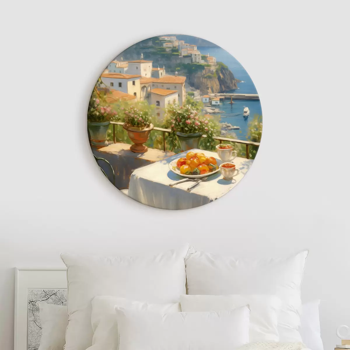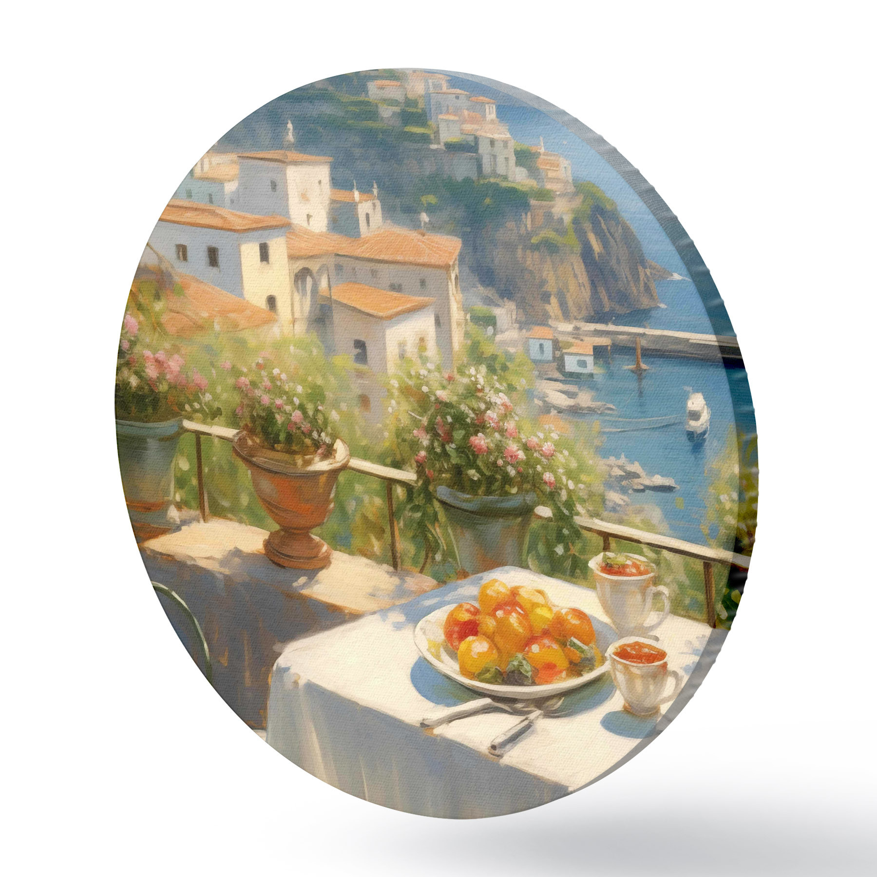 Nuotrauka Apelsinai lėkštėje ant stalo su vaizdu į jūrą ir miestą Nr r40719