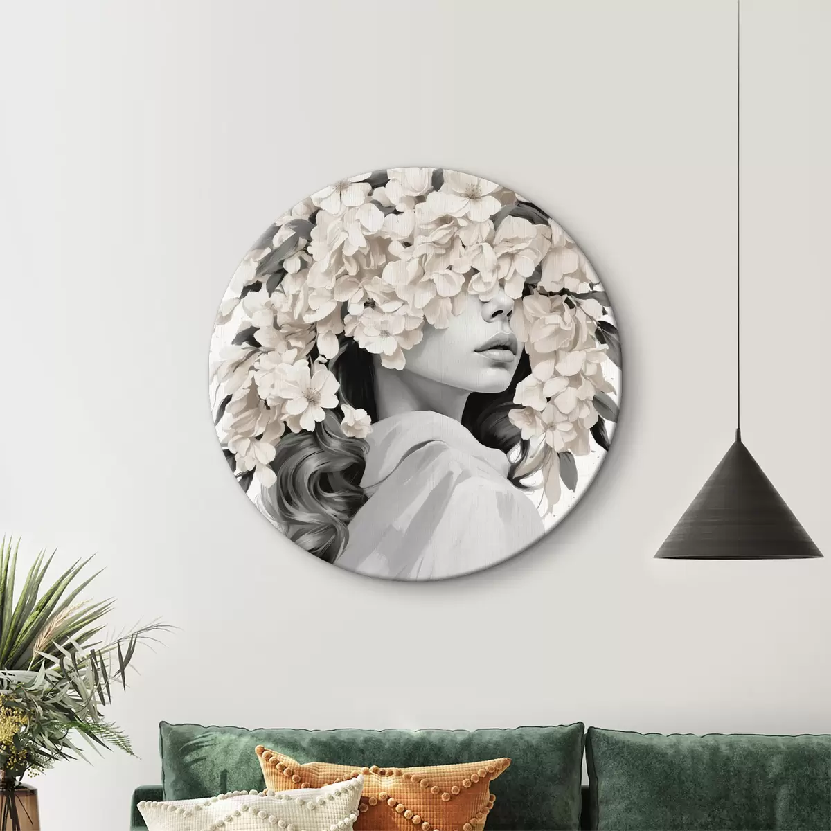 Apvalūs paveikslai Mergaitė su gėlėmis ant veido juodos ir baltos spalvų r40849