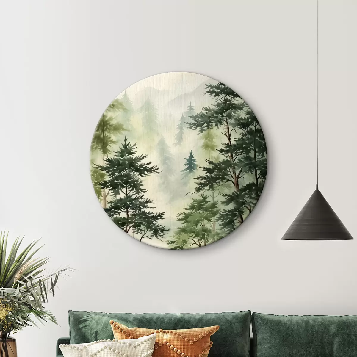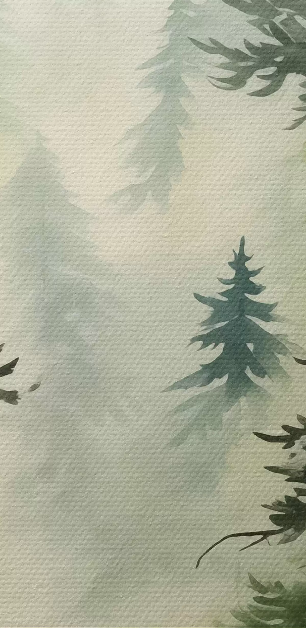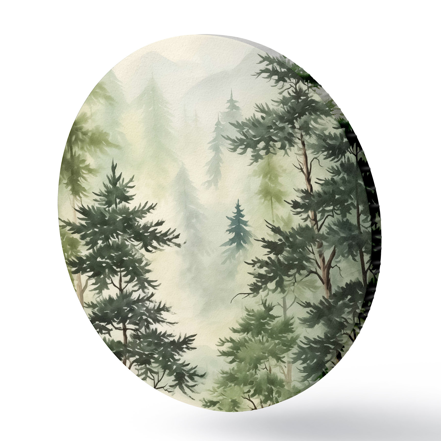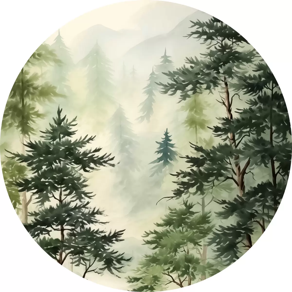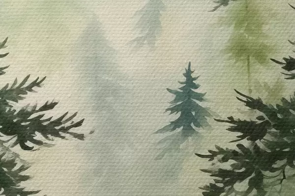 Nuotrauka Eglės miške kalnų fone, akvarelė, žalia spalva Nr r40889