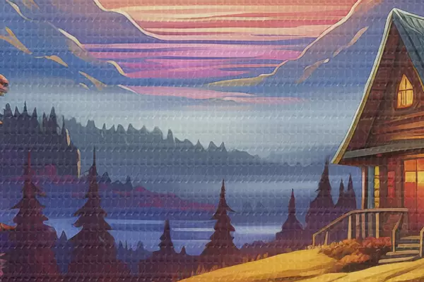 Nuotrauka Įnoringas kraštovaizdis su kalnais ir mediniu namu Nr r40940