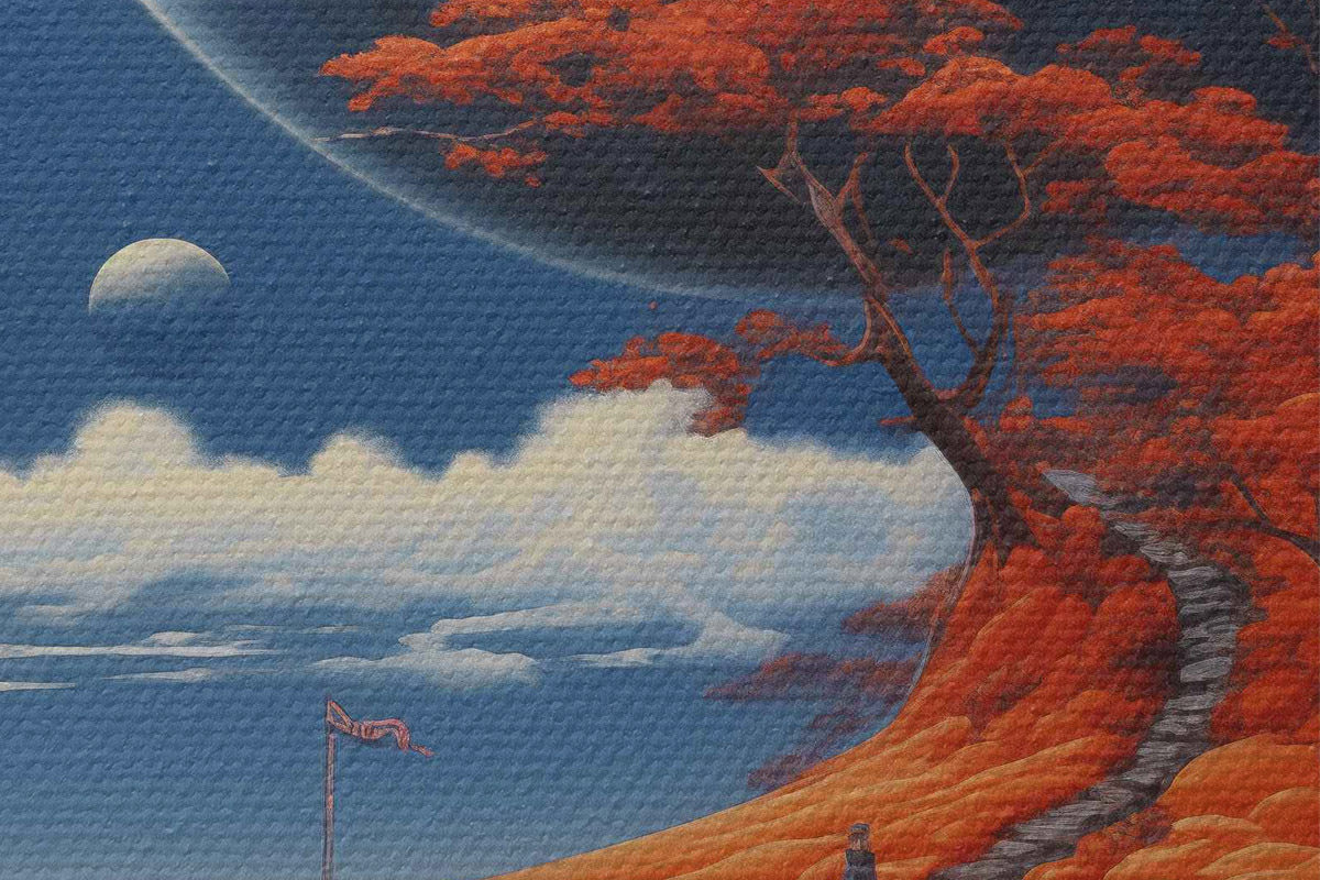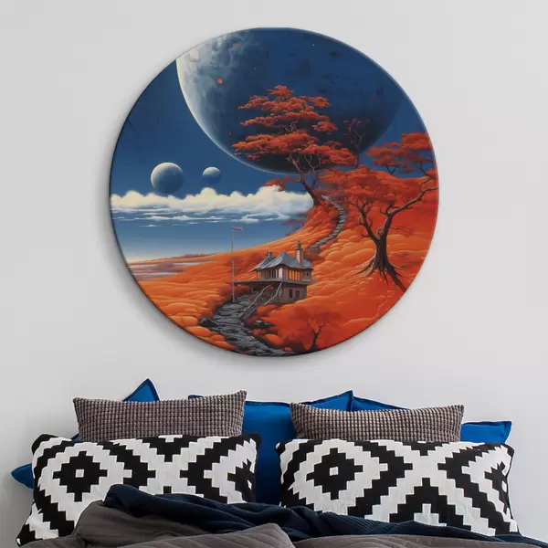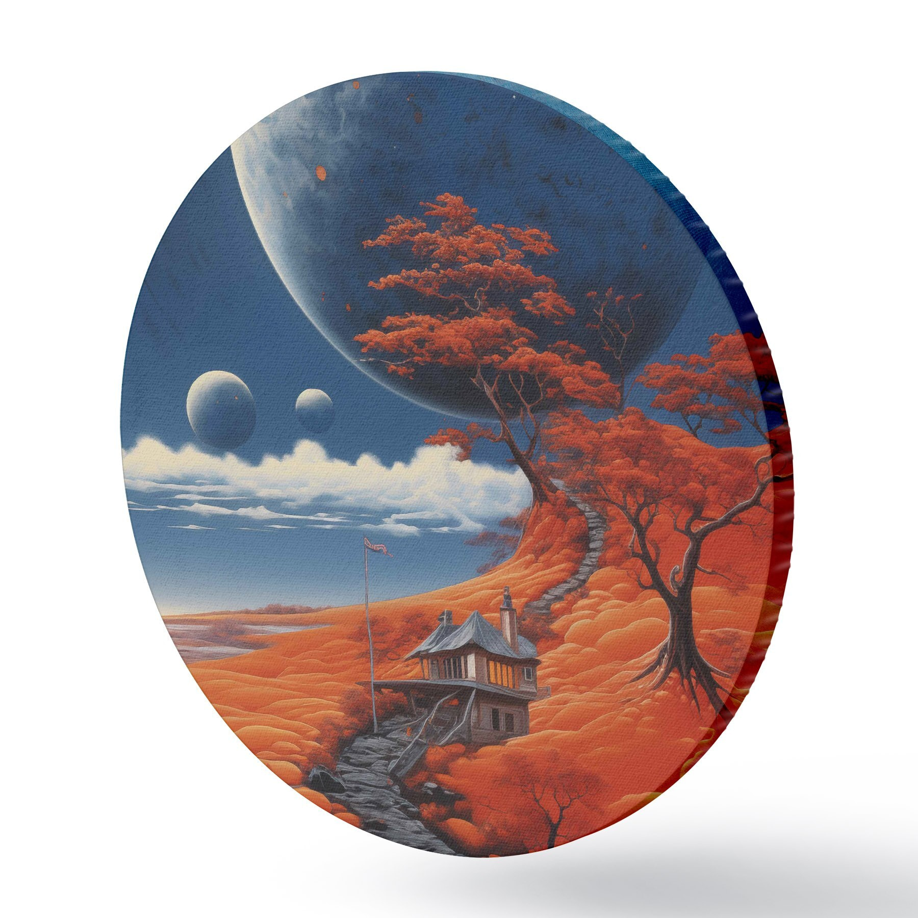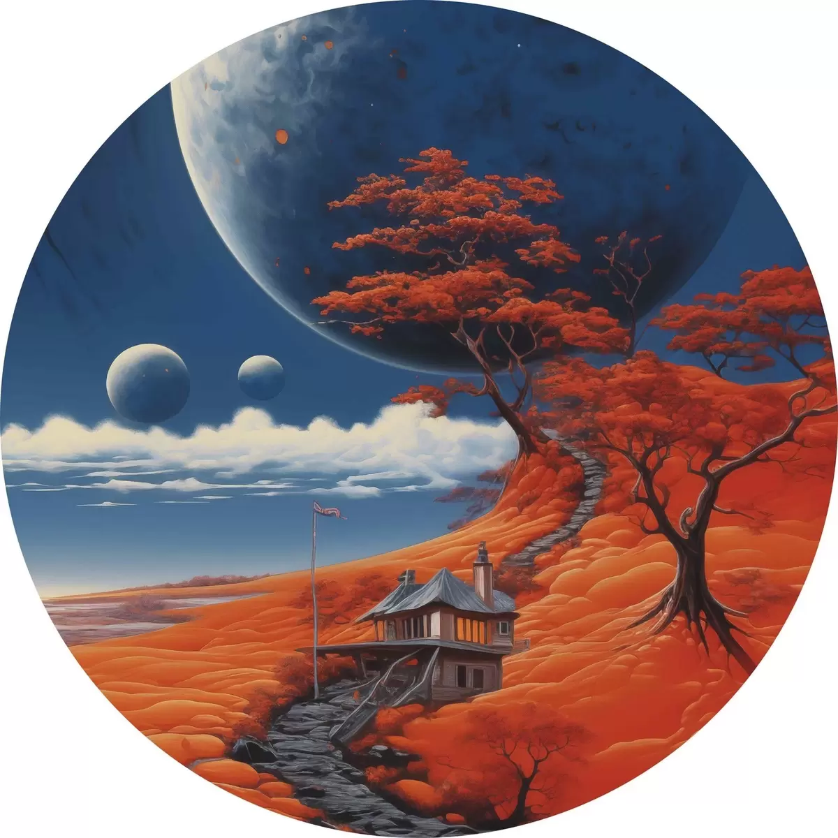 Nuotrauka Kosmoso iliustracija, planetos, mėlynas dangus, namas ant kalvos, medžiai Nr r40946