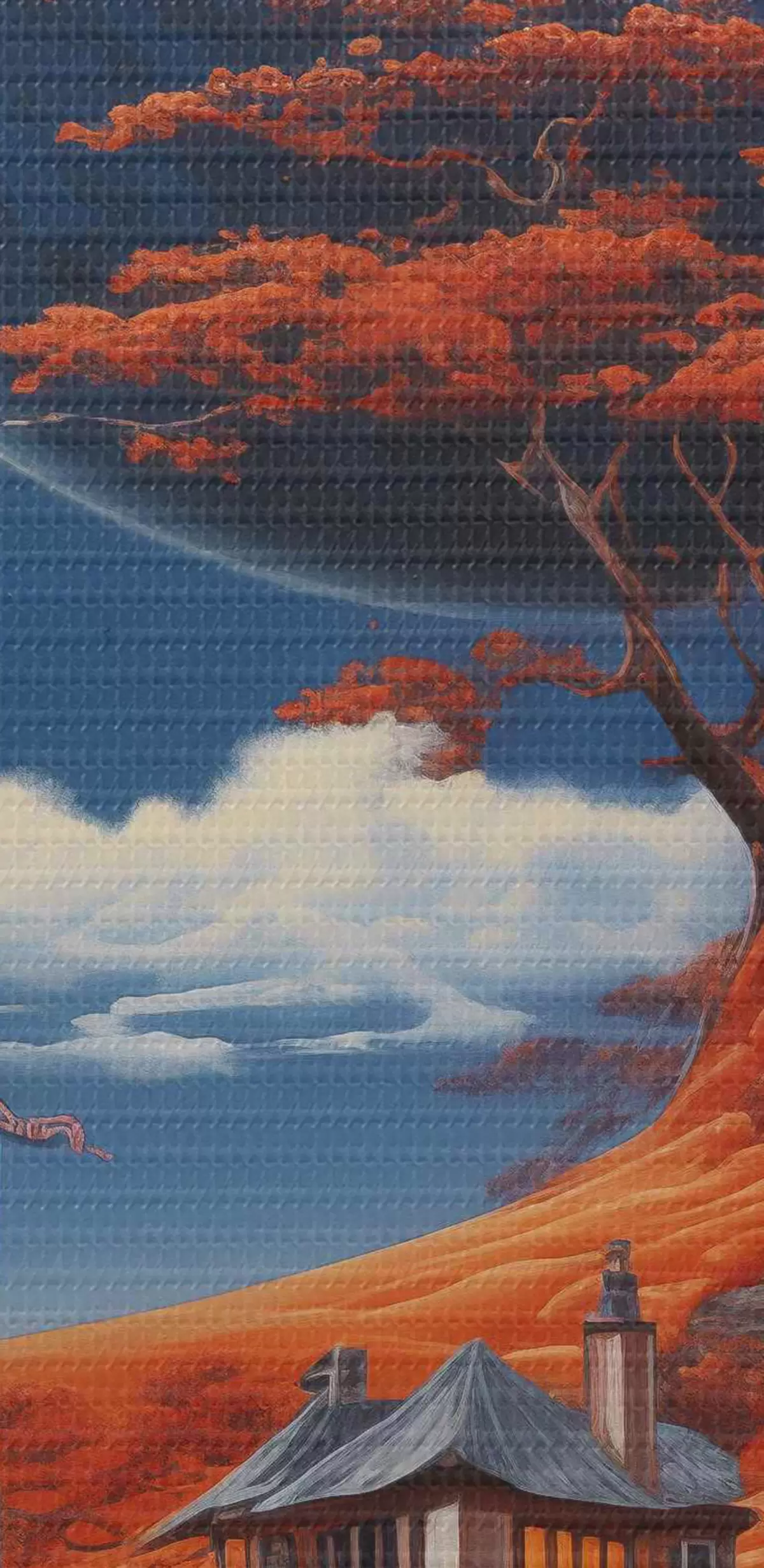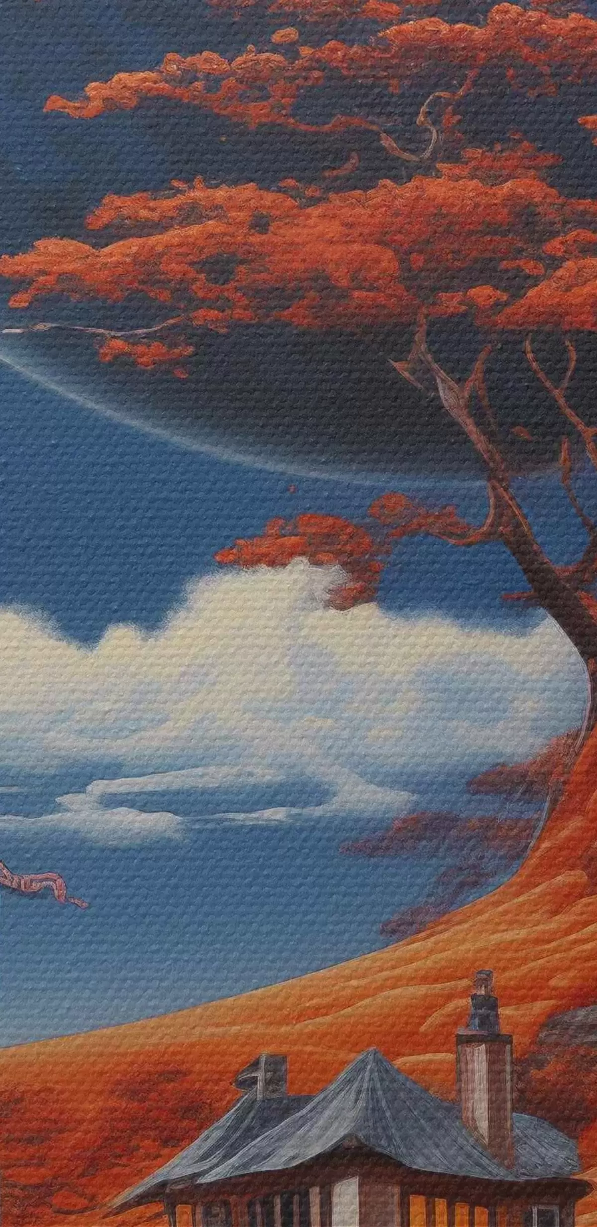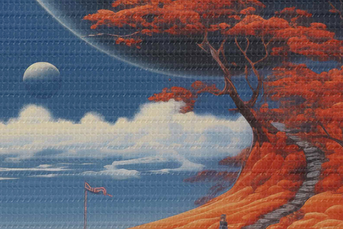 Nuotrauka Kosmoso iliustracija, planetos, mėlynas dangus, namas ant kalvos, medžiai Nr r40946