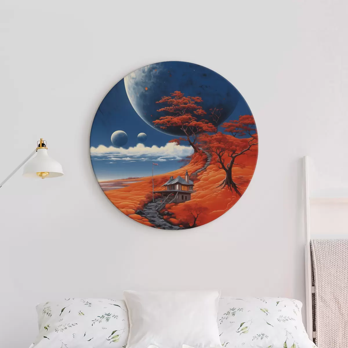 Apvalūs paveikslai Kosmoso iliustracija, planetos, mėlynas dangus, namas ant kalvos, medžiai r40946