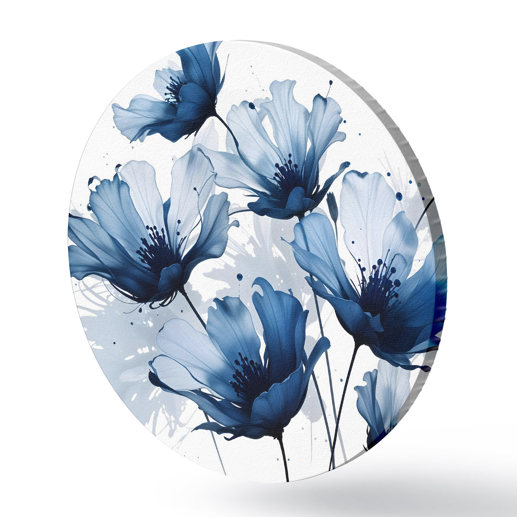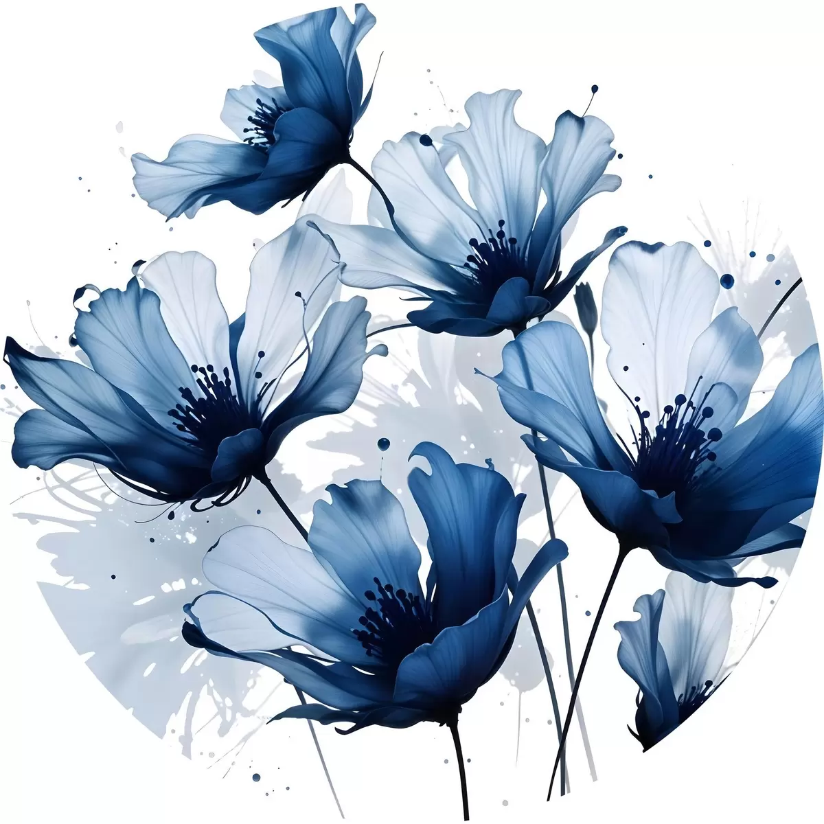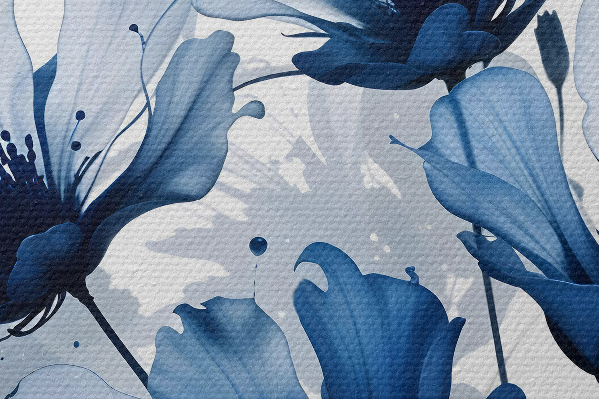 Nuotrauka Abstrakčios didelės mėlynos ir baltos gėlės su minkštais neryškiais žiedlapiais baltame fone Nr r41082