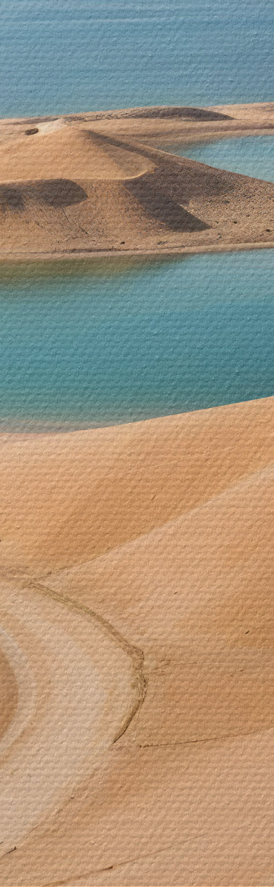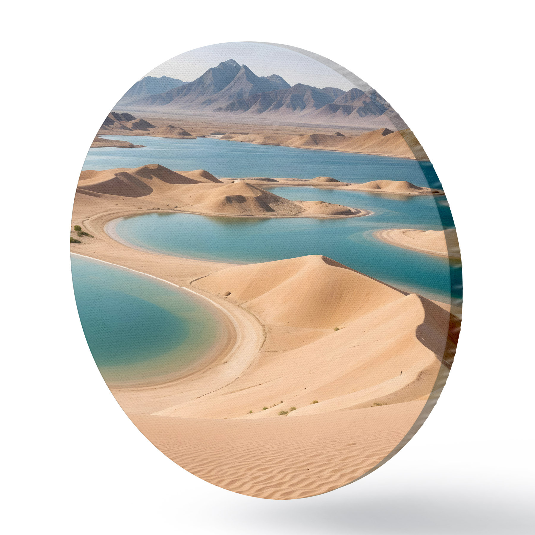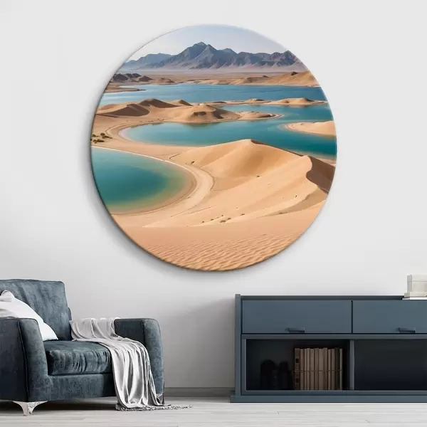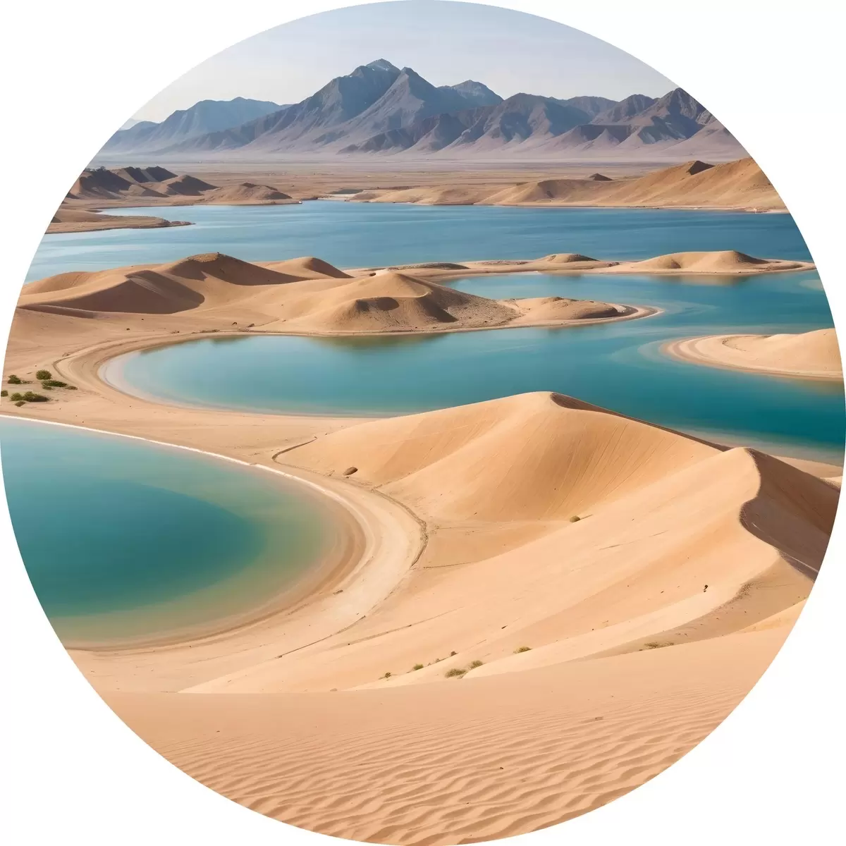 Nuotrauka Didžiulis dykumos kraštovaizdis su banguojančiomis kopomis ir turkio spalvos ežerais, apsuptas raižytų kalnų Nr r41087