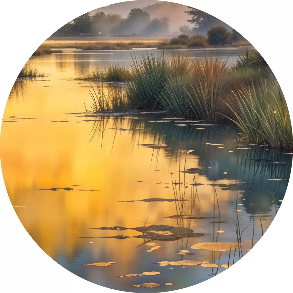 Nuotrauka Ramus ežeras, apsuptas pušų, saulėlydžio metu, su rūku ir ramiu vandeniu Nr r41088