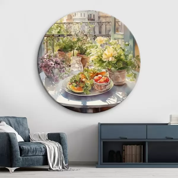 Apvalūs paveikslai Romantiška vakarienė su vaizdu į miestą, akvarelė, gėlės r41168