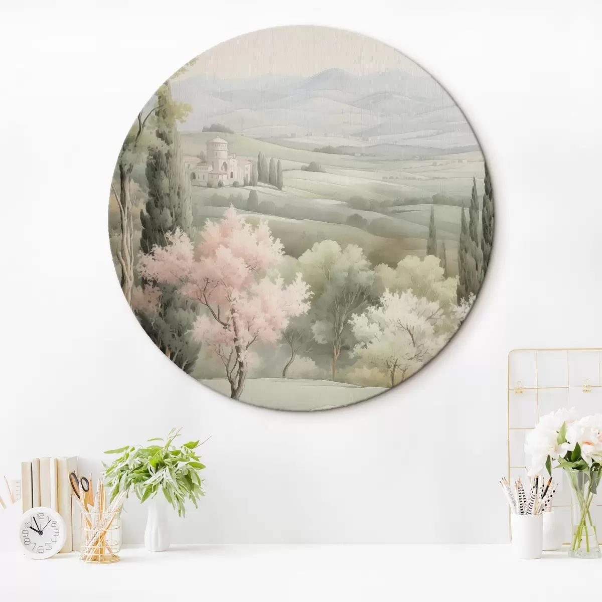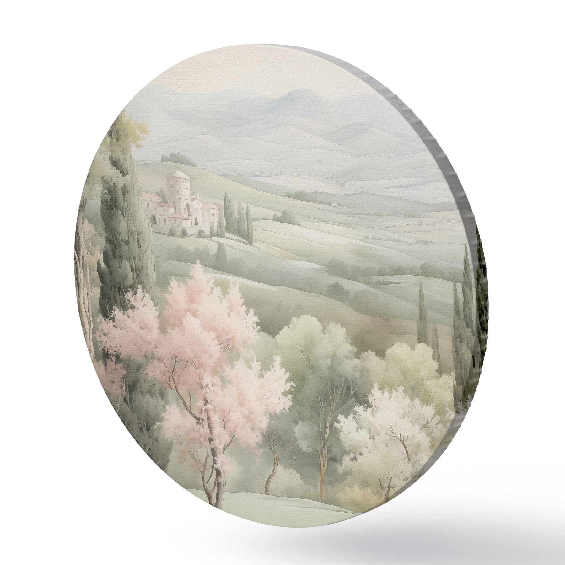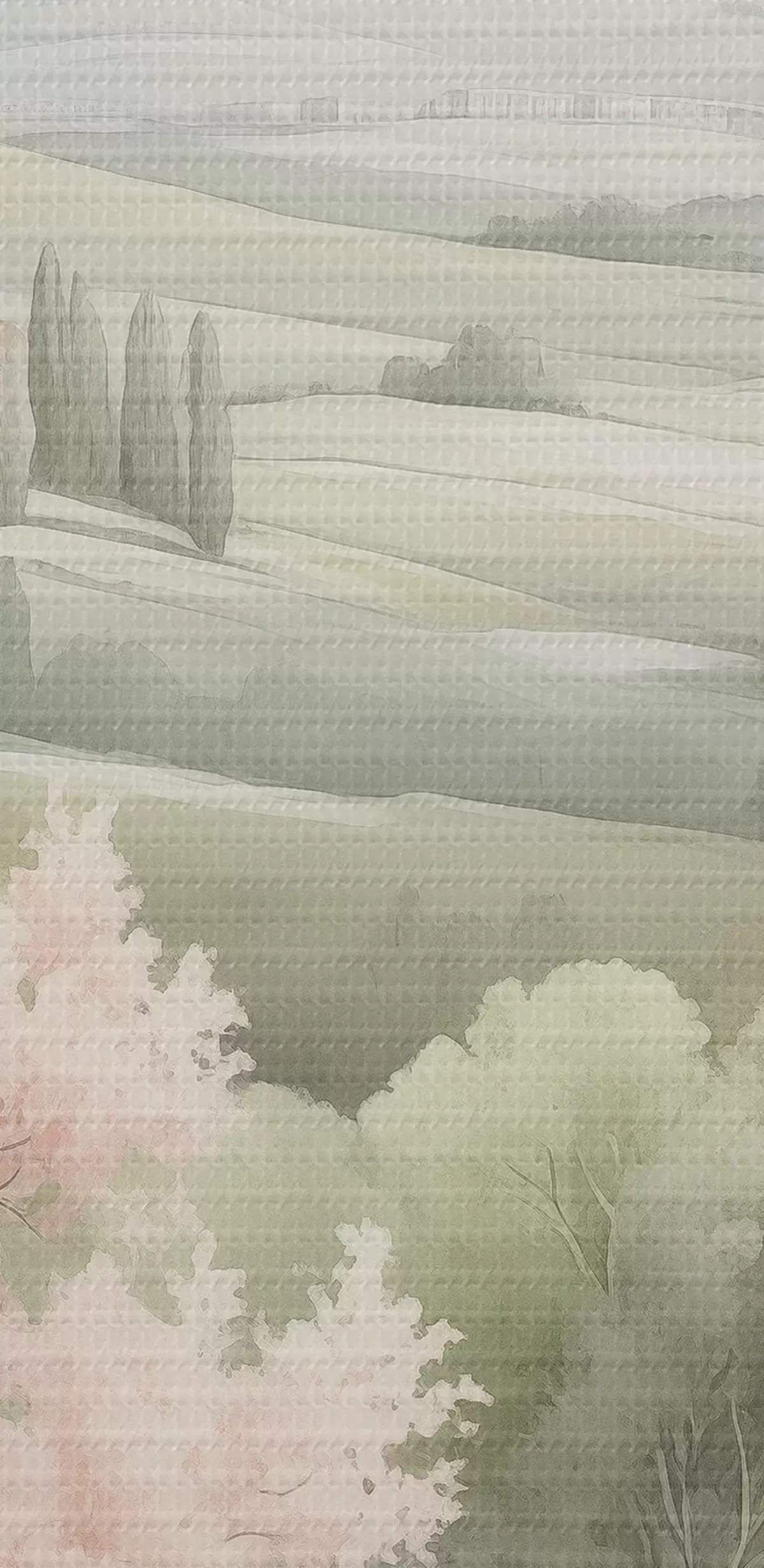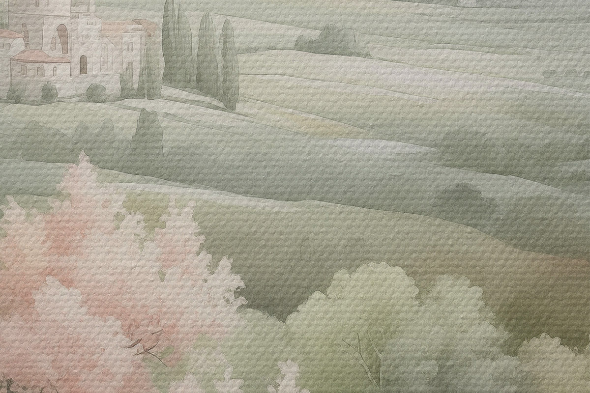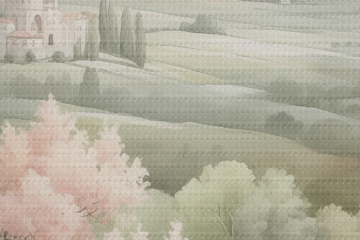Nuotrauka Akvarelė gamta, subtilios spalvos, rožės, medžiai, žalios kalvos Nr r41223
