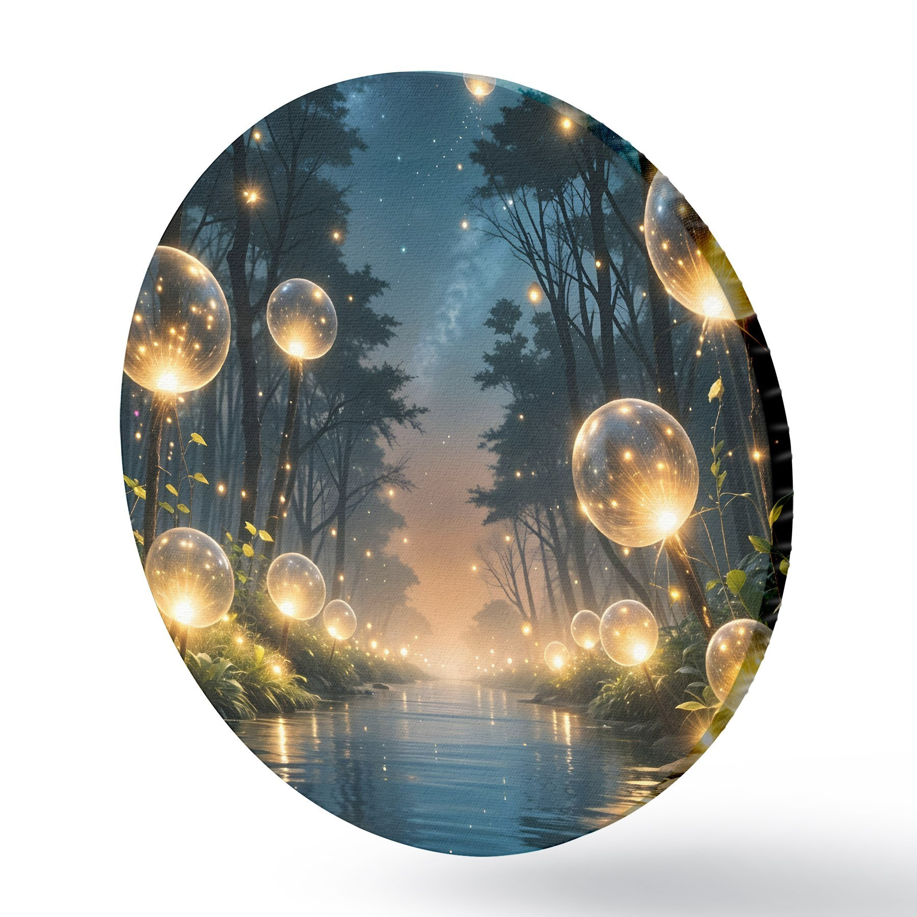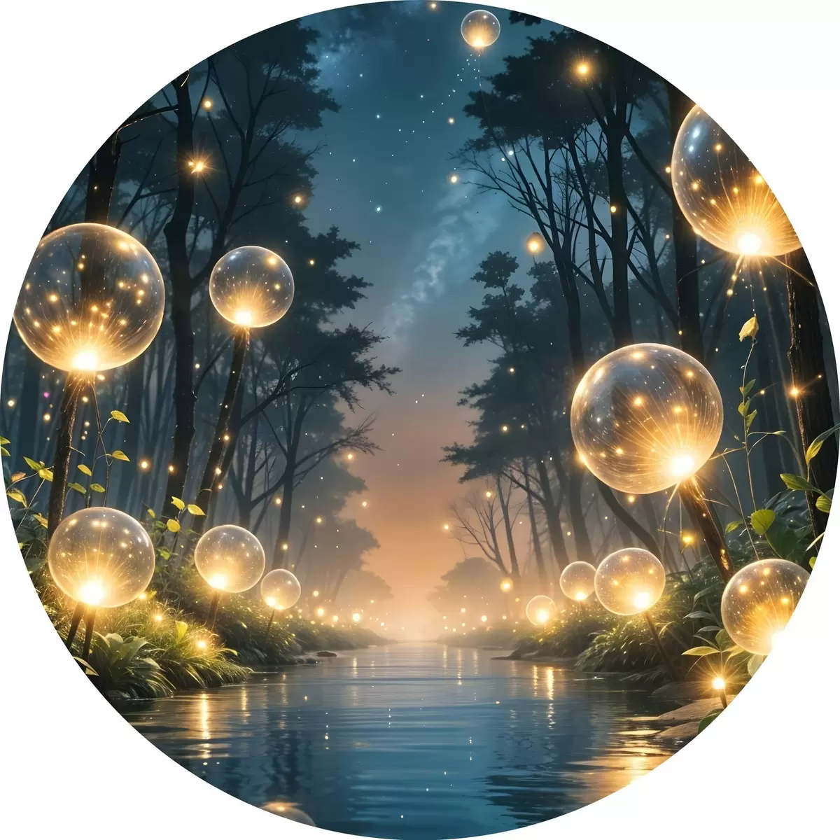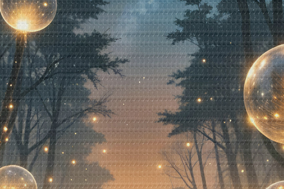Nuotrauka Magiškas naktinis miškas, kuriame tarp medžių plaukioja geltoni rutuliukai ir švieselės, sukuriančios nuotaikingą atmosferą Nr r41259